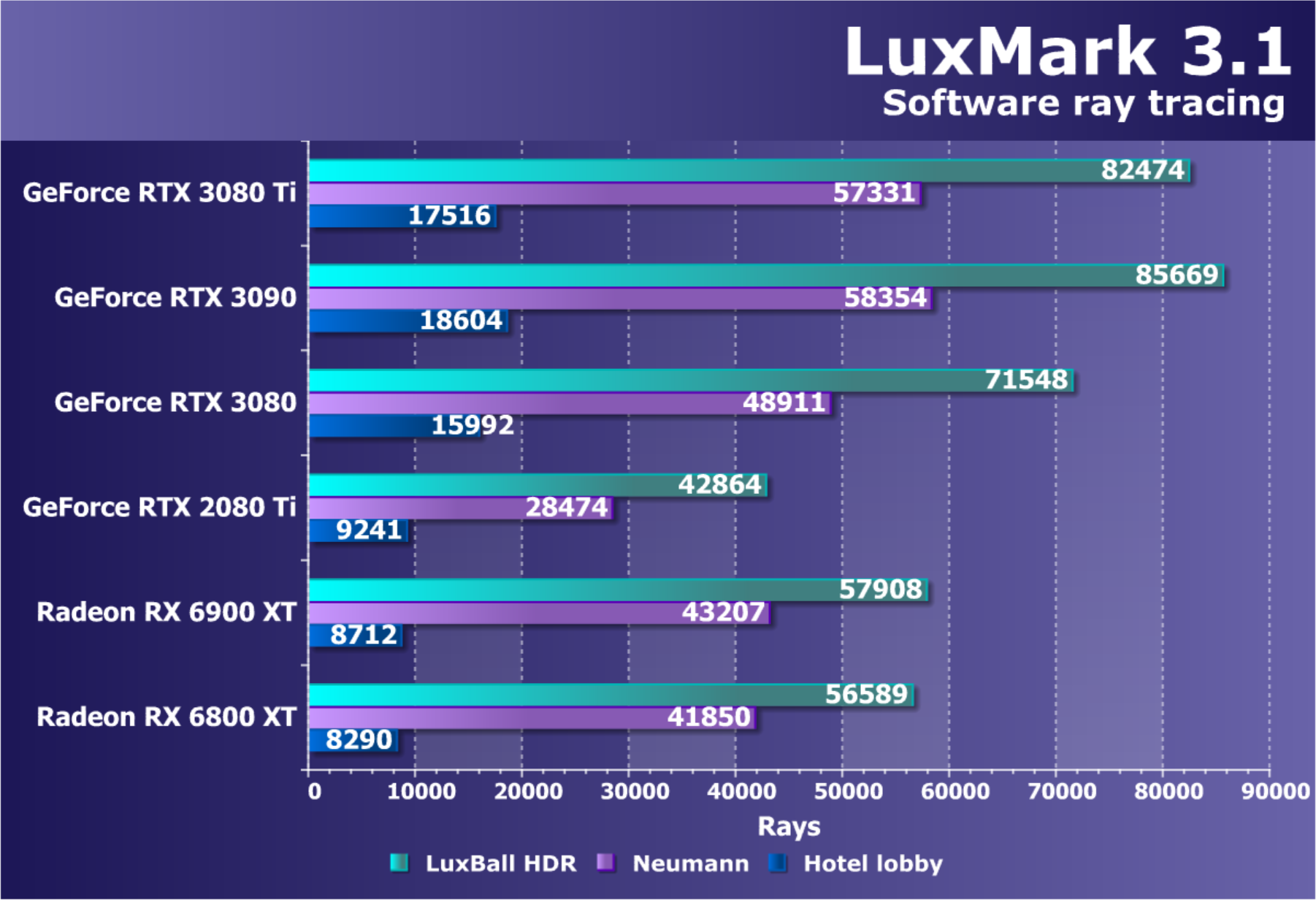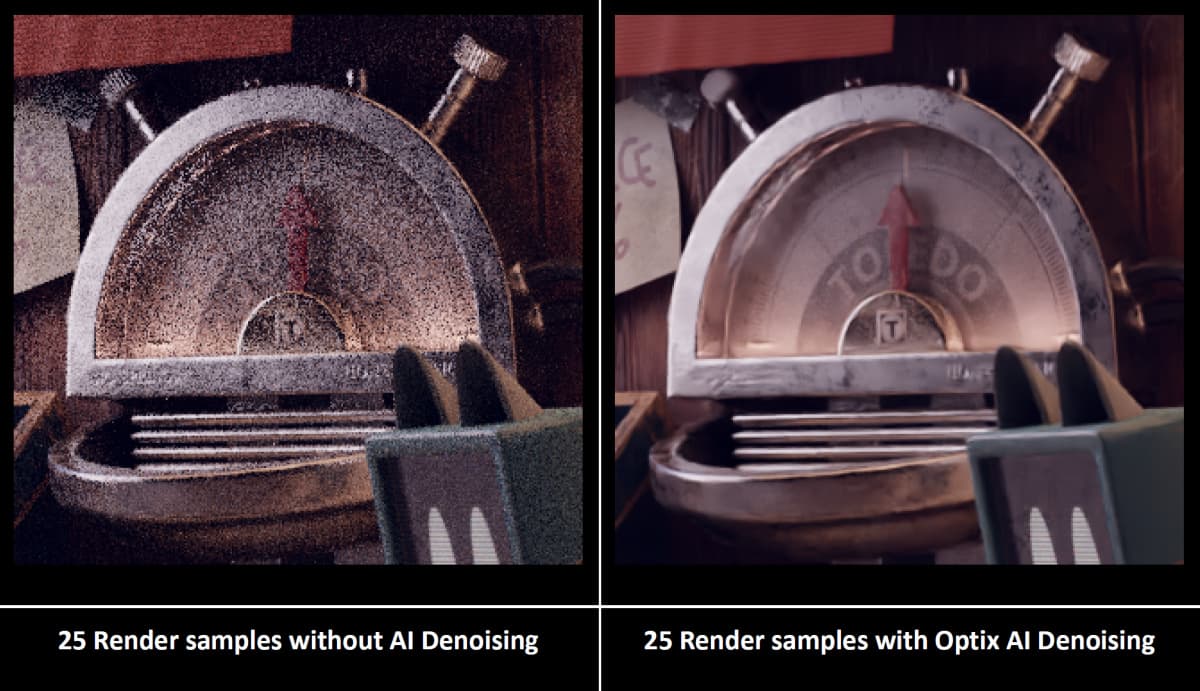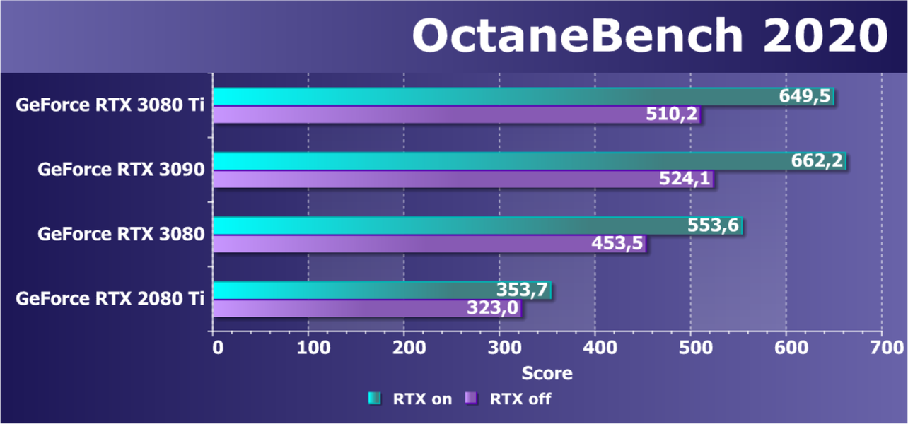 Также новый GPU до двух раз быстрее RTX 2080 Ti в трассировке лучей, а сочетание работы RT-ядер и тензорных ядер обеспечивает еще большее качество картинки при помощи эффективного шумоподавления Optix AI Denoising, использующего искусственный интеллект. Такой шумодав поддерживается в приложениях: Autodesk Arnold, REDSHIFT, Chaos V-ray, OTOY OctaneRender и Blender Cycles. Все это позволяет получить на RTX 3080 Ti очень быстрый рендеринг сцен при предпросмотре и в рабочей среде 3D-приложений, что увеличивает удобство работы и ускоряет весь процесс.