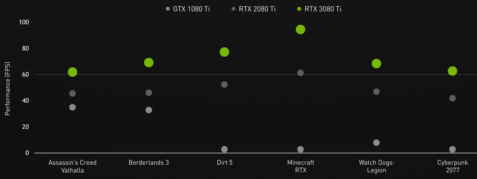 GPU поддерживает все технологии компании, и модель RTX 3080 Ti ничем не отличается от RTX 3090 по возможностям. GeForce RTX 3080 Ti выглядит интересным топовым вариантом, явно более выгодным, по сравнению с самой мощной видеокартой. И если цены на новинку не будут слишком завышены, то это — отличный вариант апгрейда для всех обладателей топовых решений, вроде GTX 1080 Ti и RTX 2080 Ti. GeForce RTX 3080 Ti является бескомпромиссным решением, которое позволяет не отказывать в установке максимально возможных настроек и высокого разрешения, включая аппаратную трассировку лучей. Результаты тестов в 4K-разрешении и максимальных настройках на диаграмме показывают, что новинка везде обеспечивает не менее 60 FPS, чем не могут похвастать устаревшие GPU.