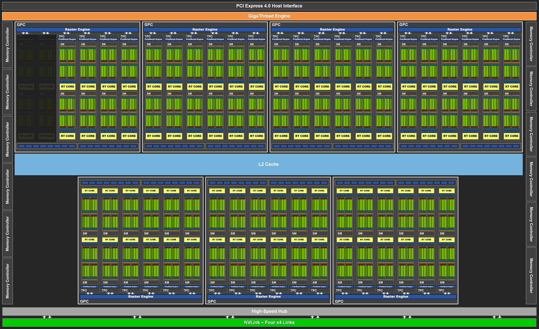 Полный чип GA102, содержит семь кластеров GPC и 84 мультипроцессора SM — по 12 штук на каждый кластер. Каждый GPC содержит по шесть кластеров TPC, состоящих из пары мультипроцессоров SM, пары RT-ядер и одного движка PolyMorph Engine для работы с геометрией. И всего полная версия графического процессора GA102 содержит 10752 потоковых CUDA-ядра, 84 RT-ядра второго поколения и 336 тензорных ядер третьего поколения.