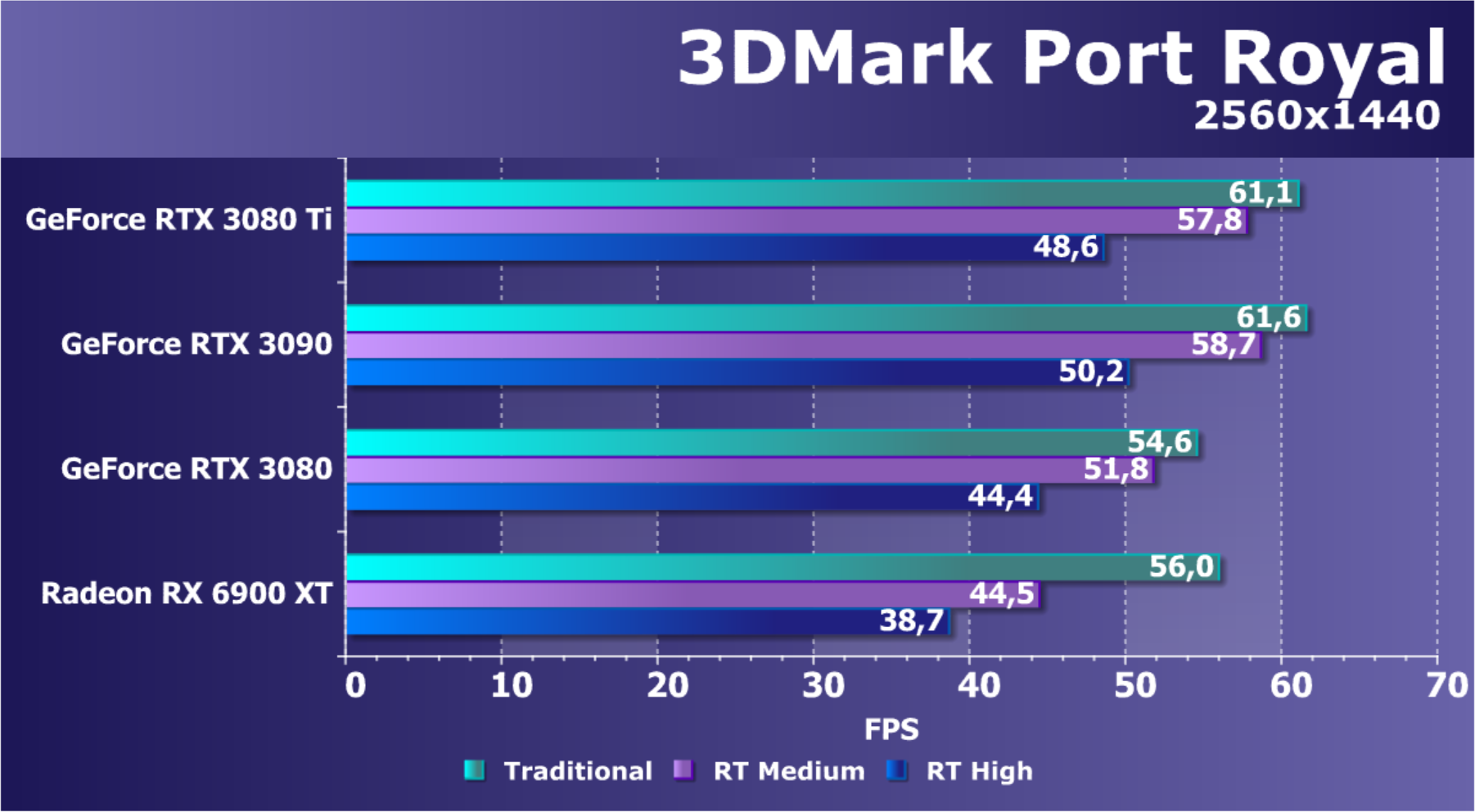 Стандартные результаты тестов без использования аппаратной трассировки лучей в разрешениях 1920×1200, 2560×1440 и 3840×2160