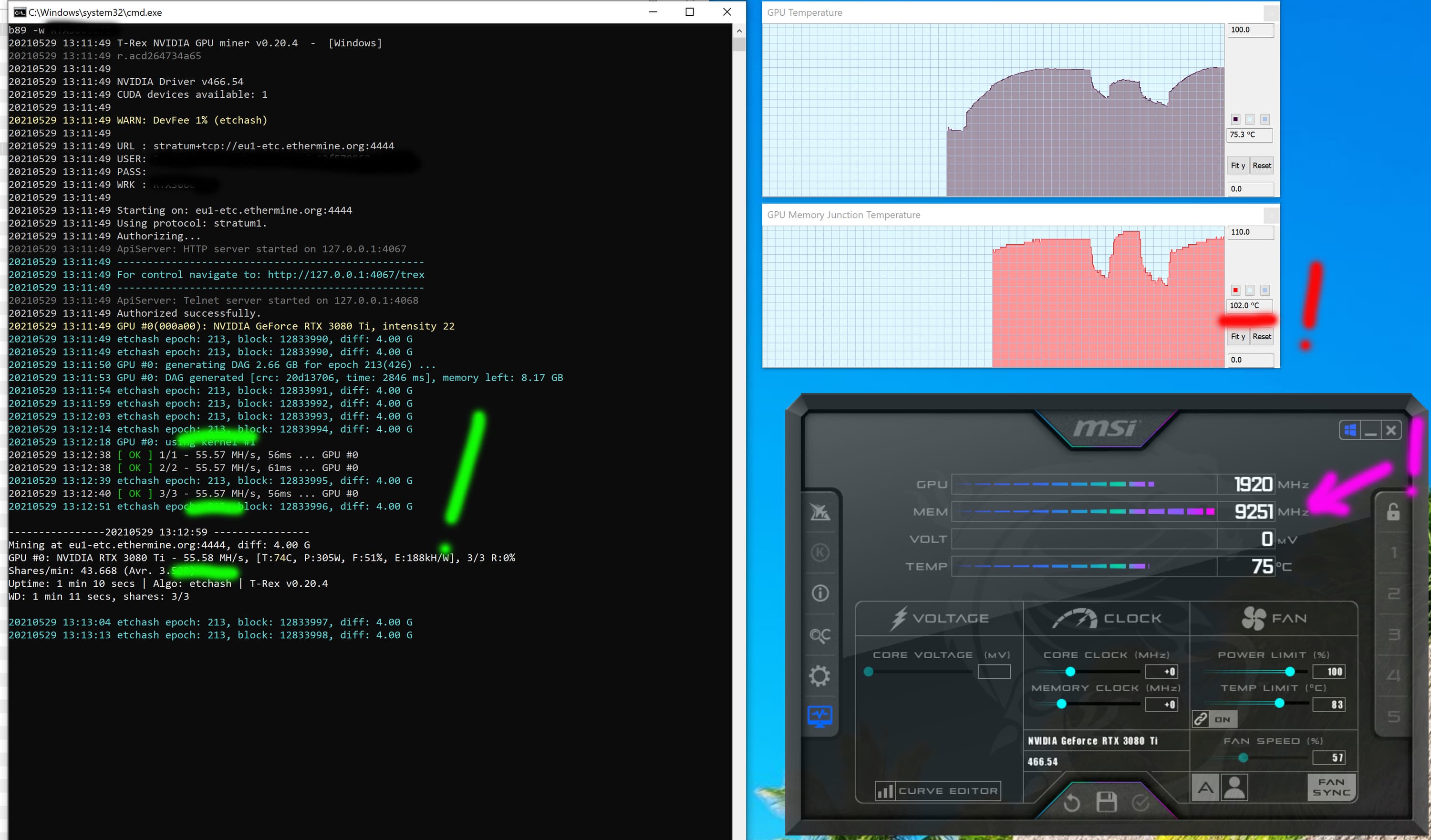 Оптимизация настроек работы видеокарт под майнинг в нашем случае не предусматривает сильного разгона видеопамяти, также обязательным является внешний обдув видеокарт. Особо тщательно надо следить за нагревом GDDR6X у GeForce RTX 3080/3090, ибо максимум для этой памяти — 110 градусов, и она долго не проживет, постоянно работая в условиях нагрева выше 100 °C.