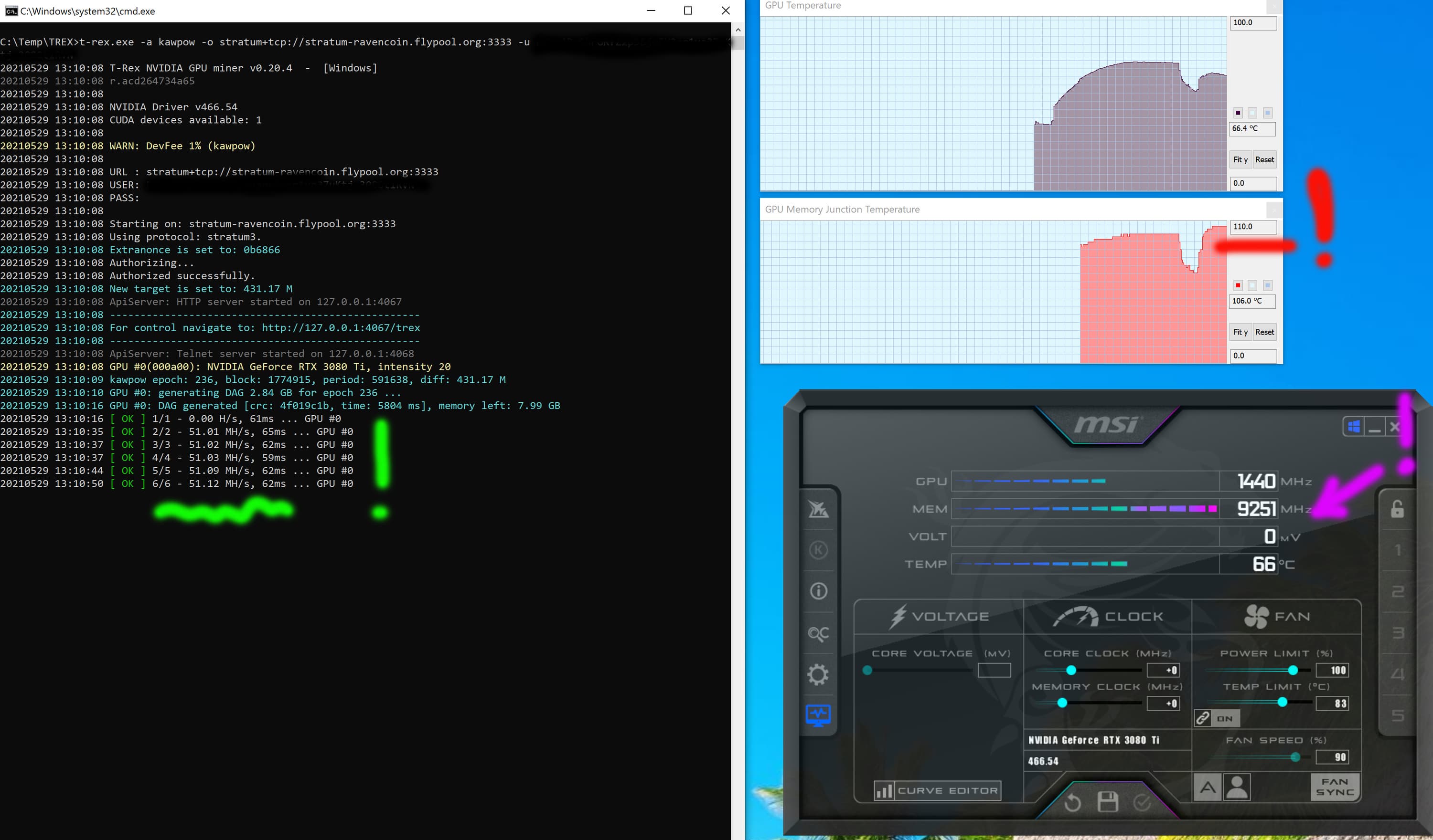 Если посмотреть на результаты хэшрейта по RVN в целом (на диаграмме выше), то есть понимание, что он примерно в 2 раза ниже, чем аналог по ETH. Особо подчеркну для несведущих, что абсолютное число хэшрейта играет роль только в рамках той или иной монеты. Сравнивать производительность видеокарт между монетами бесполезно. Итак, несмотря на то, что мы вроде как видим 51-52 MH/s (зеленым цветом) у 3080 Ti, это не половинный, а полноценный хэшрейт по RVN! И мы понимаем, что в данном случае защита от майнинга не работает. При этом снова частота памяти (фиолетовым цветом) не достигла номинала, но перегрев еще выше, уже 106 градусов на GDDR6X, что приближается к критической отметке в 110, после чего видеокарта входит в режим троттлинга и сброса всех частот.