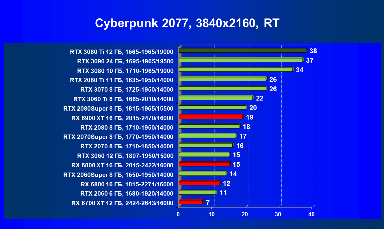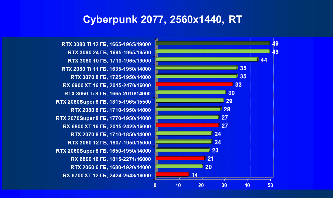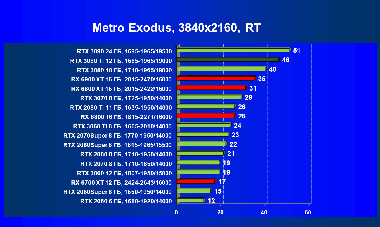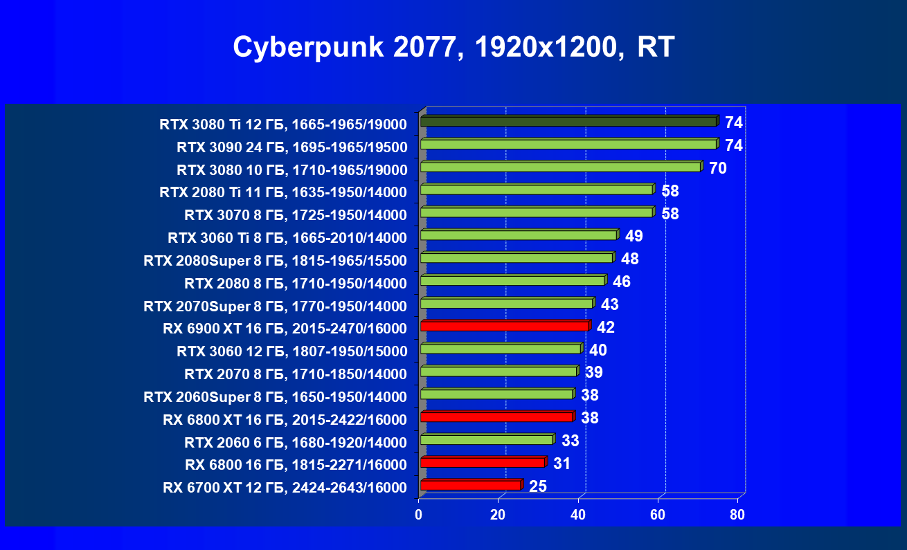 Зато у решений AMD больше видеопамяти — 16 ГБ против 12 ГБ, хотя в играх в обозримом будущем это вряд ли как-то скажется. В отличие от профессионального применения для создания цифрового контента, в которых каждый гигабайт на счету. Но у Nvidia там есть более мощная RTX 3090 с 24 ГБ памяти, лучше подходящая для профессиональных задач. Ну а 12 ГБ в случае RTX 3080 Ti можно считать оптимальным объемом видеопамяти, с учетом ширины шины.