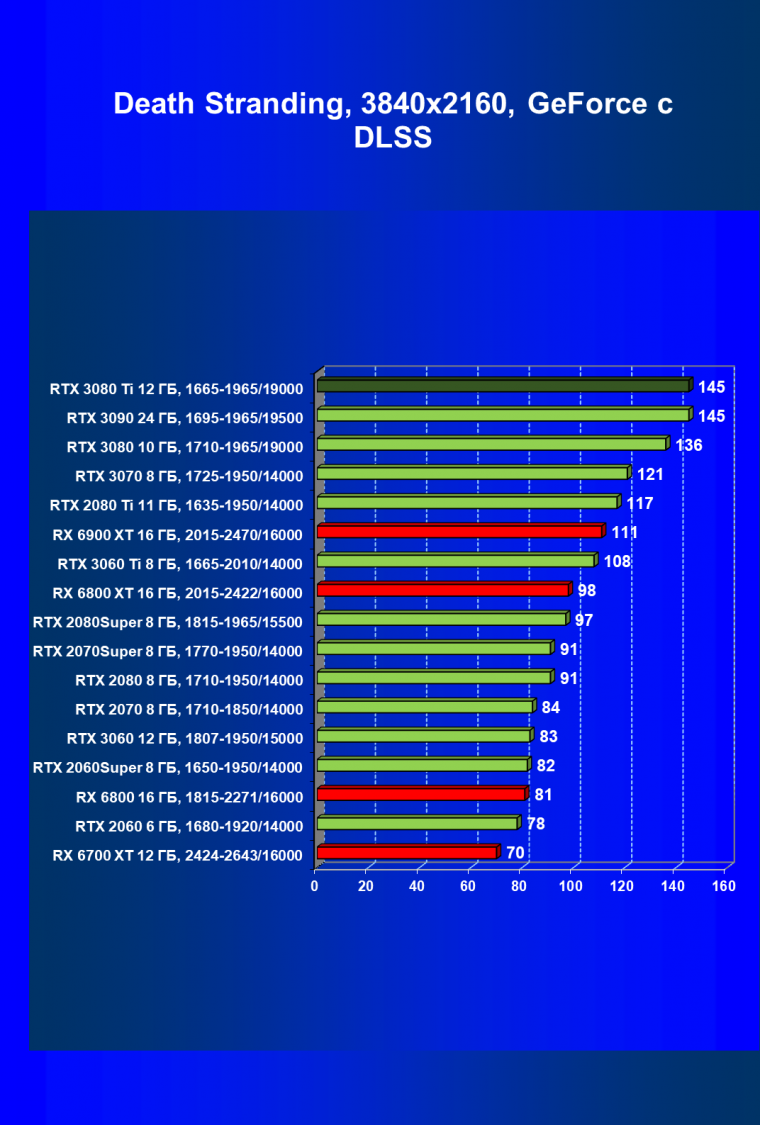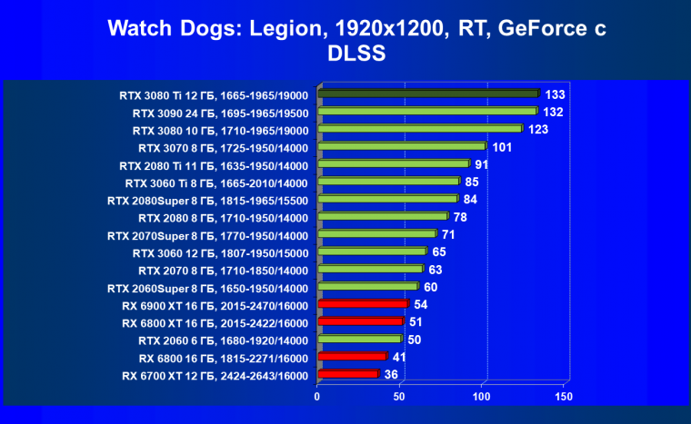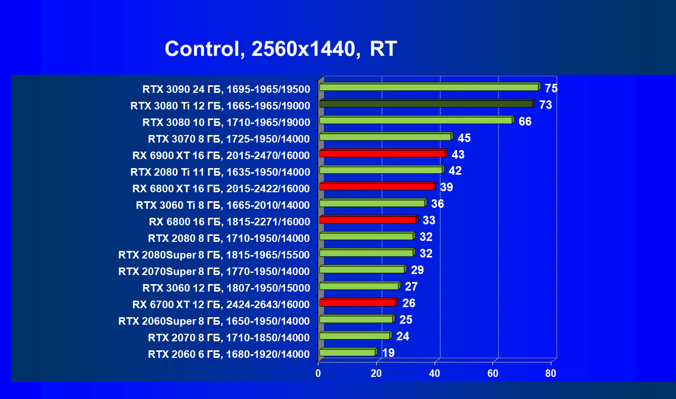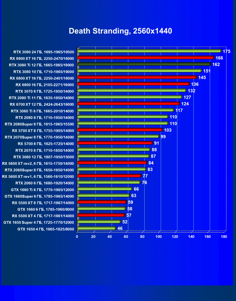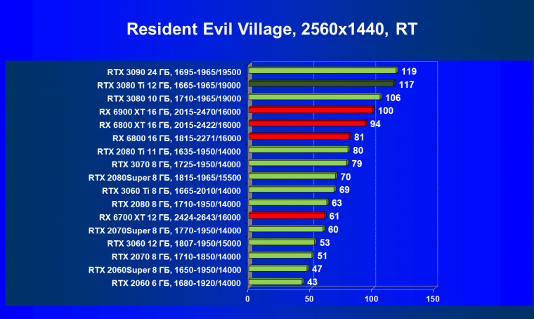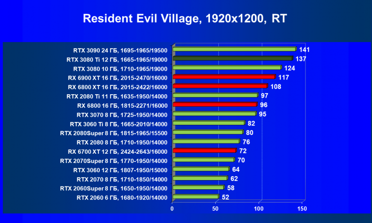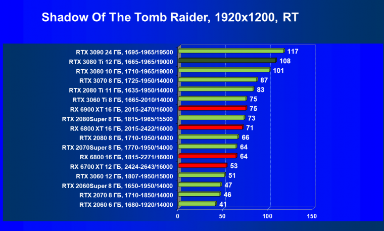 Зато у решений AMD больше видеопамяти — 16 ГБ против 12 ГБ, хотя в играх в обозримом будущем это вряд ли как-то скажется. В отличие от профессионального применения для создания цифрового контента, в которых каждый гигабайт на счету. Но у Nvidia там есть более мощная RTX 3090 с 24 ГБ памяти, лучше подходящая для профессиональных задач. Ну а 12 ГБ в случае RTX 3080 Ti можно считать оптимальным объемом видеопамяти, с учетом ширины шины.