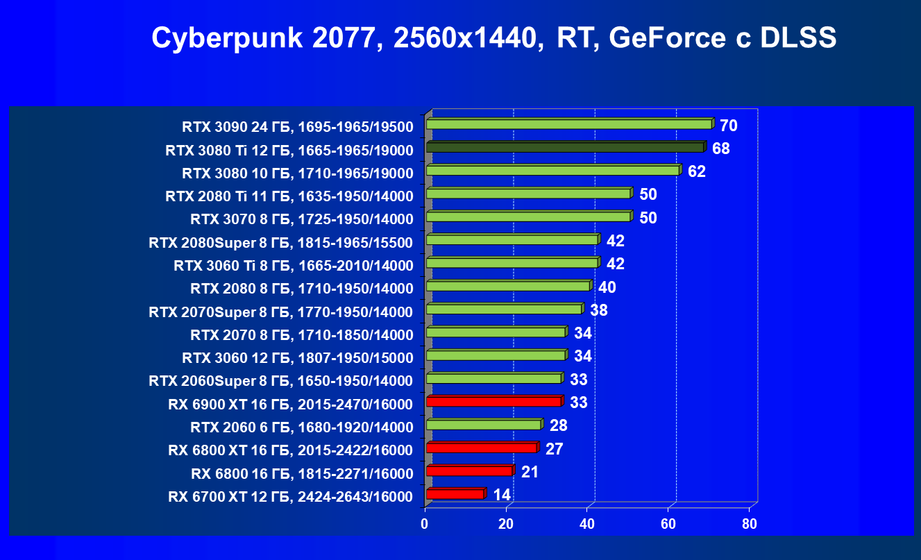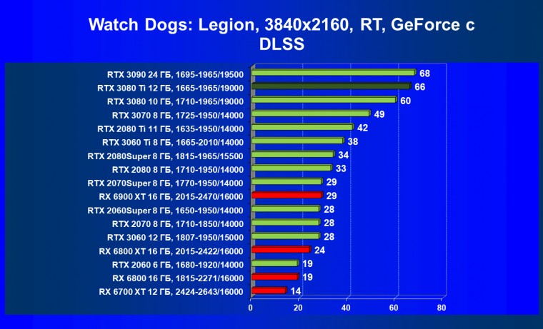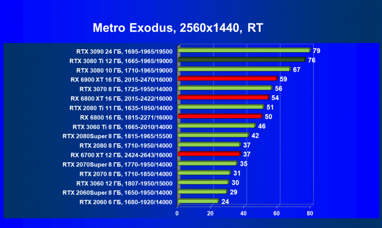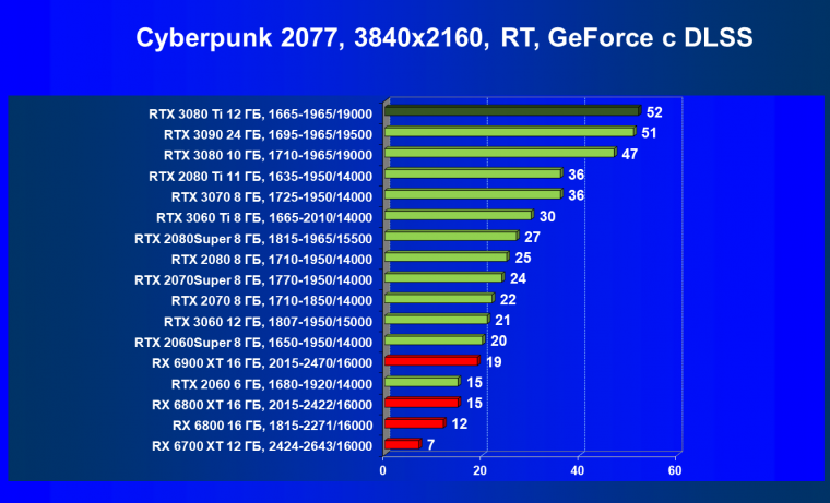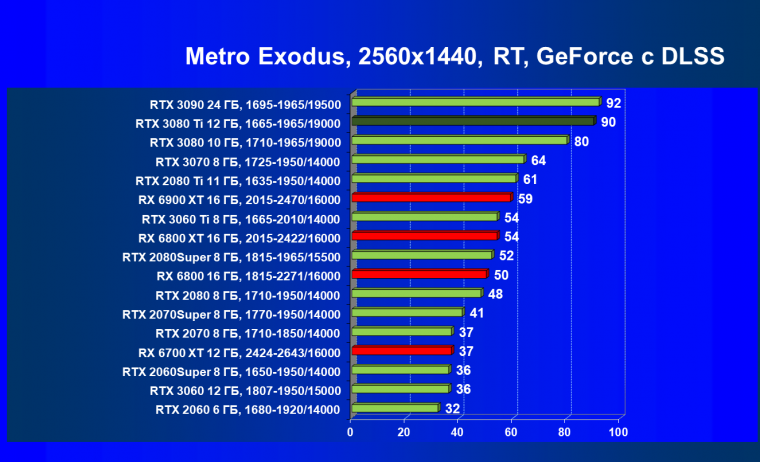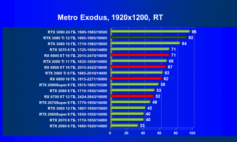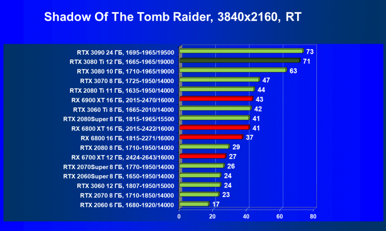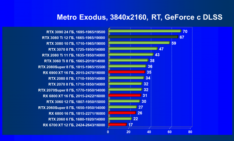 Ничего нового мы тут не скажем. В играх с трассировкой лучей соперничество новых Radeon с GeForce RTX происходит на уровень ниже: даже RTX 3080 сильно выше по рейтингу, чем топовый RX 6900 XT.