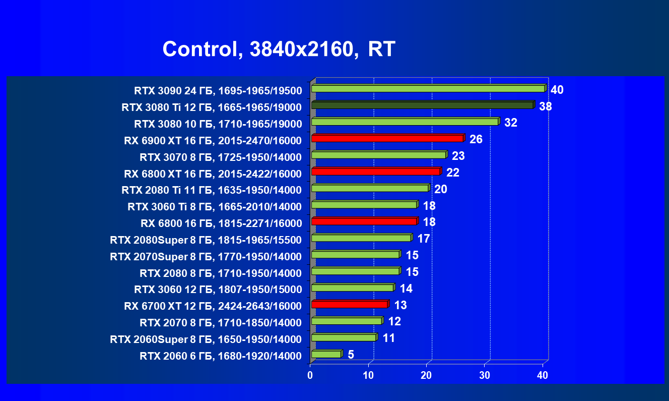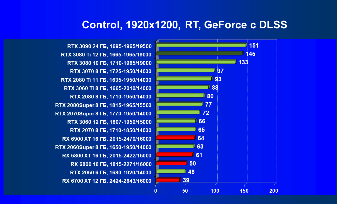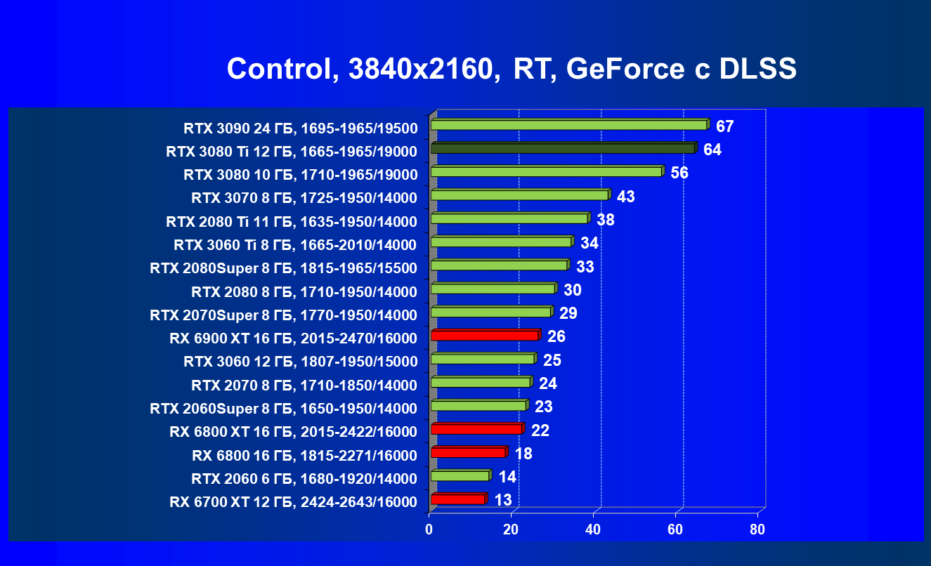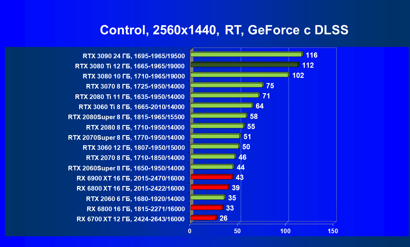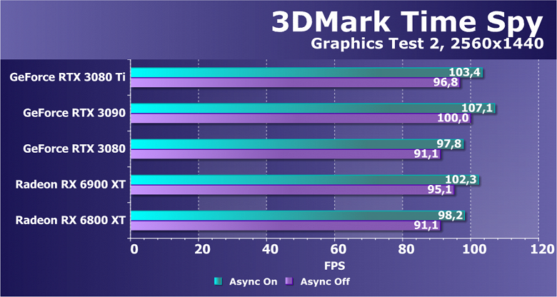 Если мы рассматриваем классические игры (без трассировки лучей и/или DLSS), то прекрасно видно, что RTX 3080 Ti прилично оторвался от RTX 3080, обошел соперника в лице RX 6800 XT и практически догнал RX 6900 XT. Да и до RTX 3090 не так много осталось (интересно будет посмотреть, что покажут нереференсные версии карт от партнеров Nvidia с фабрично повышенными частотами: по идее и RTX 3090 должен быть поверженным, иначе смысла не будет в разгоне).