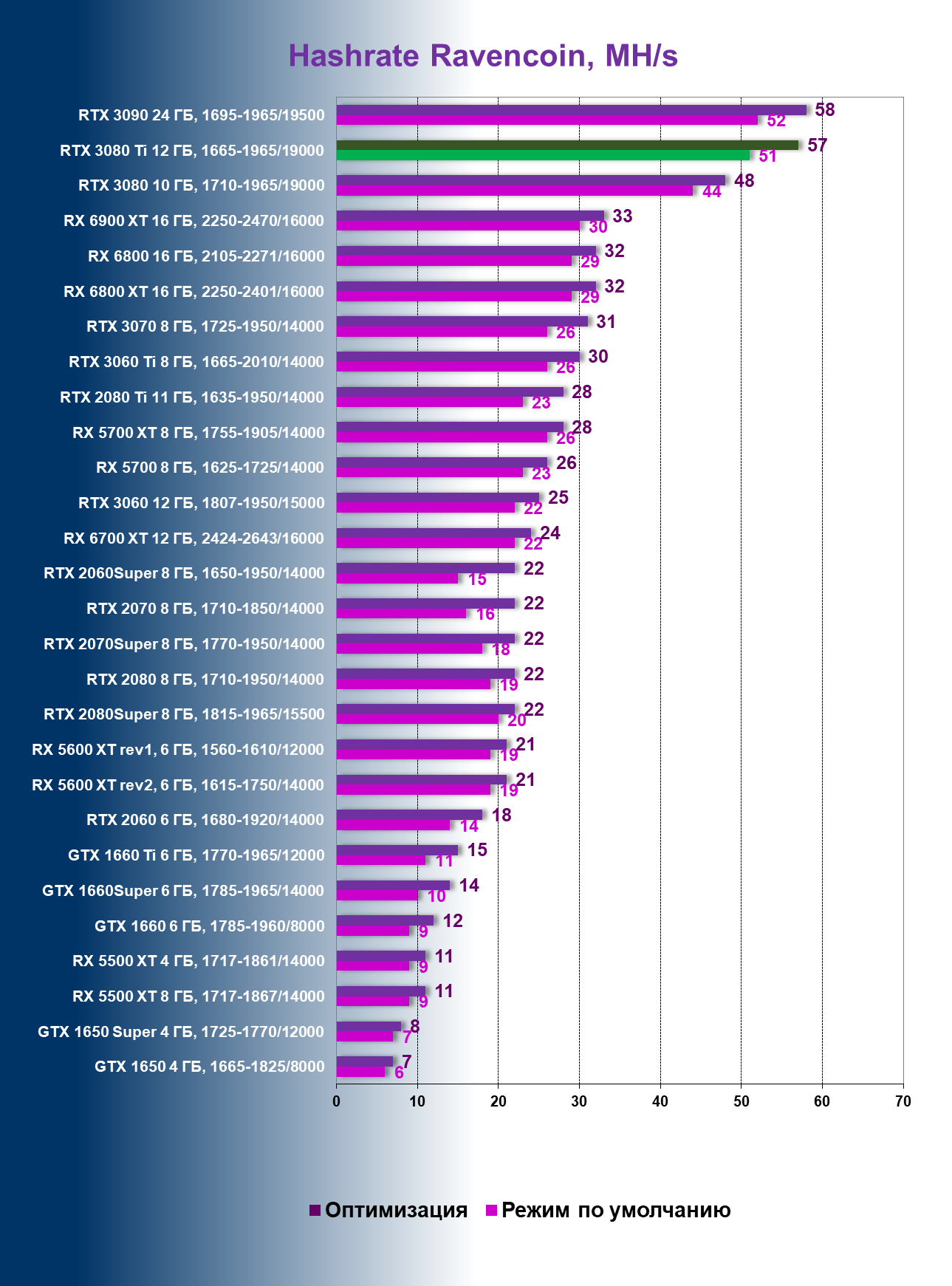 | 10 | RTX 3080 10 ГБ, 1710—1965/19000 | 15 | 356 | 245 000 |