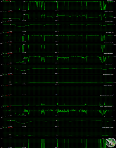 Стоит особо обратить внимание, что при настройках по умолчанию частота работы памяти не достигает номинальных эффективных частот в 19 ГГц, оставаясь на уровне 18.5 (отмечено фиолетовым цветом), и при этом нагрев микросхем памяти достигал 100-102 °C! Подчеркну, что продувка в корпусе приличная. То есть даже при том, что карта выдает половинный хэшрейт, она греется весьма и весьма прилично. И это мы пока говорим об алгоритме ethash.