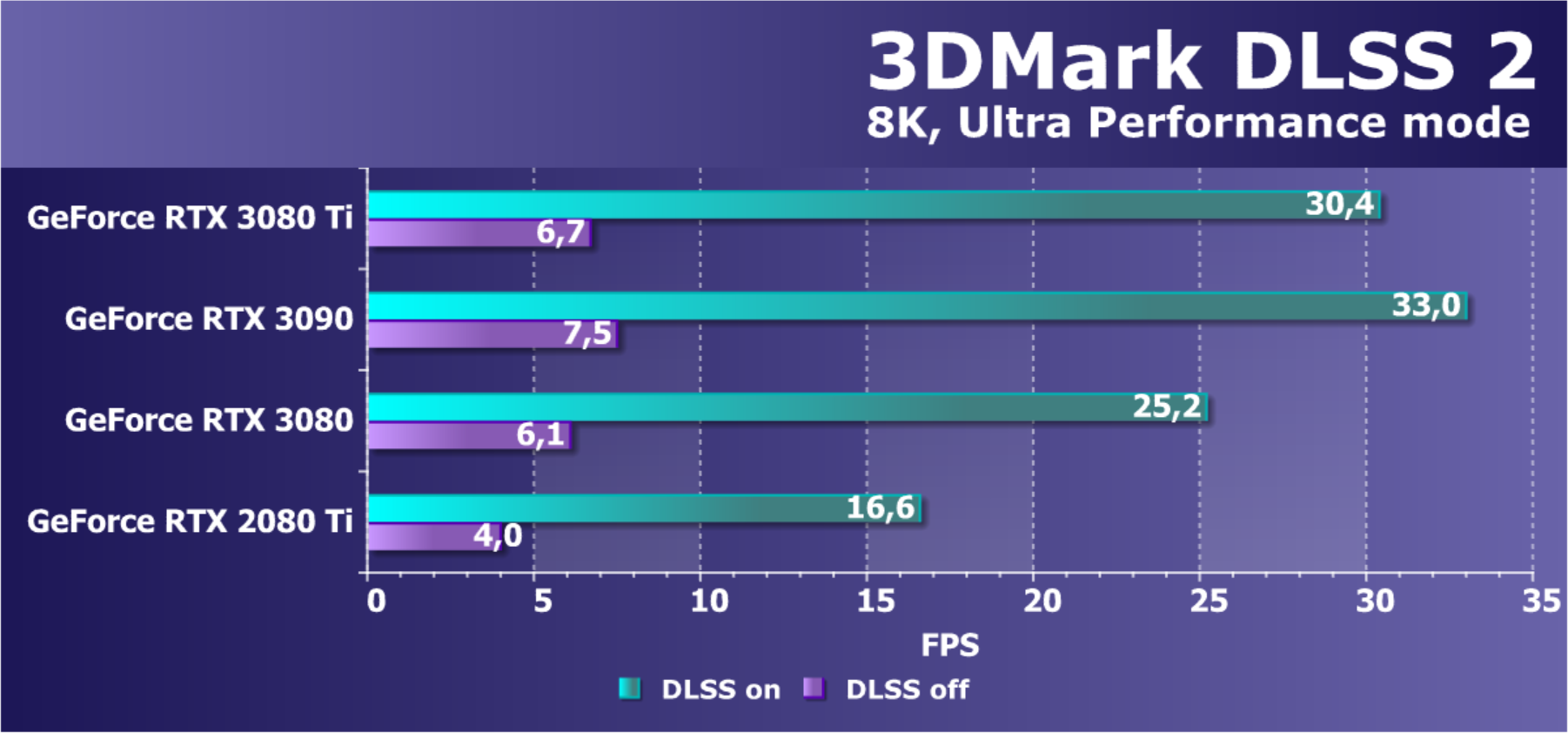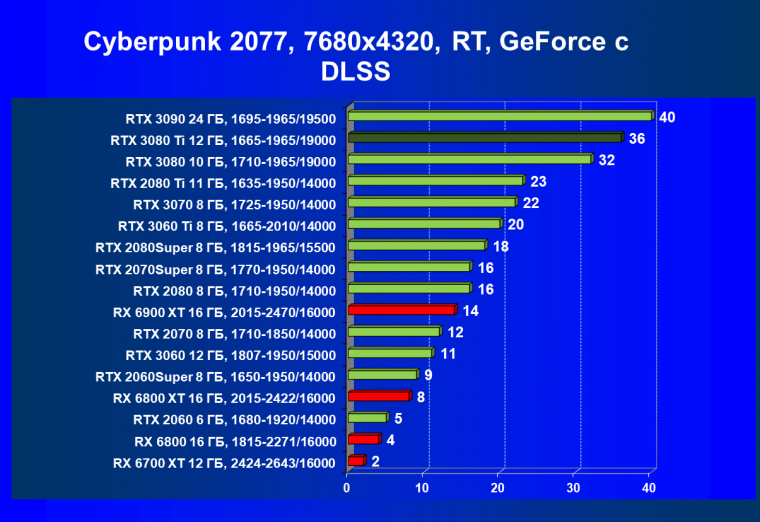 Результаты тестов с включенной аппаратной трассировкой лучей (и DLSS) в разрешении 7680×4320 (8К)