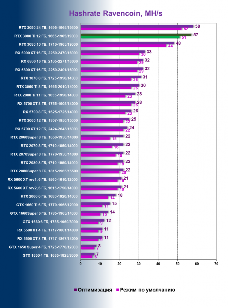 Для тестирования GeForce RTX 3060 использовался тот самый «утекший» драйвер версии 470.05, в котором отключена защита от майнинга, на других версиях он составляет 24/26 MH/s.