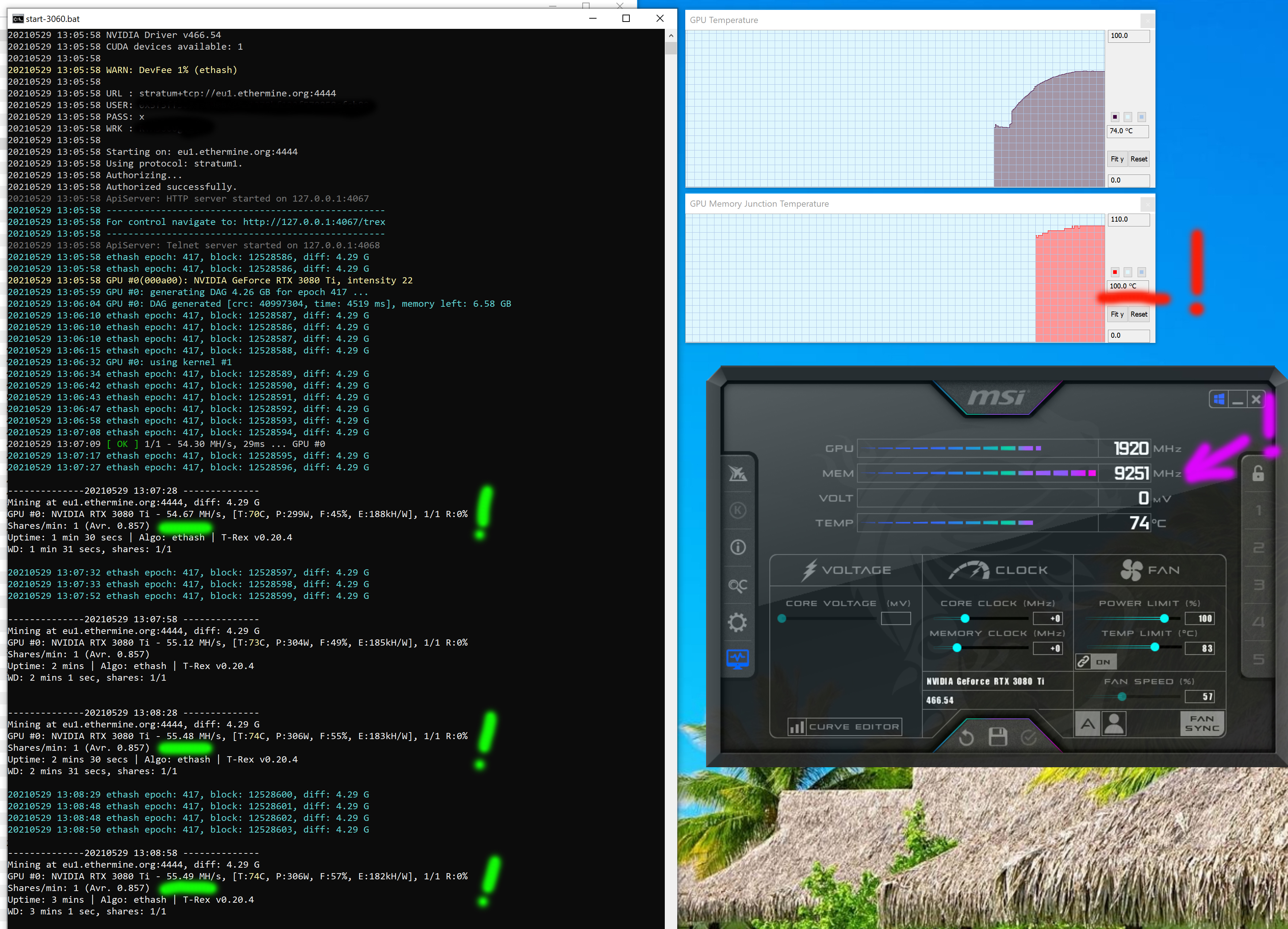 - оптимизация (лимит потребления снижен до 70%, частота GPU снижена на 200 МГц, частота памяти повышена на 500—1000 МГц (в зависимости от карты), вентиляторы выставлены в ручном режиме на 80%)