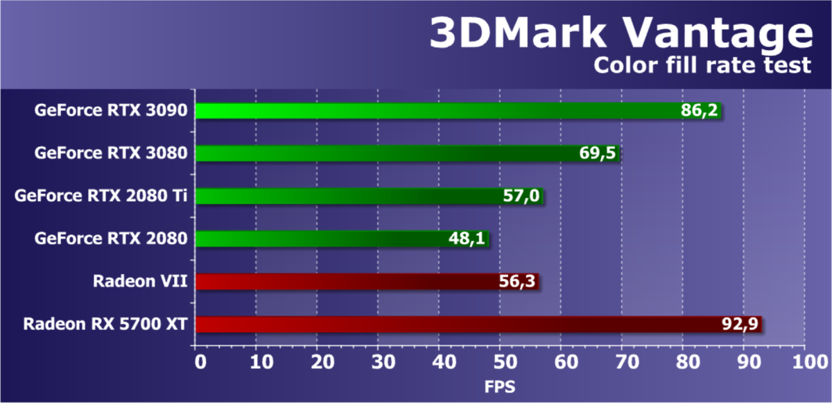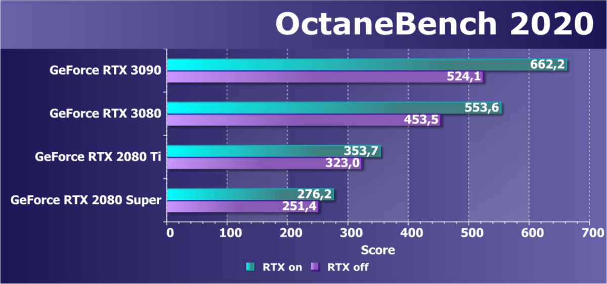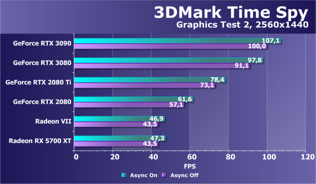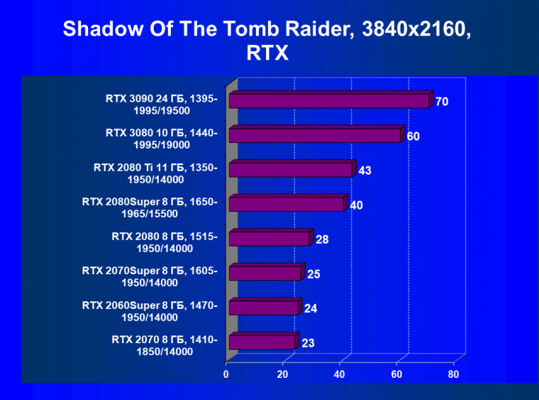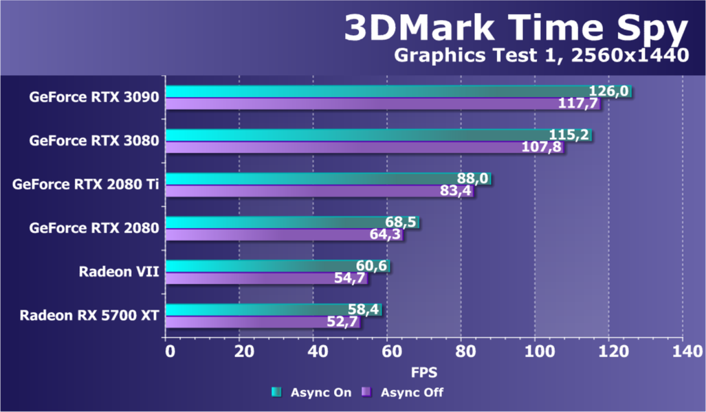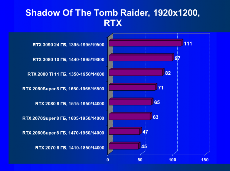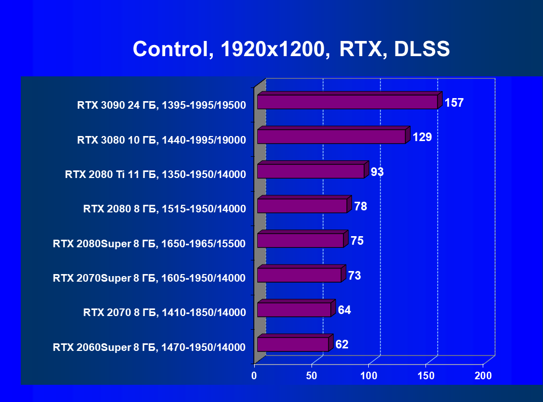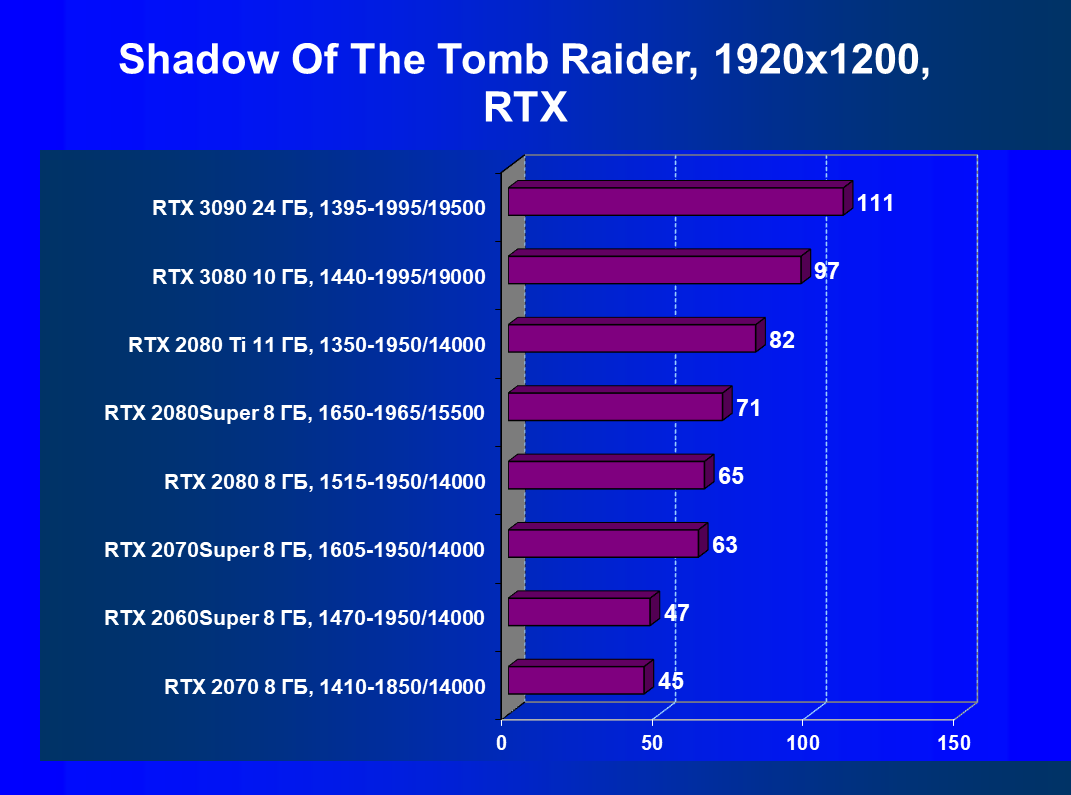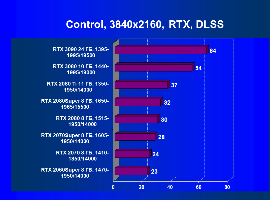 Полагаем, что комментарии излишни, и снова приветствуем нового лидера 3D-графики игрового класса! Но все же отметим, что GeForce RTX 3090 позиционируется не только для игр, поэтому чисто игровой флагман на сегодня — GeForce RTX 3080.