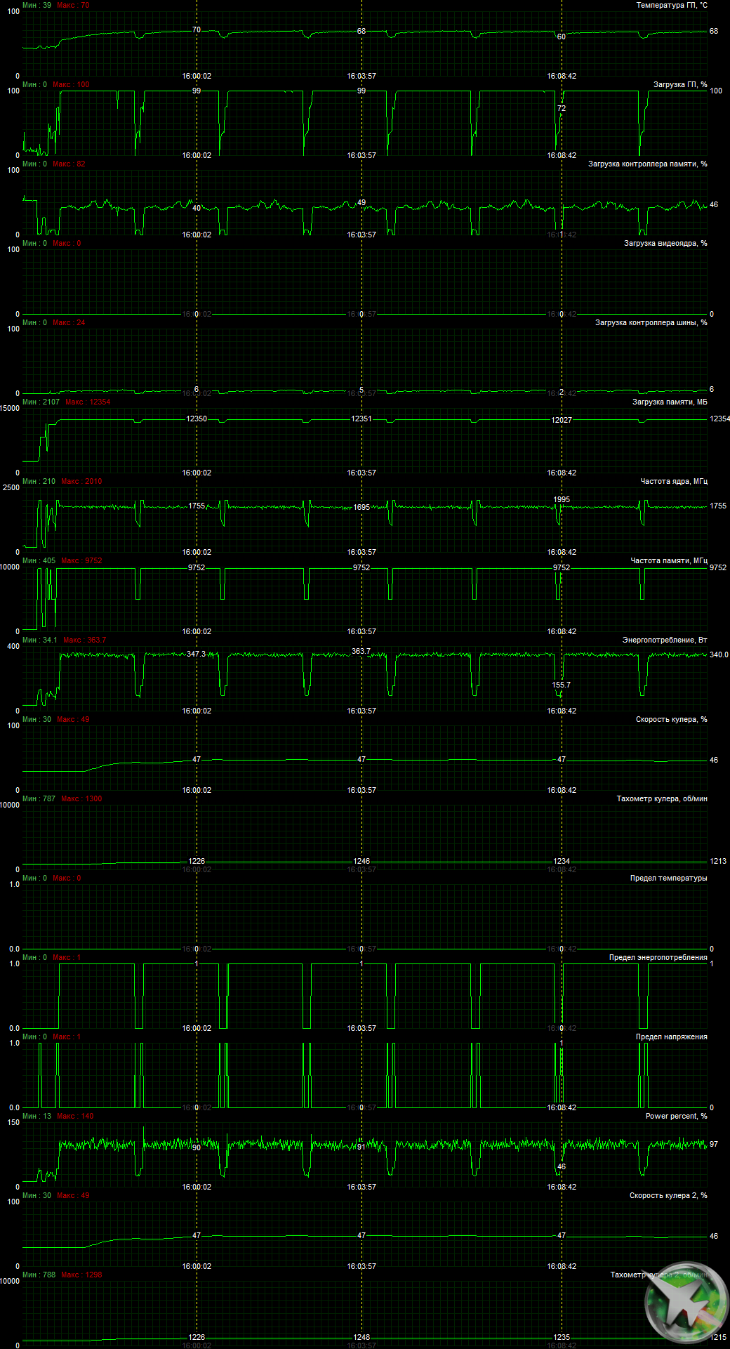 | 07 | RTX 2080 Super 8 ГБ, 1650—1965/15500 | 482 | 2578 | 53 500 |