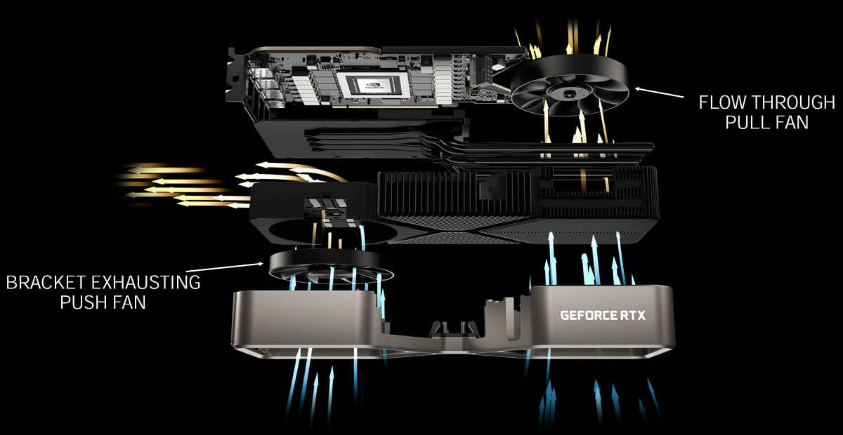 Nvidia выпустила видеокарты новой серии и в собственном дизайне под наименованием Founders Edition. Они предлагают любопытные системы охлаждения и строгий дизайн, которого не найти у большинства производителей видеокарт, гонящихся за количеством и размером вентиляторов, а также разноцветной подсветкой. Самое интересное в GeForce RTX 30, продаваемых под брендом Nvidia — совершенно новый дизайн системы охлаждения с двумя вентиляторами, расположенными необычным образом: первый более-менее привычно выдувает воздух через решетку с торца платы, а вот второй установлен с обратной стороны и протягивает воздух прямо сквозь видеокарту.