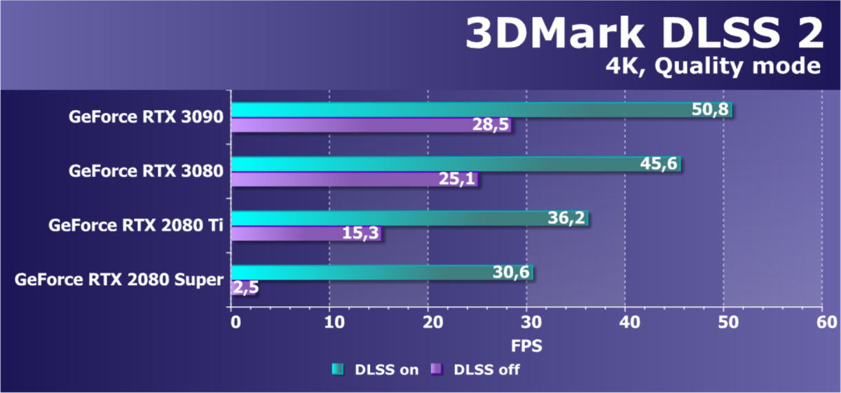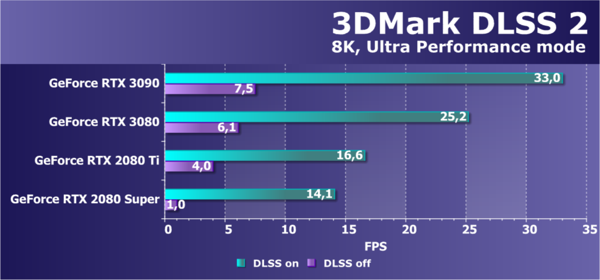 Вместе с выходом решений архитектуры Ampere были добавлены некоторые улучшения и в технологию DLSS — в частности, была проведена оптимизация под тензорные ядра третьего поколения и улучшенные асинхронные вычисления, а также появился новый режим для разрешения 8K. Он использует рендеринг изображения с в 9 раз меньшим количеством пикселей и затем восстанавливает его до полного разрешения 8K. Именно такой подход и позволяет получить качество высокого разрешения при сохранении 60 FPS даже в играх с поддержкой трассировки лучей.