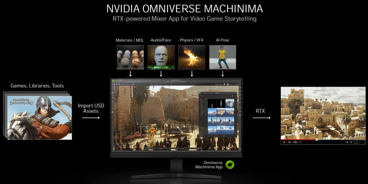 При помощи Nvidia Omniverse можно импортировать ресурсы из поддерживаемых игр и сторонних библиотек ресурсов, а затем автоматически анимировать персонажей при помощи использования специального средства позирования с применением возможностей ИИ и записей с веб-камеры. Лица персонажей можно оживить при использовании технологии Nvidia Audio2Face просто с помощью аудиозаписи с голосом.