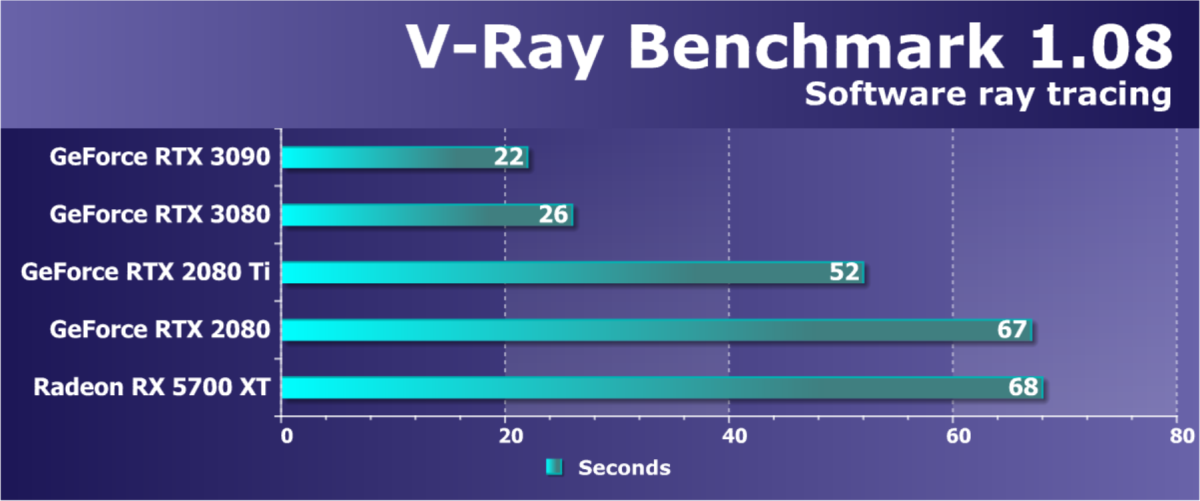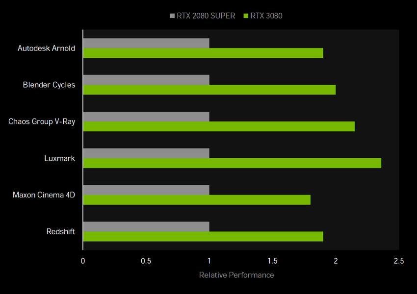 Новое семейство видеокарт GeForce RTX 30 приносит улучшенные возможности по ускорению рендеринга в таких популярных приложениях, как Blender Cycles, Chaos V-Ray и Autodesk Arnold. Помимо вдвое более производительных RT-ядер и удвоенного темпа исполнения математических вычислений в GPU новой архитектуры Ampere, отдельно отметим новую возможность для ускорения смазывания в движении (motion blur) для трассированных изображений, которая ускоряется на RTX 30 в несколько раз, вплоть до пяти. А огромный объем видеопамяти в 24 ГБ позволяет загрузить в нее большие 3D-проекты для аппаратной обработки полностью, без необходимости использования медленной системной памяти.