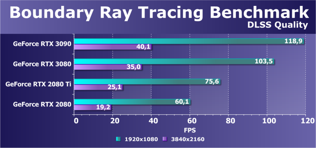 Видеокарта GeForce RTX 3090 в принципе является наиболее подходящей для 8K-разрешения. Во-первых, вместо двух кабелей для подключения к устройствам с разъемом HDMI 2.1 на всех Ampere можно использовать лишь один кабель. Во-вторых, это максимально производительный графический процессор на сегодня, а даже 4K-разрешение требует подобной мощности, не говоря уже о 8K. И в-третьих, зачастую 3D-приложения в высоком разрешении используют очень много видеопамяти, а GeForce RTX 3090 имеет более чем вдвое больший объем видеопамяти, по сравнению с прошлым флагманом компании — RTX 2080 Ti с его 11 ГБ. Новая модель несет 24 ГБ памяти нового типа GDDR6X с высокой пропускной способностью, которая также важна для 8K. Так что Nvidia не так уж далека от истины, когда называет этот GPU первым подходящим для 8K. Но все не так просто, ведь даже в 4K порой недостаточно производительности, особенно при включенной трассировке лучей.