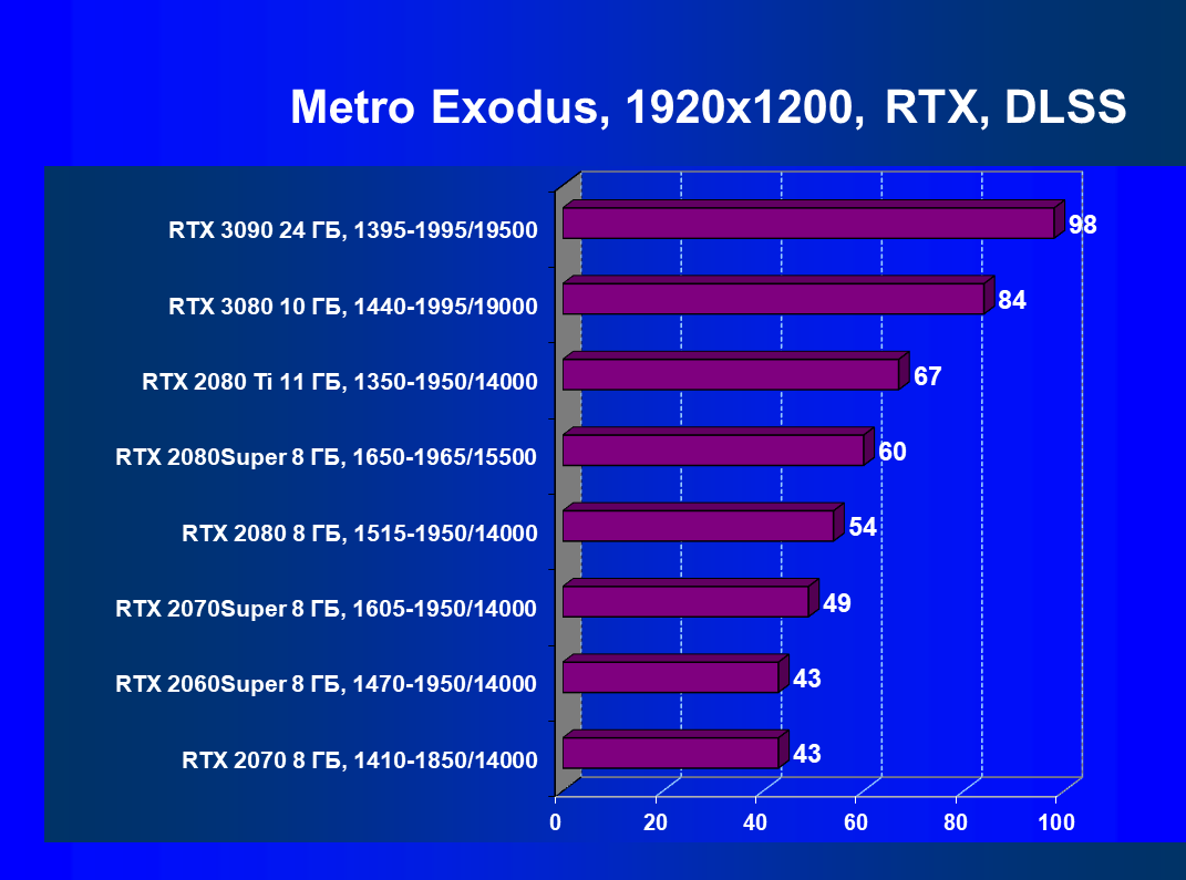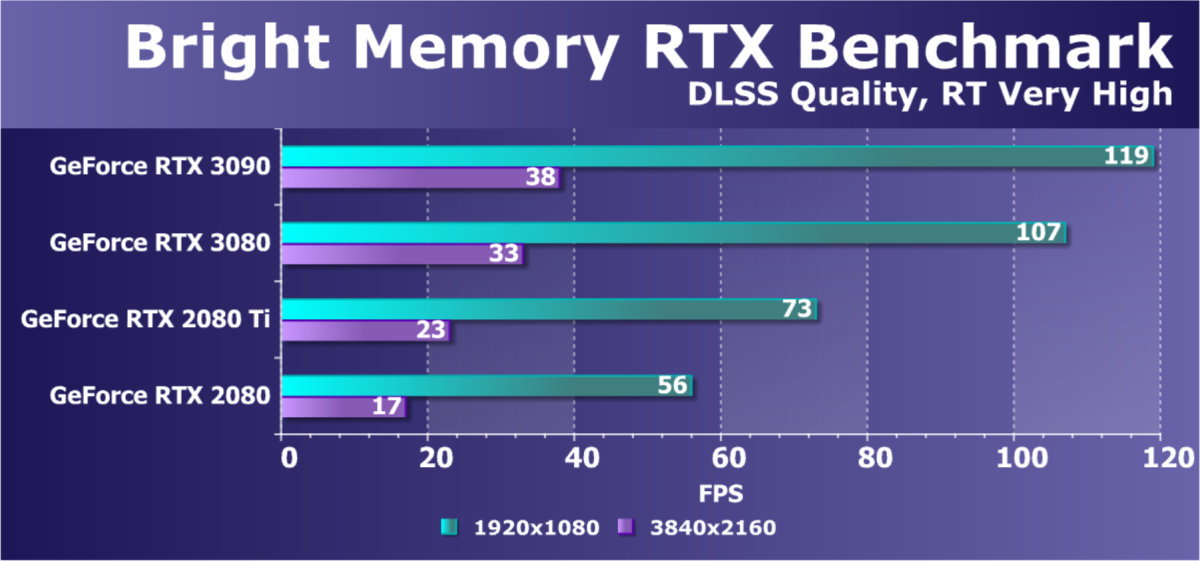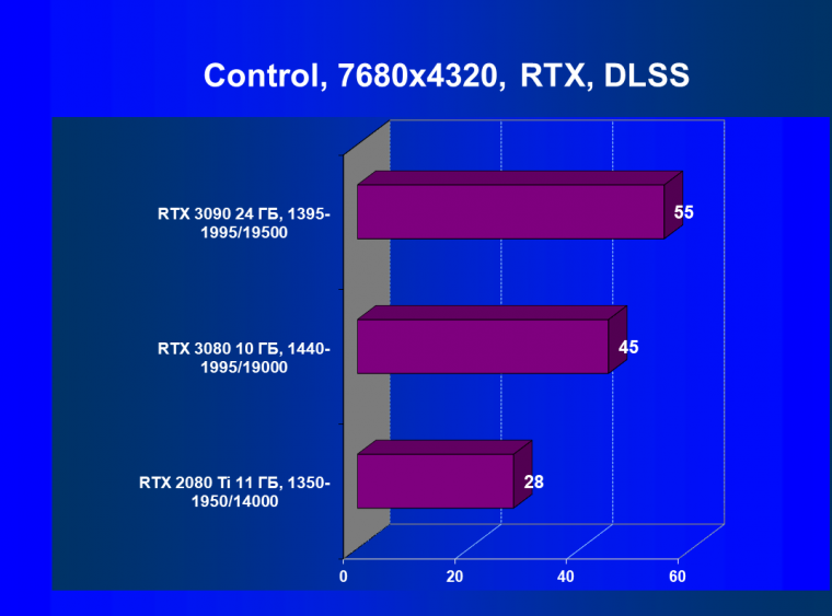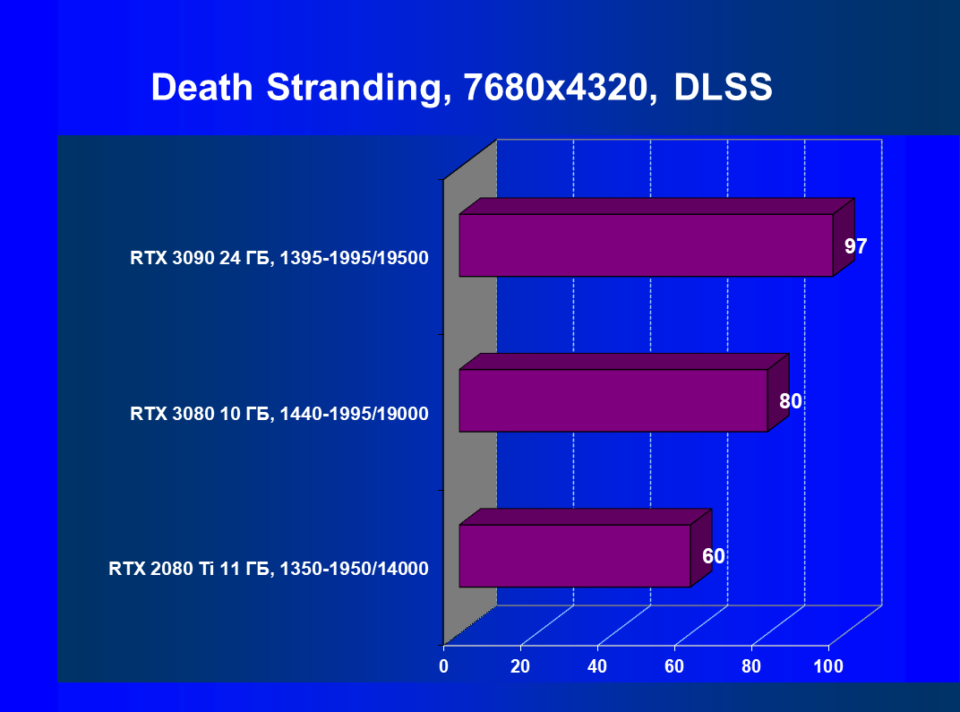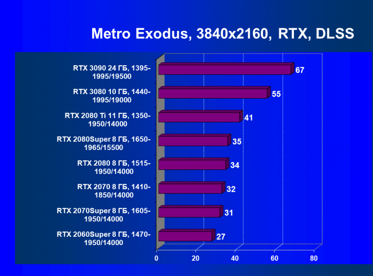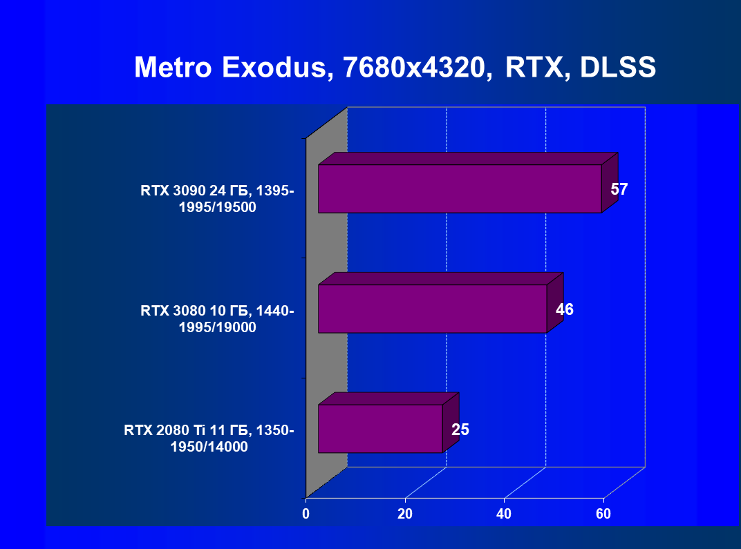 Изюминка нового ускорителя — реальная поддержка разрешения 8К, поскольку GeForce RTX 3090 обладает достаточной производительностью, чтобы некоторые игры с использованием DLSS обеспечивали игроку приемлемый комфорт на максимальных настройках графики в 8К. А объем памяти у новинки позволит свободно хранить необходимые текстуры и данные даже для столь высокого разрешения. От GeForce RTX 3080, как и от GeForce RTX 2080 Ti, такого ждать не приходится, их производительность в 8K будет на грани минимальной играбельности — в том числе из-за ограничения локальной видеопамяти объемом 10-11 ГБ. В видеоролике выше можно в конце увидеть всего 25-28 fps в 8К — это был запуск Metro Exodus без DLSS, с которым производительность вырастает более чем в 2 раза (как мы показали выше).