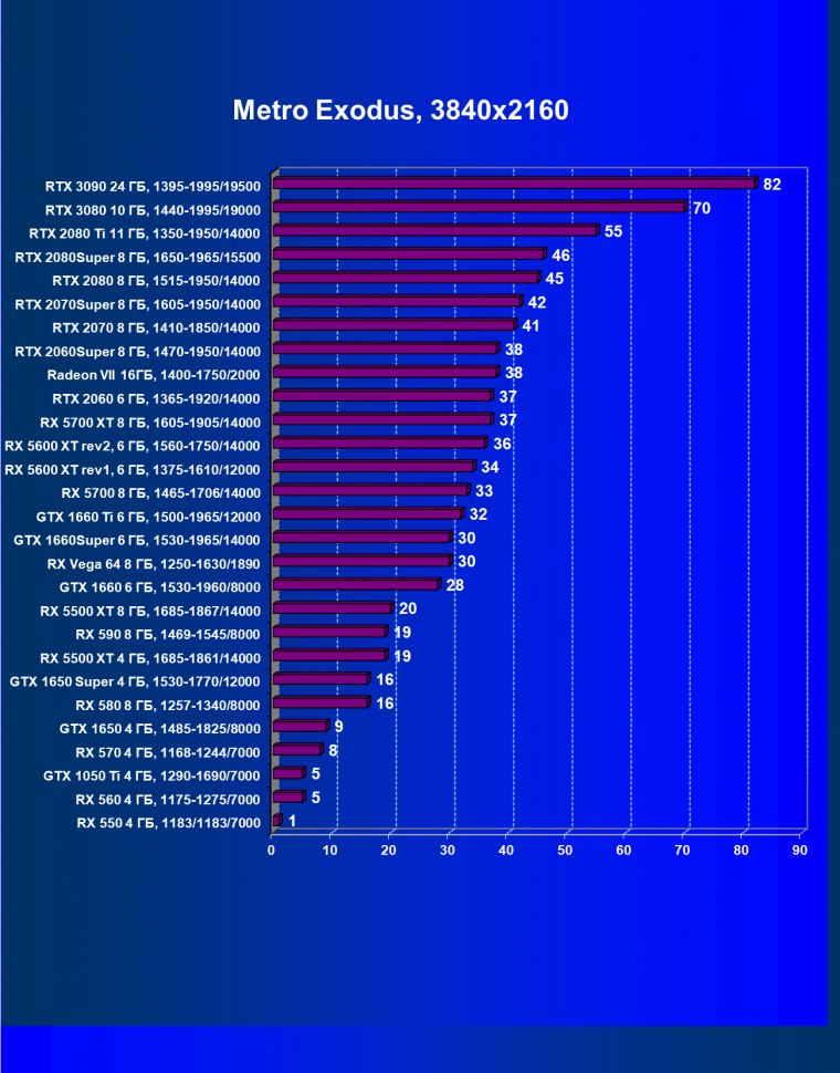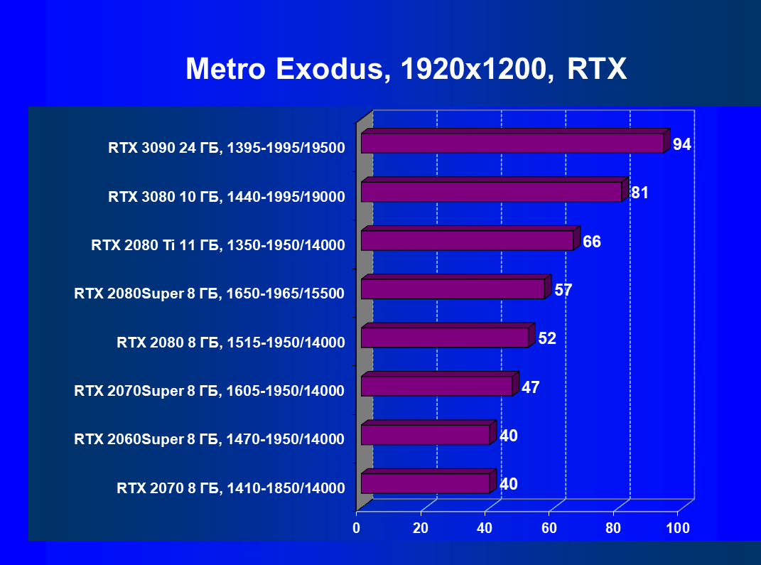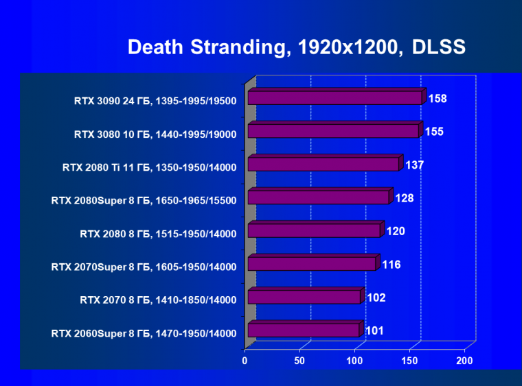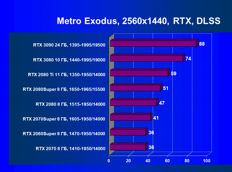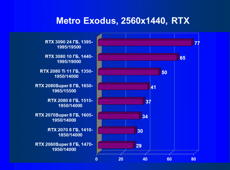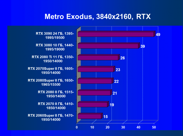 Изюминка нового ускорителя — реальная поддержка разрешения 8К, поскольку GeForce RTX 3090 обладает достаточной производительностью, чтобы некоторые игры с использованием DLSS обеспечивали игроку приемлемый комфорт на максимальных настройках графики в 8К. А объем памяти у новинки позволит свободно хранить необходимые текстуры и данные даже для столь высокого разрешения. От GeForce RTX 3080, как и от GeForce RTX 2080 Ti, такого ждать не приходится, их производительность в 8K будет на грани минимальной играбельности — в том числе из-за ограничения локальной видеопамяти объемом 10-11 ГБ. В видеоролике выше можно в конце увидеть всего 25-28 fps в 8К — это был запуск Metro Exodus без DLSS, с которым производительность вырастает более чем в 2 раза (как мы показали выше).