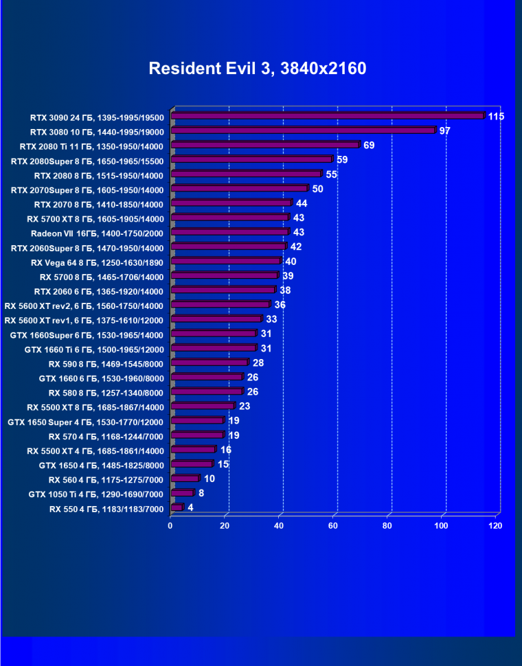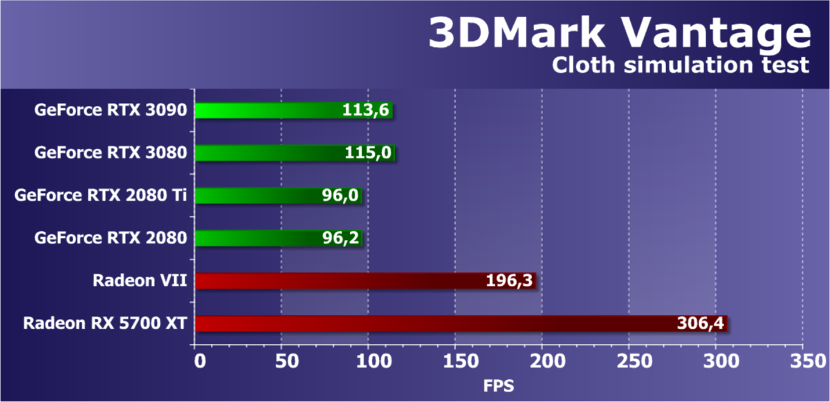 У компании AMD соперников для GeForce RTX 3090 в нашем сегодняшнем сравнении снова просто не существует. Ждем конца октября, когда новые Radeon будут объявлены, а скорее даже ноября, когда они появятся у нас на тестах. Ну а пока нам ничего не остается, кроме как снова сравнивать новинки Nvidia с парой видеокарт: результаты Radeon VII присутствуют в качестве самого быстрого решения, хоть уже и давно исчезнувшего из продажи, а также есть Radeon RX 5700 XT — наиболее производительный графический процессор архитектуры RDNA первого поколения.