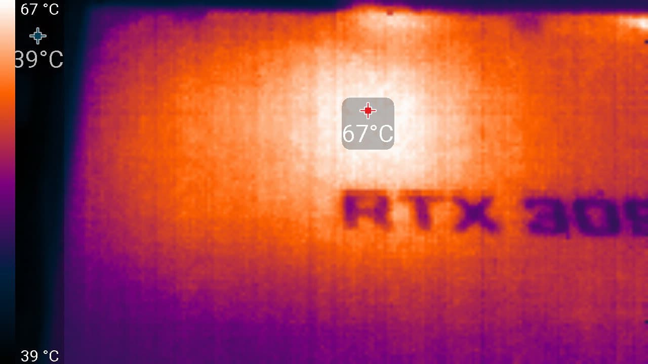 Как и в случае с GeForce RTX 3080, с учетом того, сколько данная карта «кушает» (около 364 Вт в максимуме!), шум абсолютно приемлемый, и надо похвалить разработчиков, придумавших такую хитроумную СО.