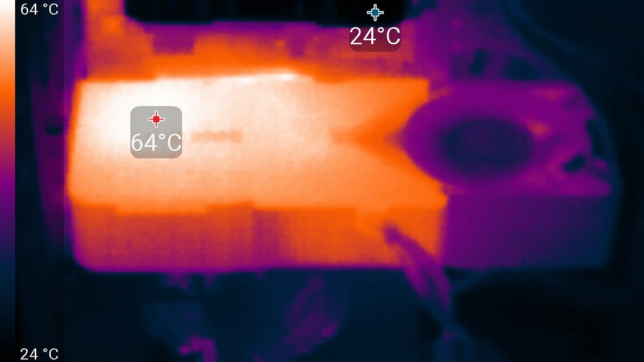 Таким образом, тепло отводится от компонентов на карте в гибридную испарительную камеру, где оно распределяется по всей длине радиатора. Левый вентилятор выводит нагретый воздух через большие вентиляционные отверстия в креплении, а правый вентилятор направляет воздух к выдувному вентилятору корпуса, где он обычно установлен в большинстве современных систем. Эти два вентилятора работают на разной скорости, которая настраивается для них индивидуально.
