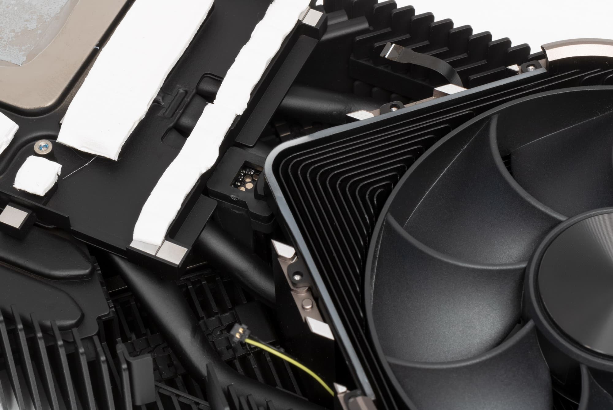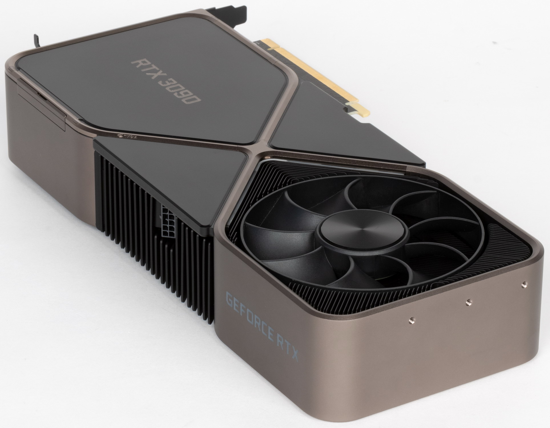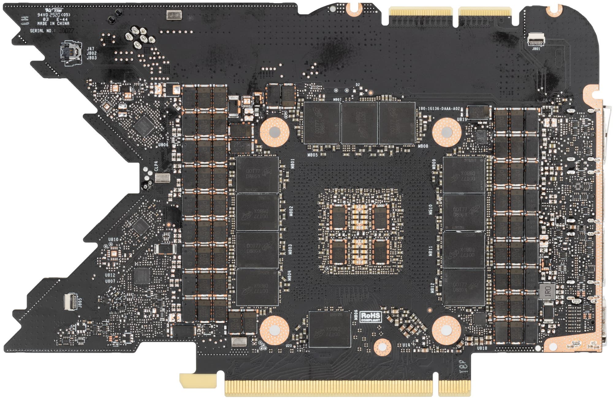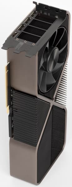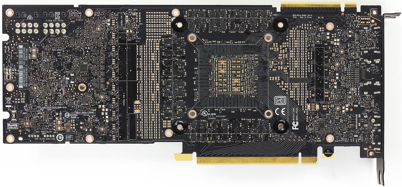 Подобное решение заставило инженеров менять всю конструкцию. Если обычные печатные платы проходят во всю длину видеокарт, то в случае продувного вентилятора пришлось разработать короткую печатную плату, с уменьшенным слотом NVLink, новыми разъемами питания (переходник на два обычных 8-контактных PCI-E прилагается). При этом, разместить на карте большое количество фаз для питания и микросхем памяти, было очень непросто. Но эти изменения дали возможность большого выреза для вентилятора на печатной плате, чтобы потоку воздуха ничего не мешало.