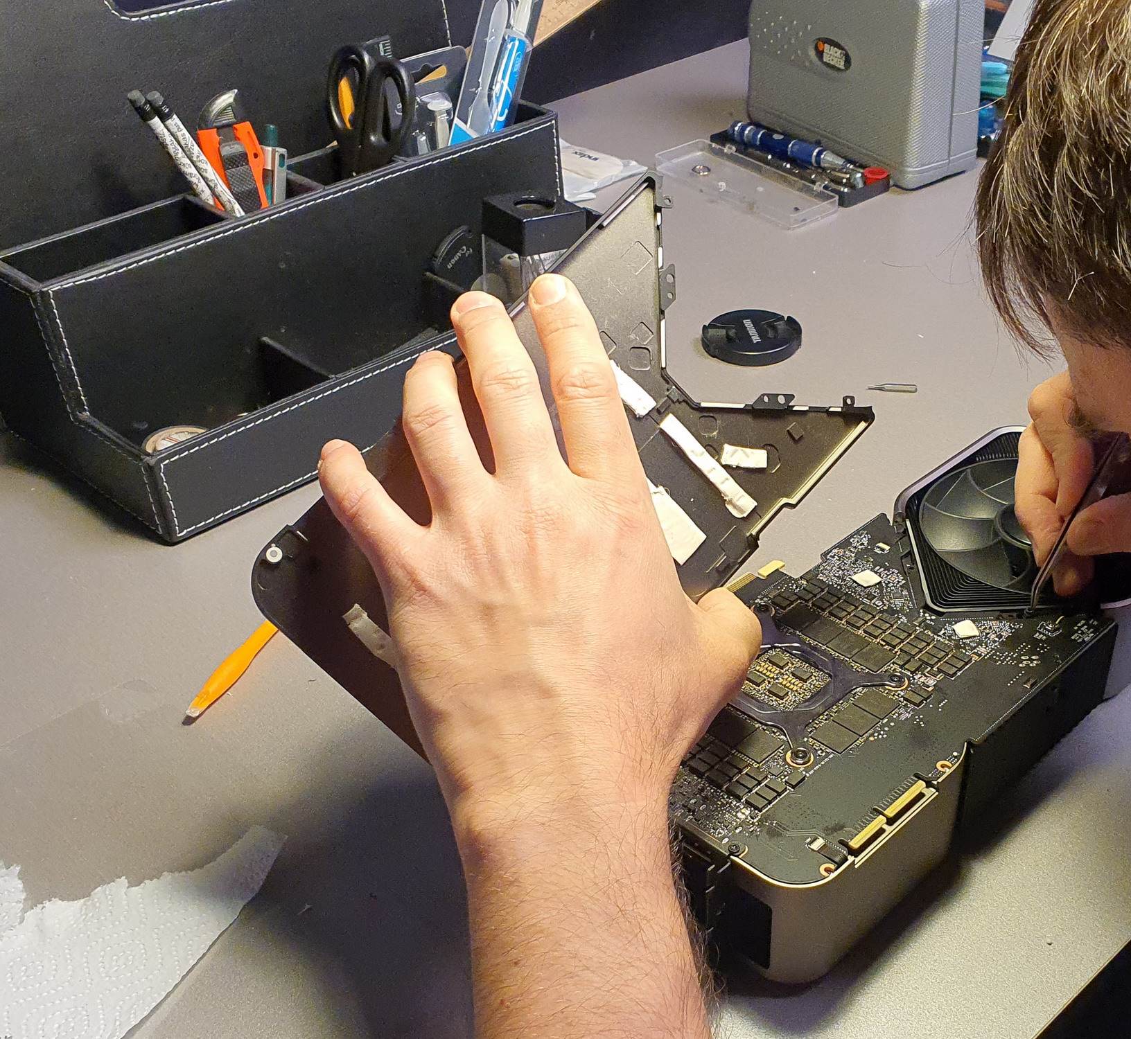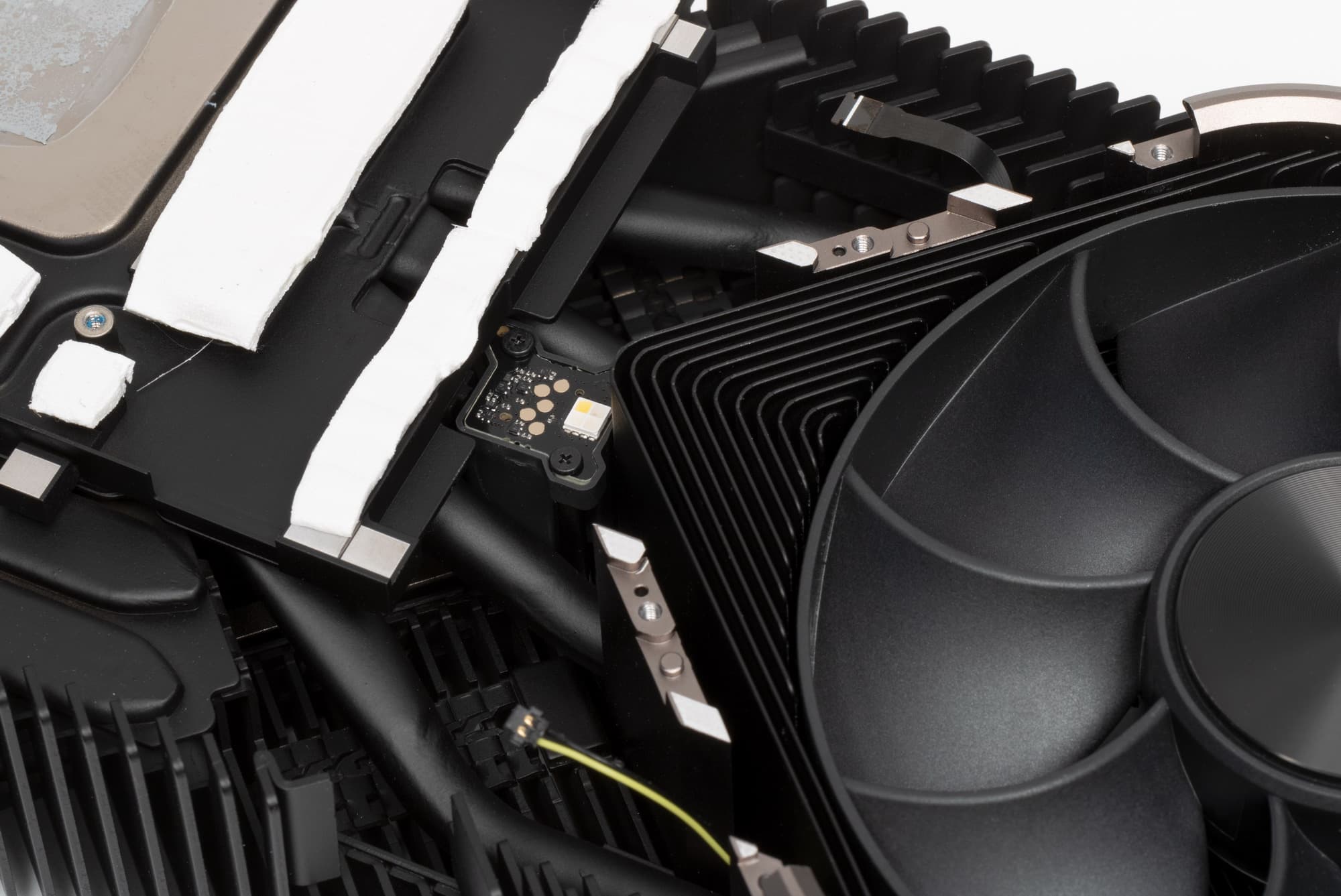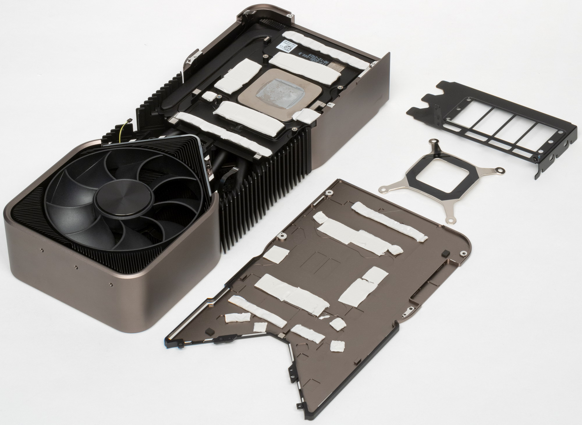 Подобное решение заставило инженеров менять всю конструкцию. Если обычные печатные платы проходят во всю длину видеокарт, то в случае продувного вентилятора пришлось разработать короткую печатную плату, с уменьшенным слотом NVLink, новыми разъемами питания (переходник на два обычных 8-контактных PCI-E прилагается). При этом, разместить на карте большое количество фаз для питания и микросхем памяти, было очень непросто. Но эти изменения дали возможность большого выреза для вентилятора на печатной плате, чтобы потоку воздуха ничего не мешало.