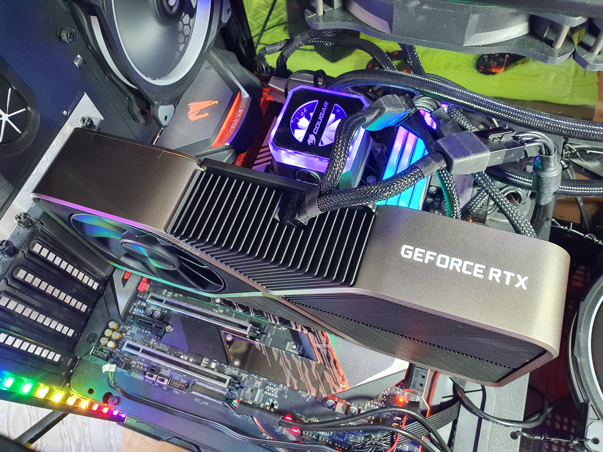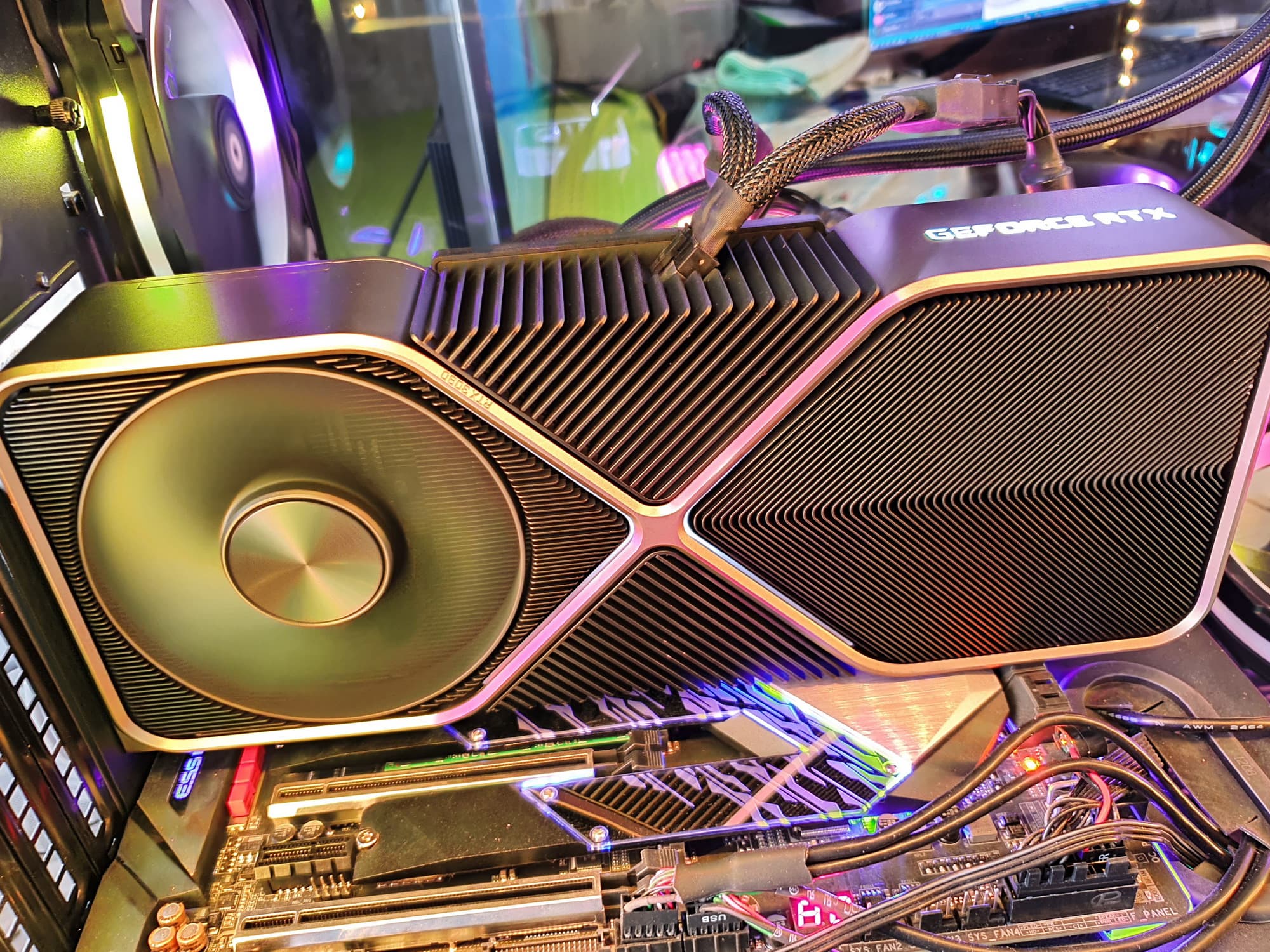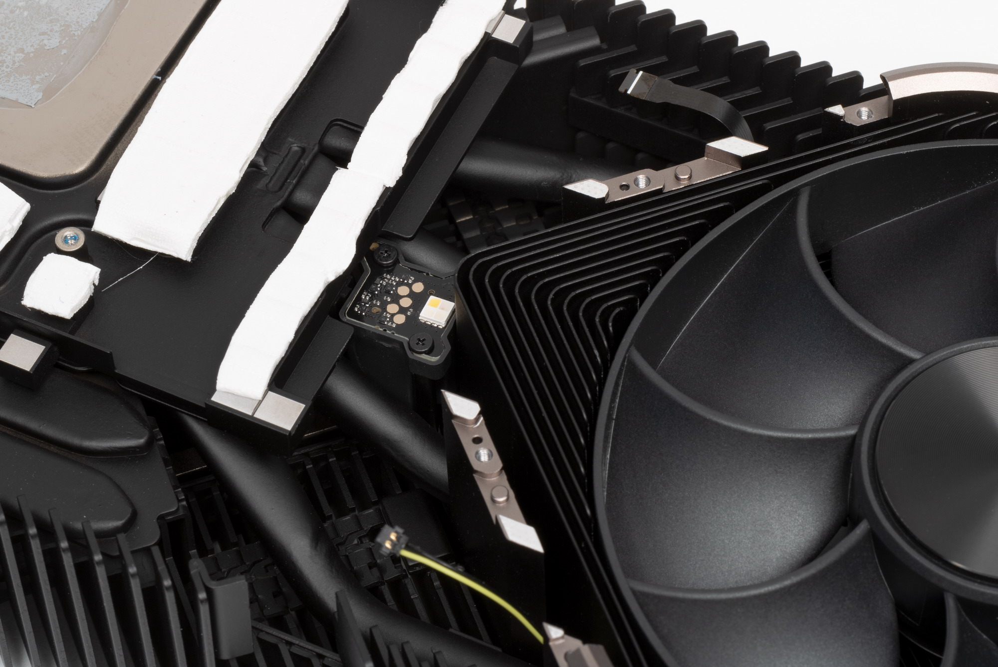 Подсветка имеется на обеих сторонах радиатора, питание ее светодиодов и вентиляторов разведено только с одной стороны, поэтому имеется хитроумный разъем для передачи питания на вторую сторону карты.