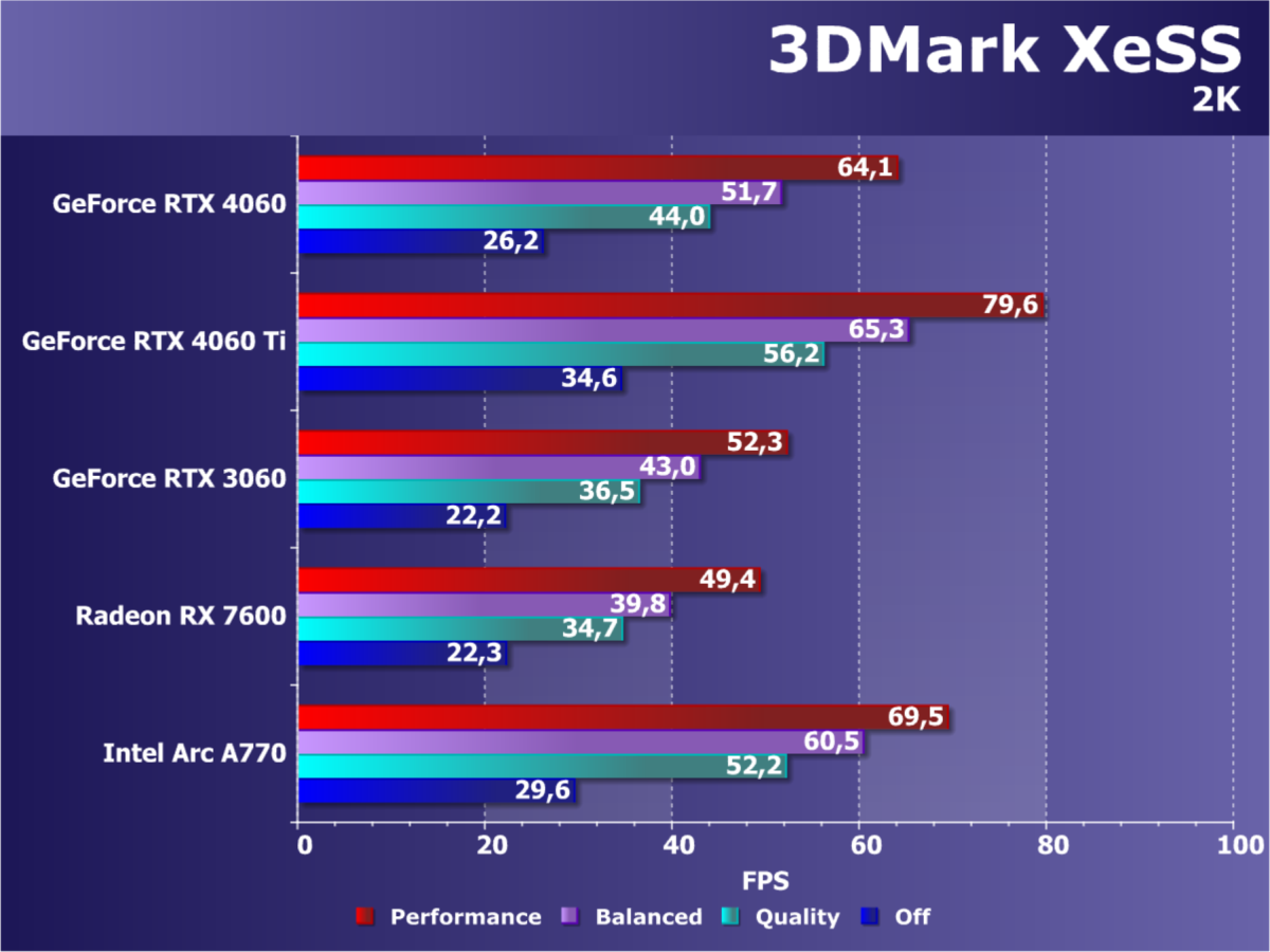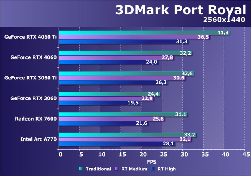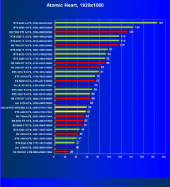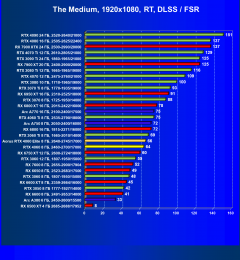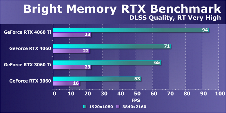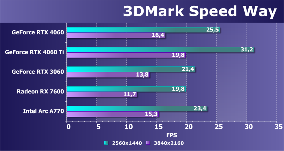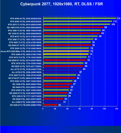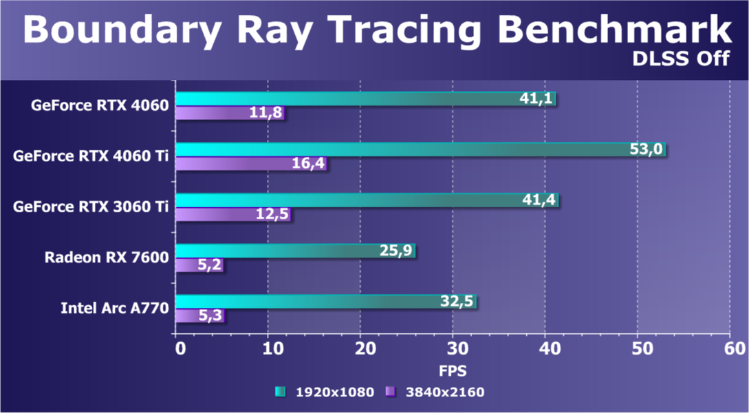 C учетом некоторого падения производительности при активации в играх трассировки лучей (при этом появляется всё больше и больше игр с поддержкой Nvidia DLSS, а эта технология масштабирования позволяет резко поднять производительность, в том числе компенсируя падение от включения RT), а также того факта, что у видеокарт Radeon падение FPS более драматичное, новый ускоритель GeForce RTX 4060 смотрится чуть лучше, уже не проигрывая Intel Arc A770. К тому же, приобретая GeForce RTX 40, игрок получает и поддержку DLSS 3, так что в соответствующих играх можно еще больше поднять FPS. Но всё сказанное относится только к разрешению 1080p (Full HD).