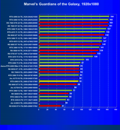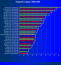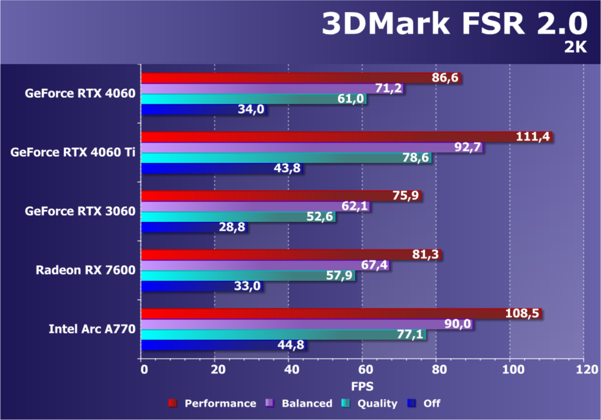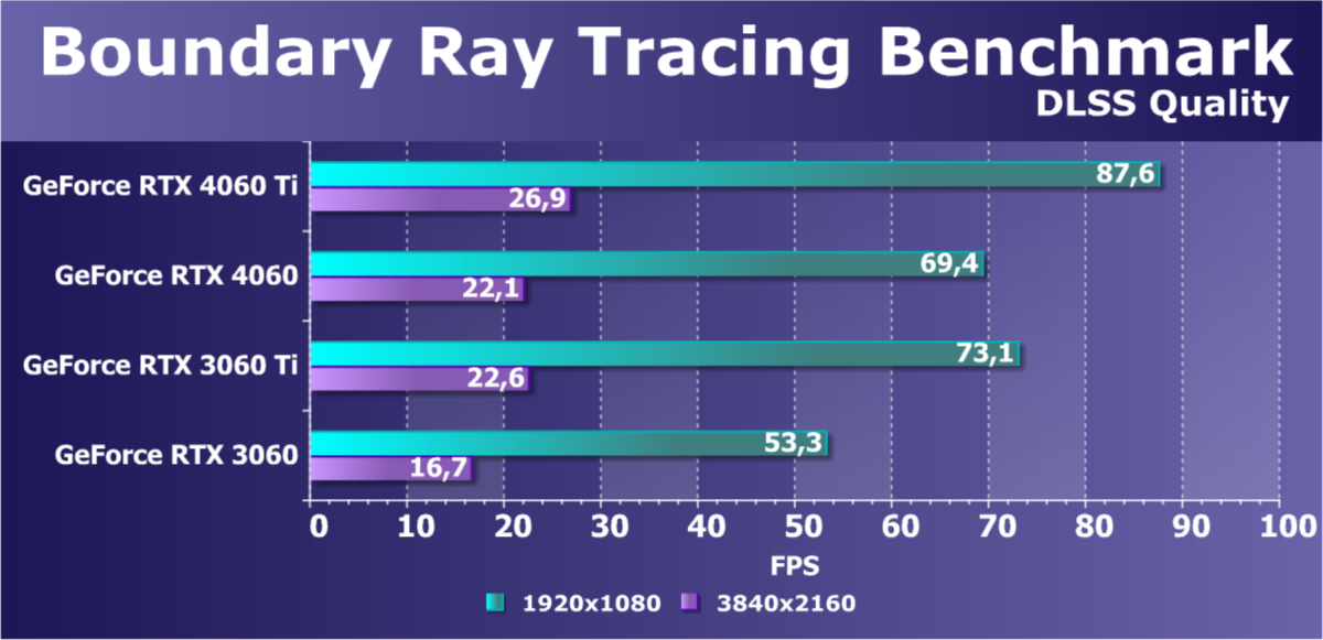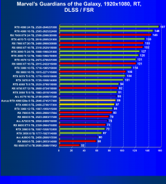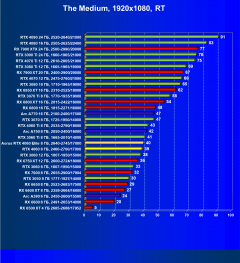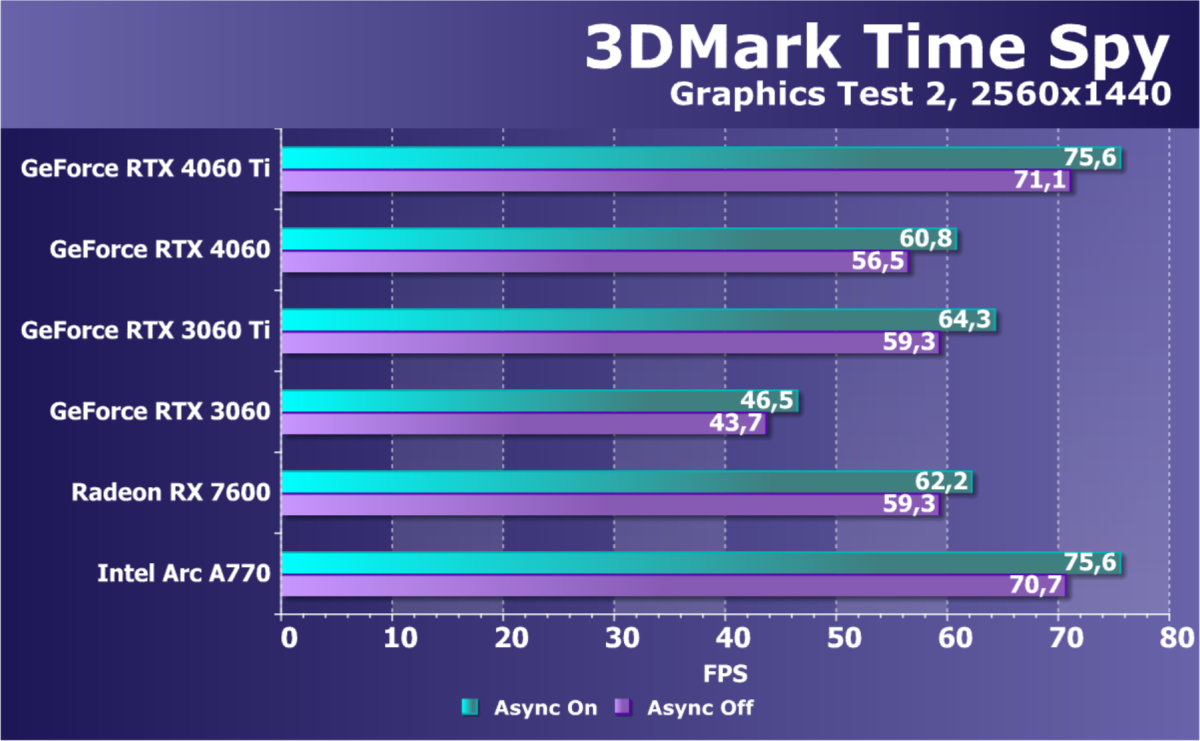 C учетом некоторого падения производительности при активации в играх трассировки лучей (при этом появляется всё больше и больше игр с поддержкой Nvidia DLSS, а эта технология масштабирования позволяет резко поднять производительность, в том числе компенсируя падение от включения RT), а также того факта, что у видеокарт Radeon падение FPS более драматичное, новый ускоритель GeForce RTX 4060 смотрится чуть лучше, уже не проигрывая Intel Arc A770. К тому же, приобретая GeForce RTX 40, игрок получает и поддержку DLSS 3, так что в соответствующих играх можно еще больше поднять FPS. Но всё сказанное относится только к разрешению 1080p (Full HD).