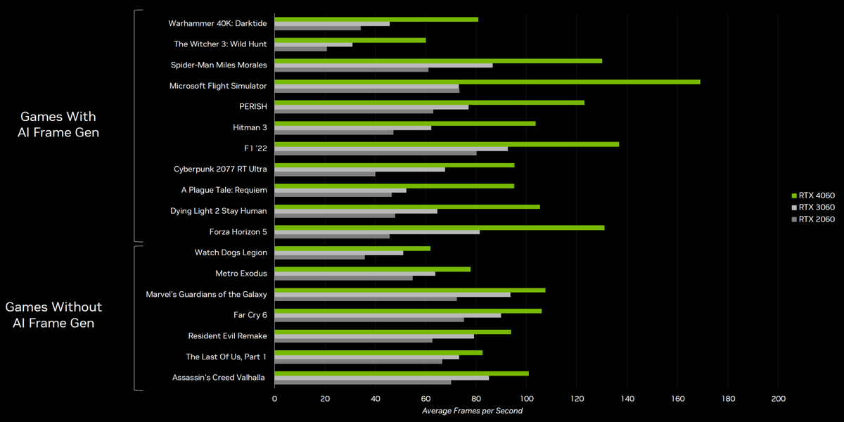 Что касается производительности в играх, то GeForce RTX 4060 предлагает скорость рендеринга где-то между RTX 3060 и RTX 3060 Ti — с возможностью дополнительного увеличения частоты кадров в играх с поддержкой технологии DLSS 3. На системе с процессором Intel Core i9-12900K в Full HD-разрешении при максимальных настройках и с включенными трассировкой лучей и DLSS в играх с их поддержкой новая модель показывает следующую производительность относительно своих предшественниц RTX 3060 и RTX 2060: