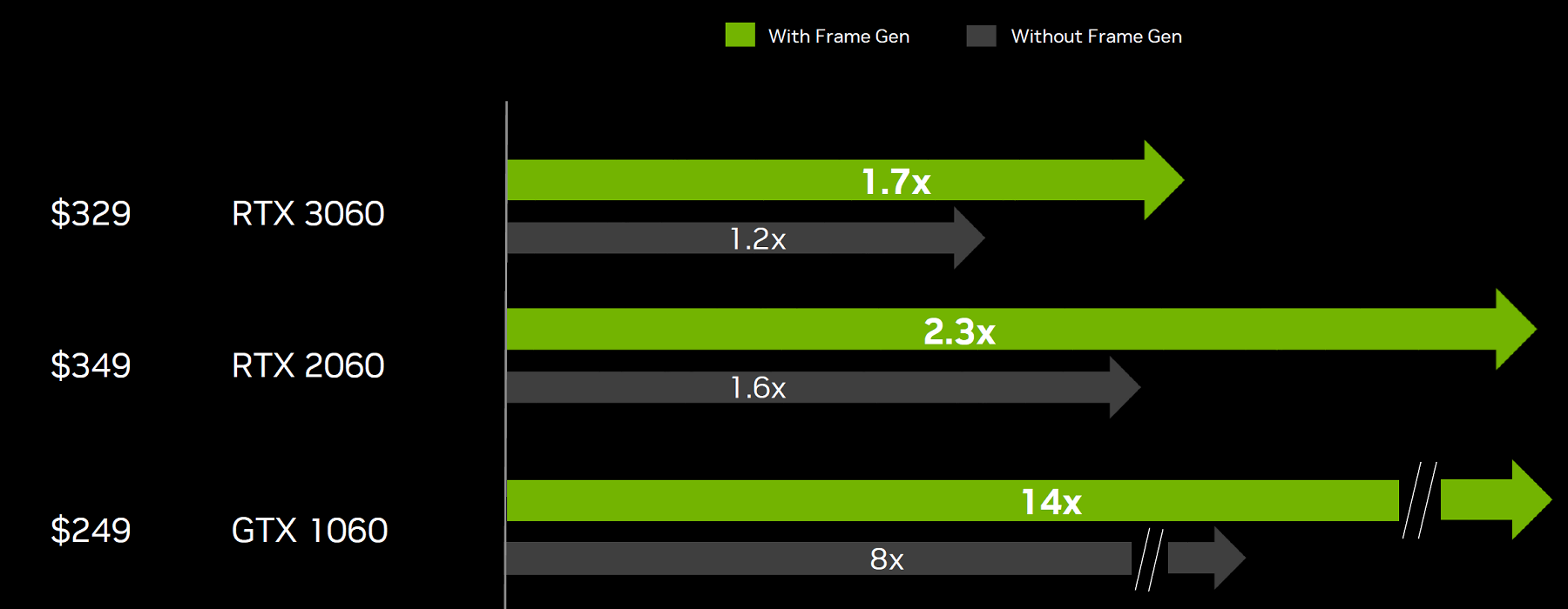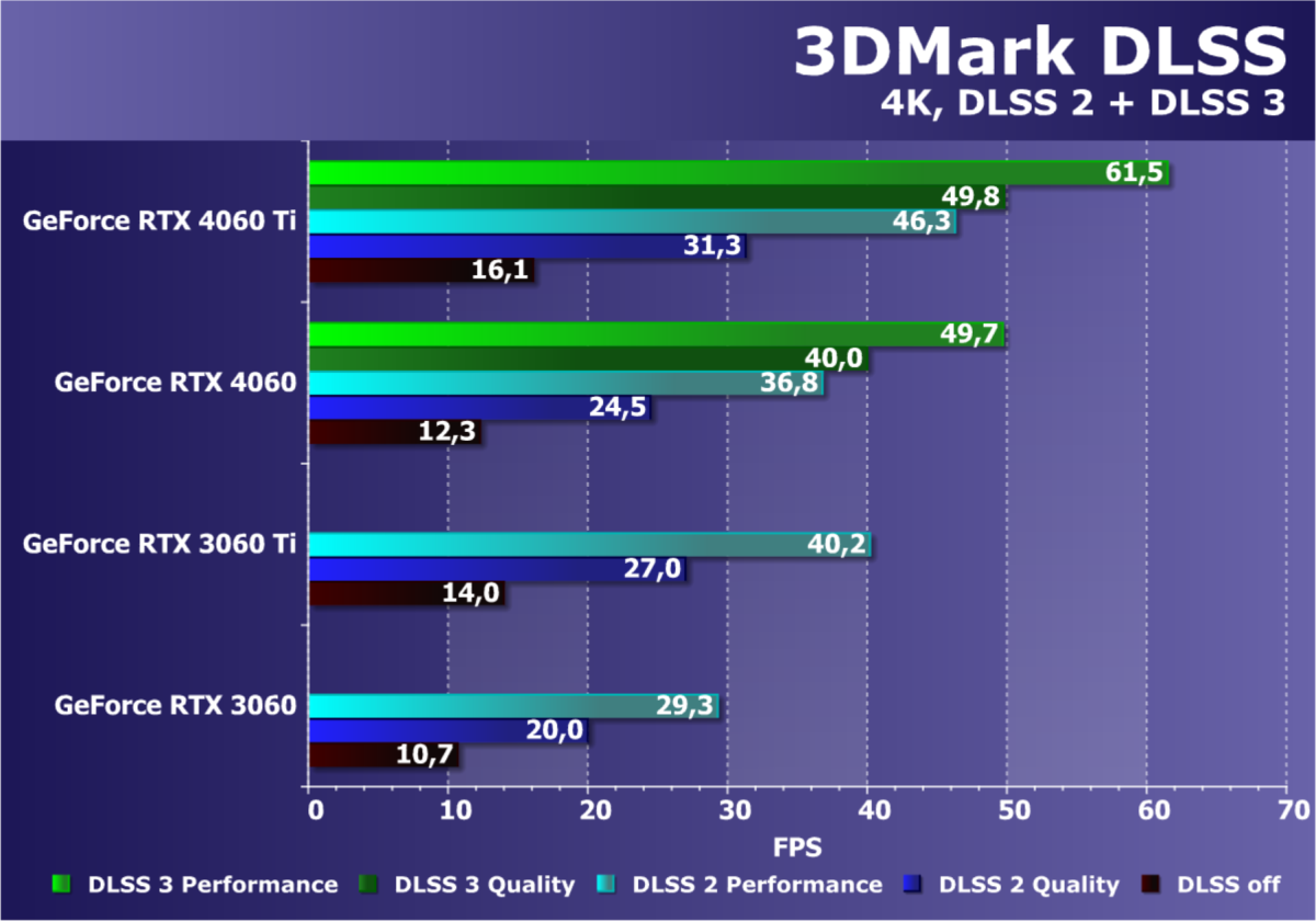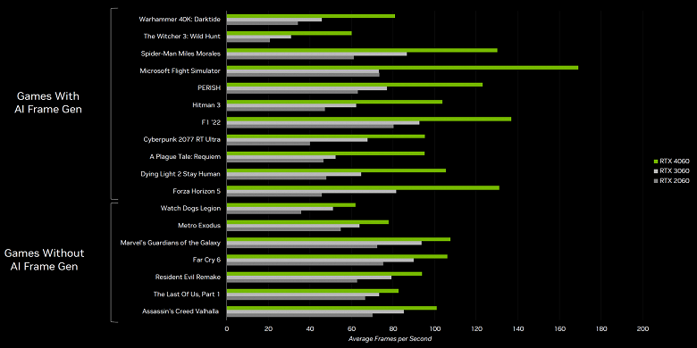 Одним из явных преимуществ GeForce RTX 4060 перед аналогичными по мощности GPU предыдущего поколения и конкурирующими решениями AMD является поддержка генерации кадров технологией DLSS 3, которой лишены все видеокарты RTX 30. За счет этого RTX 4060 может обеспечить большую частоту кадров даже по сравнению с более мощными видеокартами серии RTX 30. Технология генерации промежуточных кадров уже поддерживается в нескольких десятках игр и приложений, и практически во всех из них на GeForce RTX 4060 обеспечивается приемлемый комфорт при игре в Full HD-разрешении.