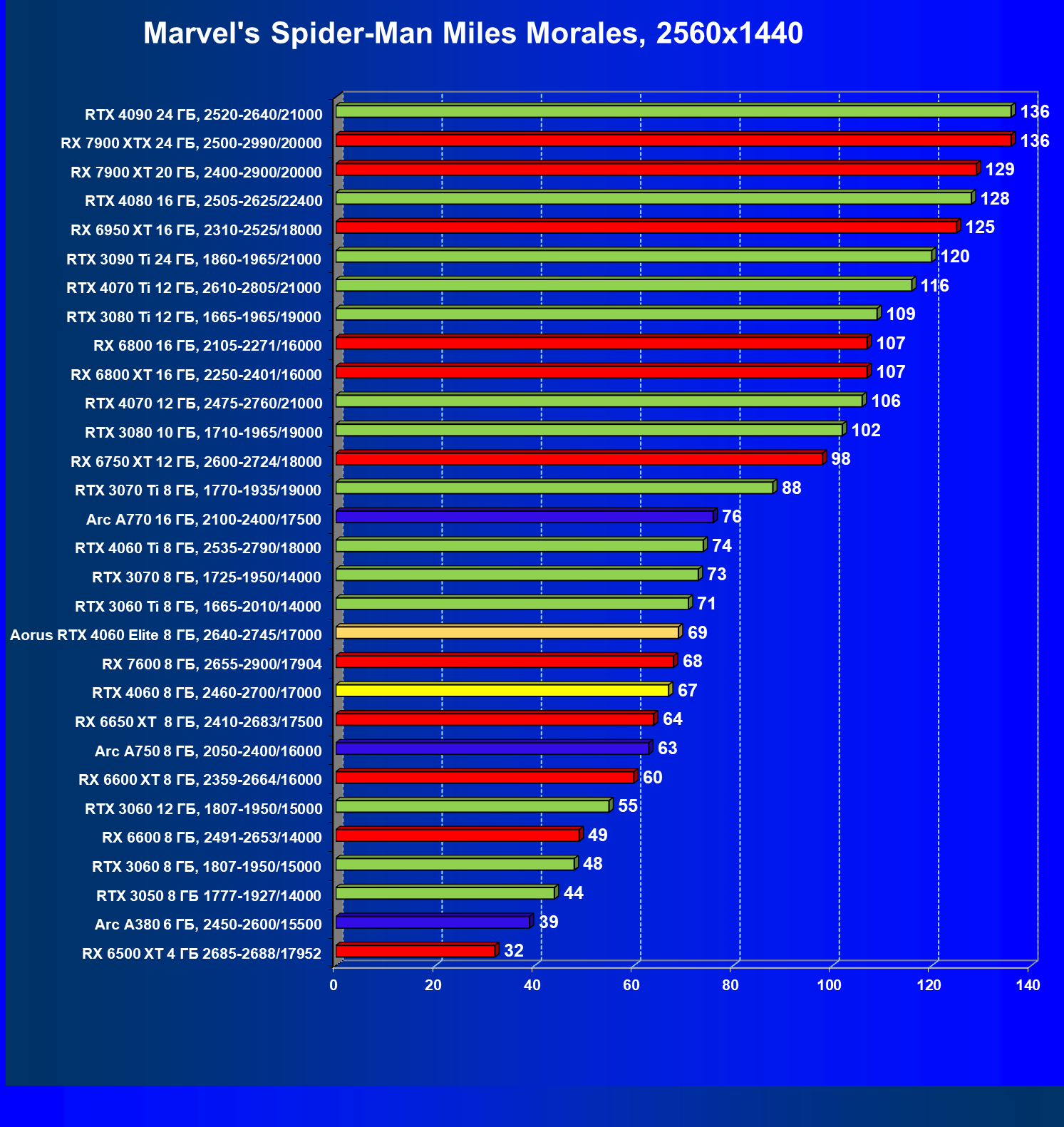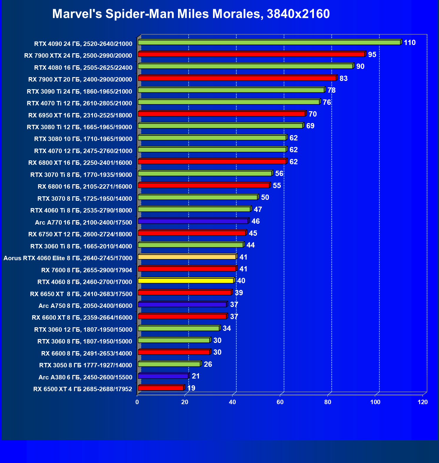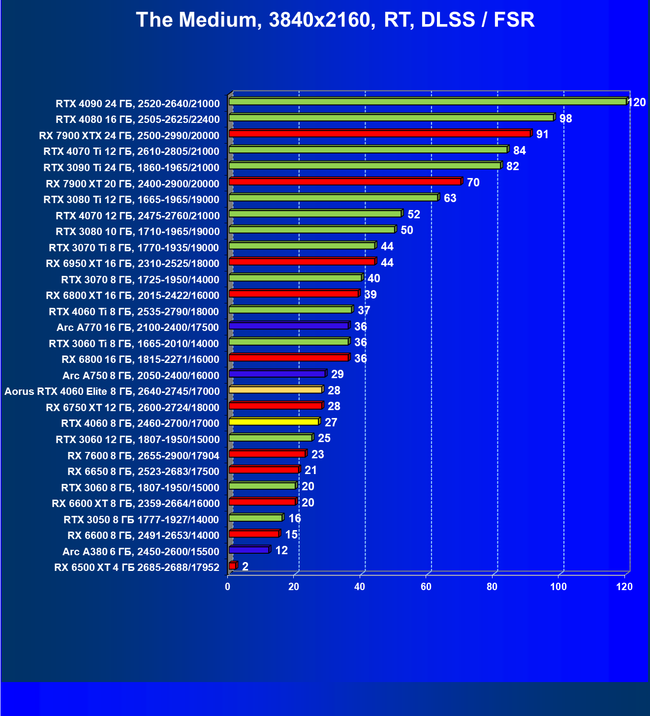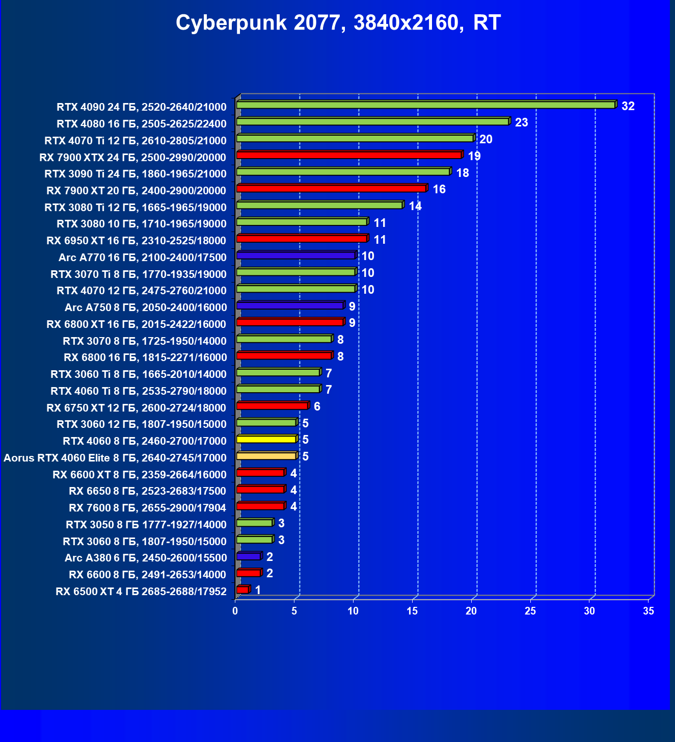 | 21 | Arc A750 8 ГБ, 2050—2400/16000 | 396 | 113 | 35 000 |