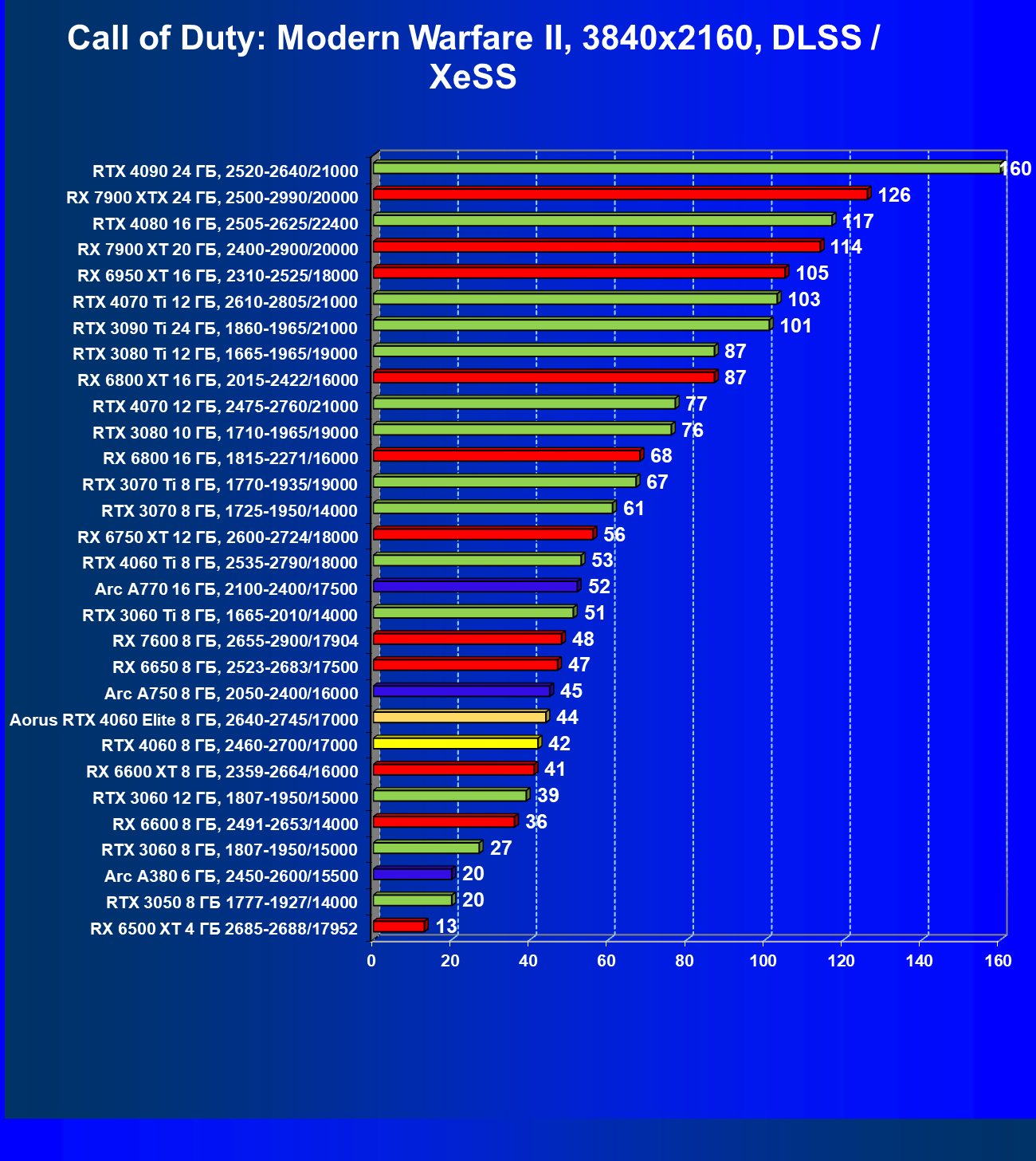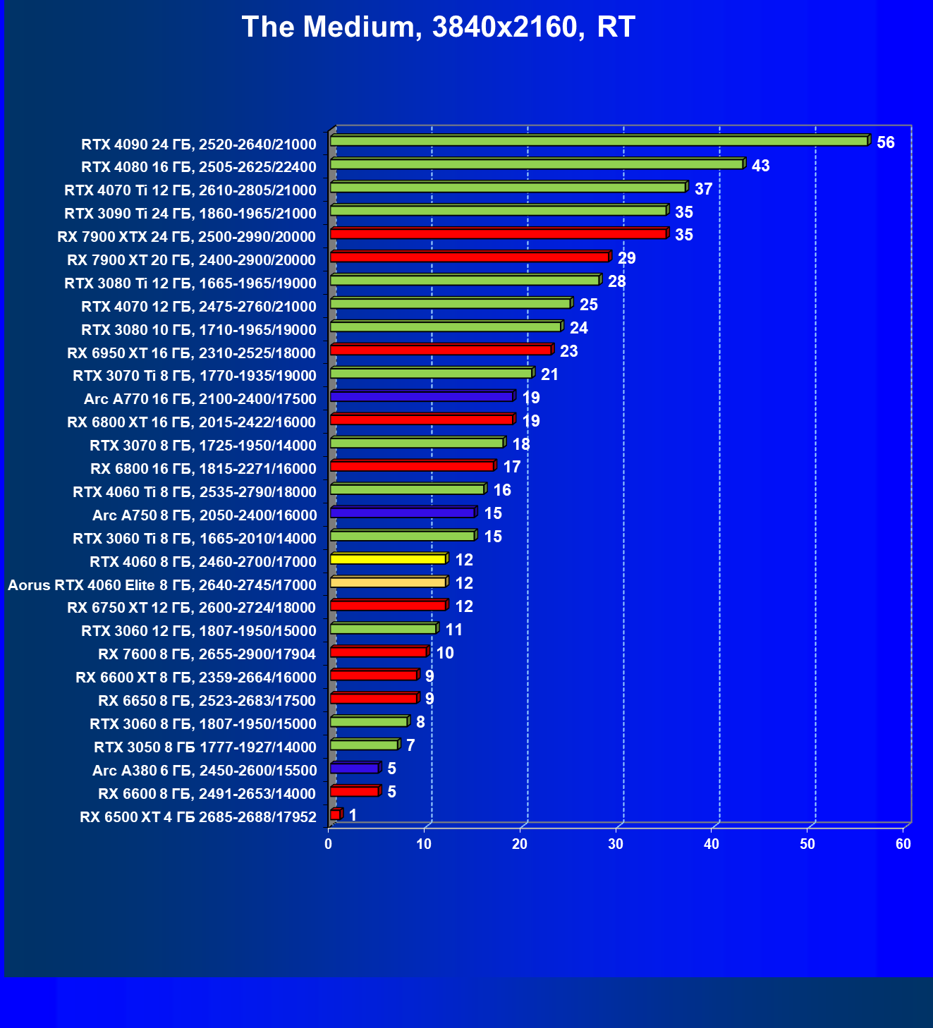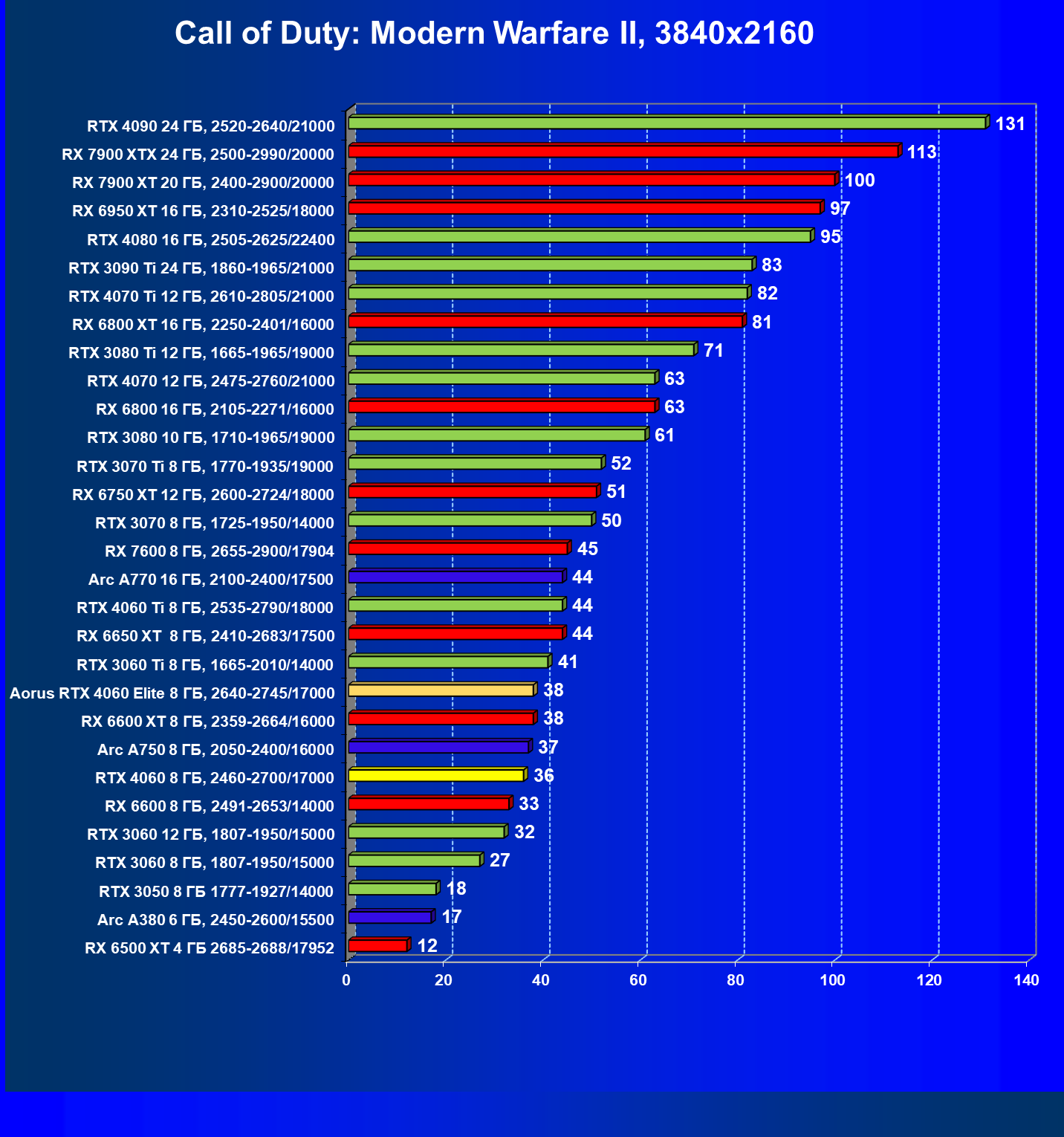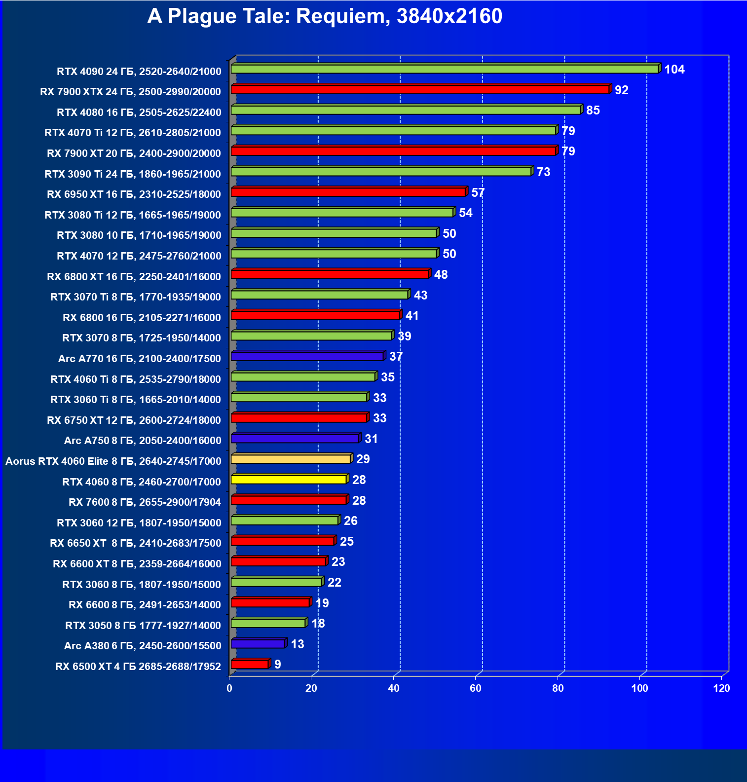 | 21 | Arc A750 8 ГБ, 2050—2400/16000 | 396 | 113 | 35 000 |