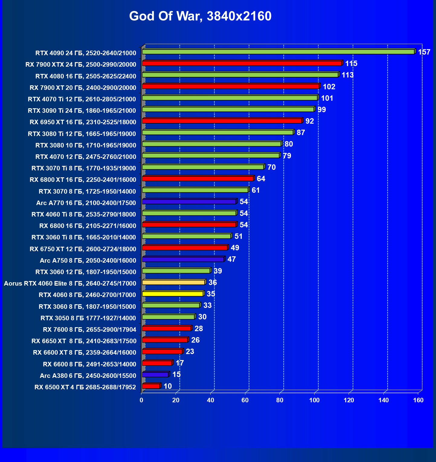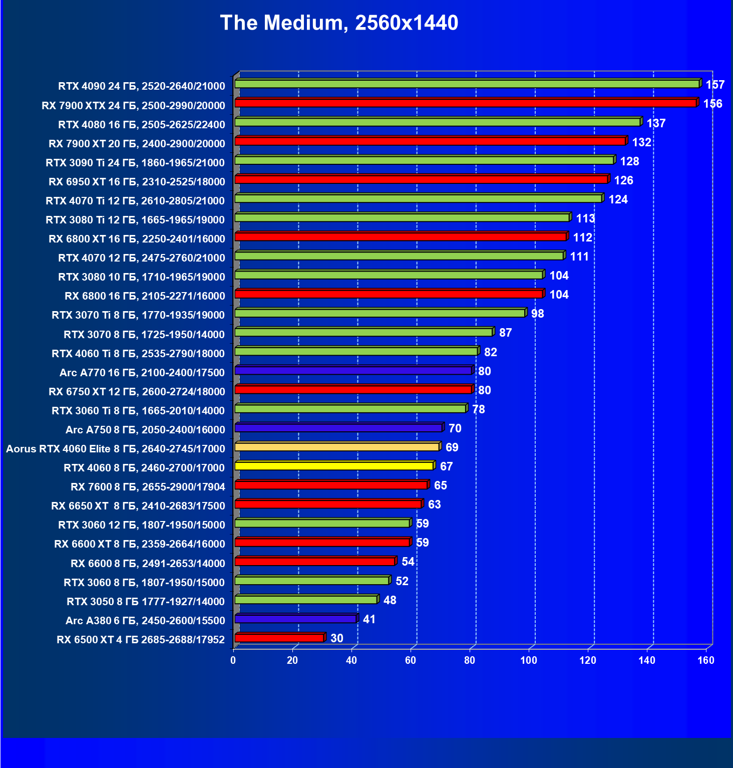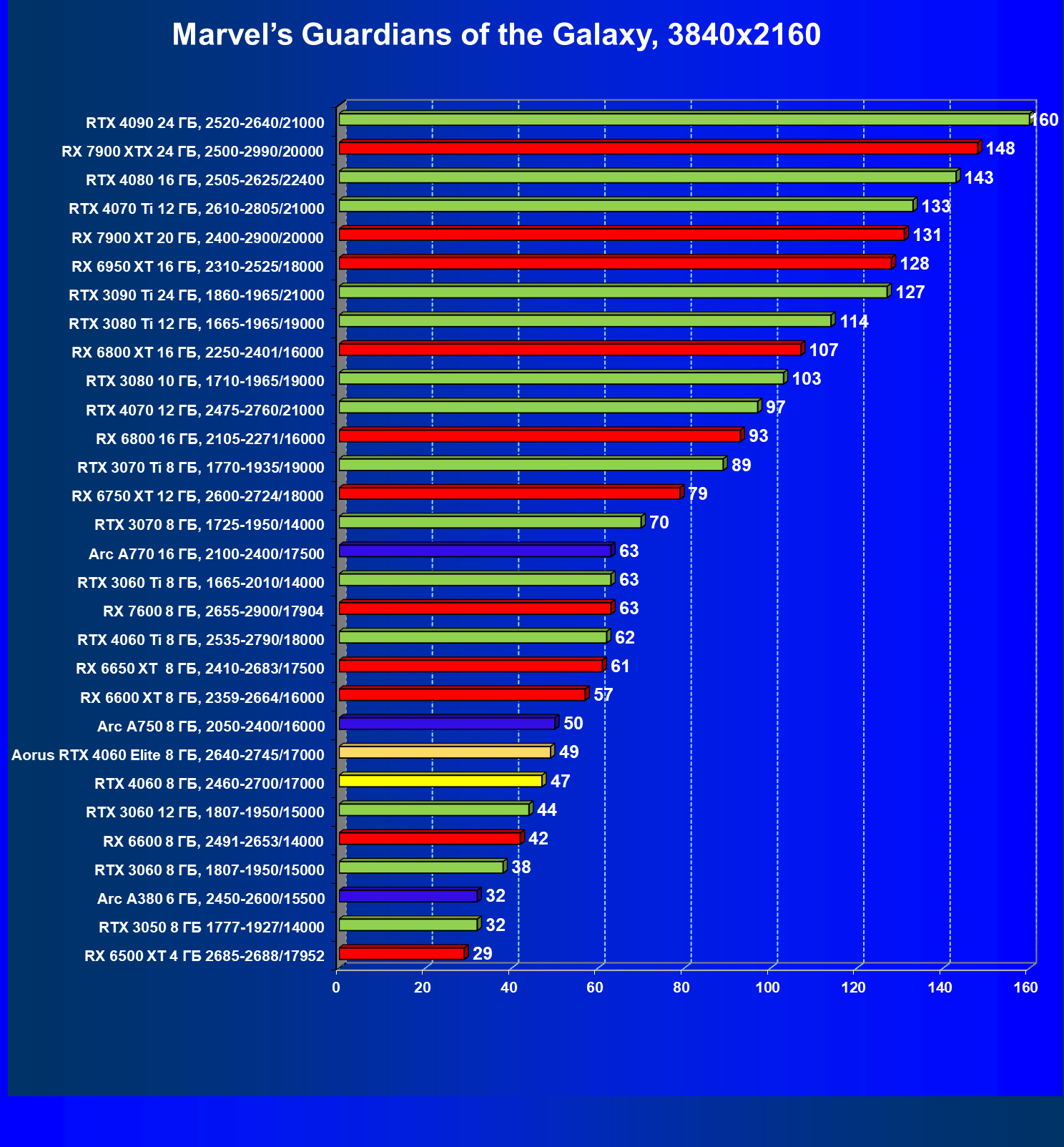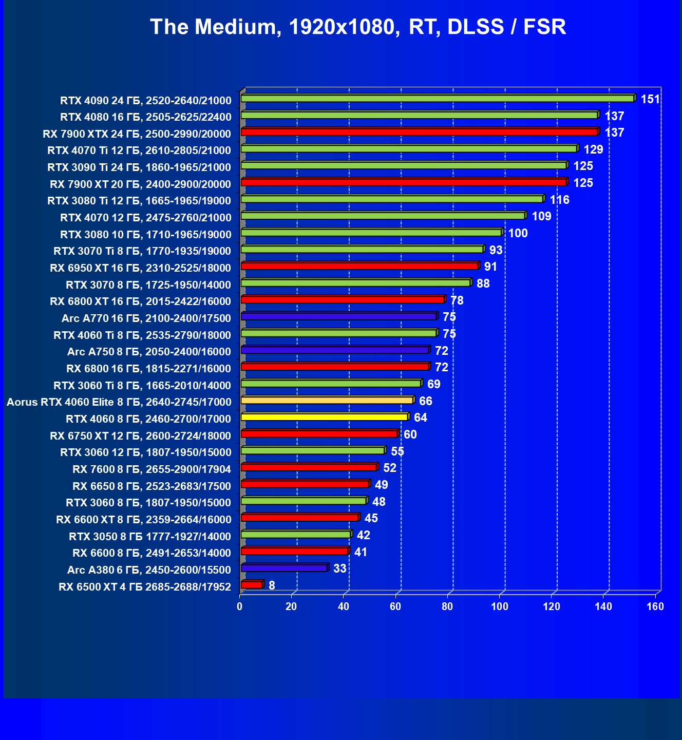 | 21 | Arc A750 8 ГБ, 2050—2400/16000 | 396 | 113 | 35 000 |