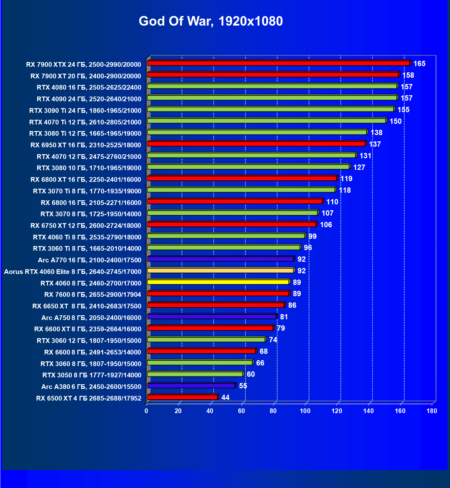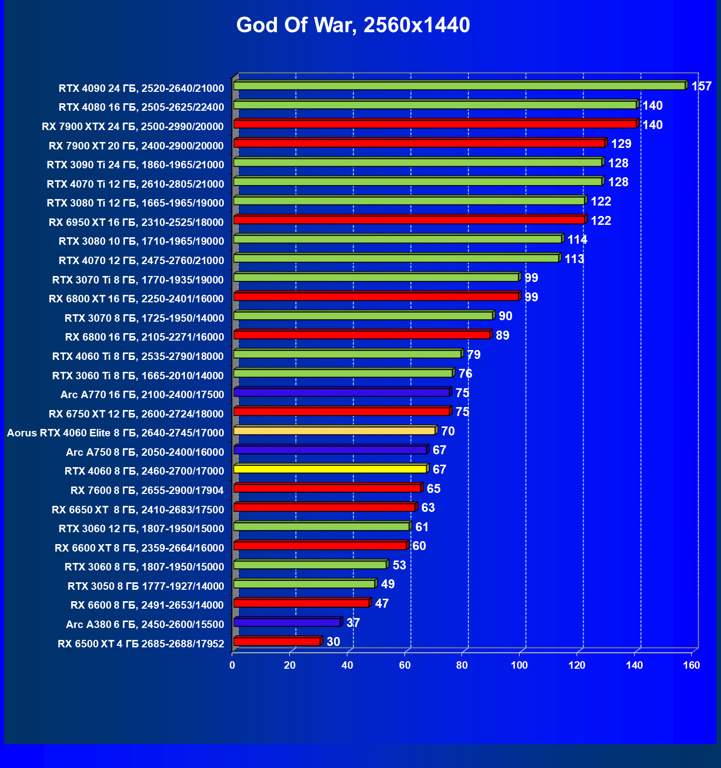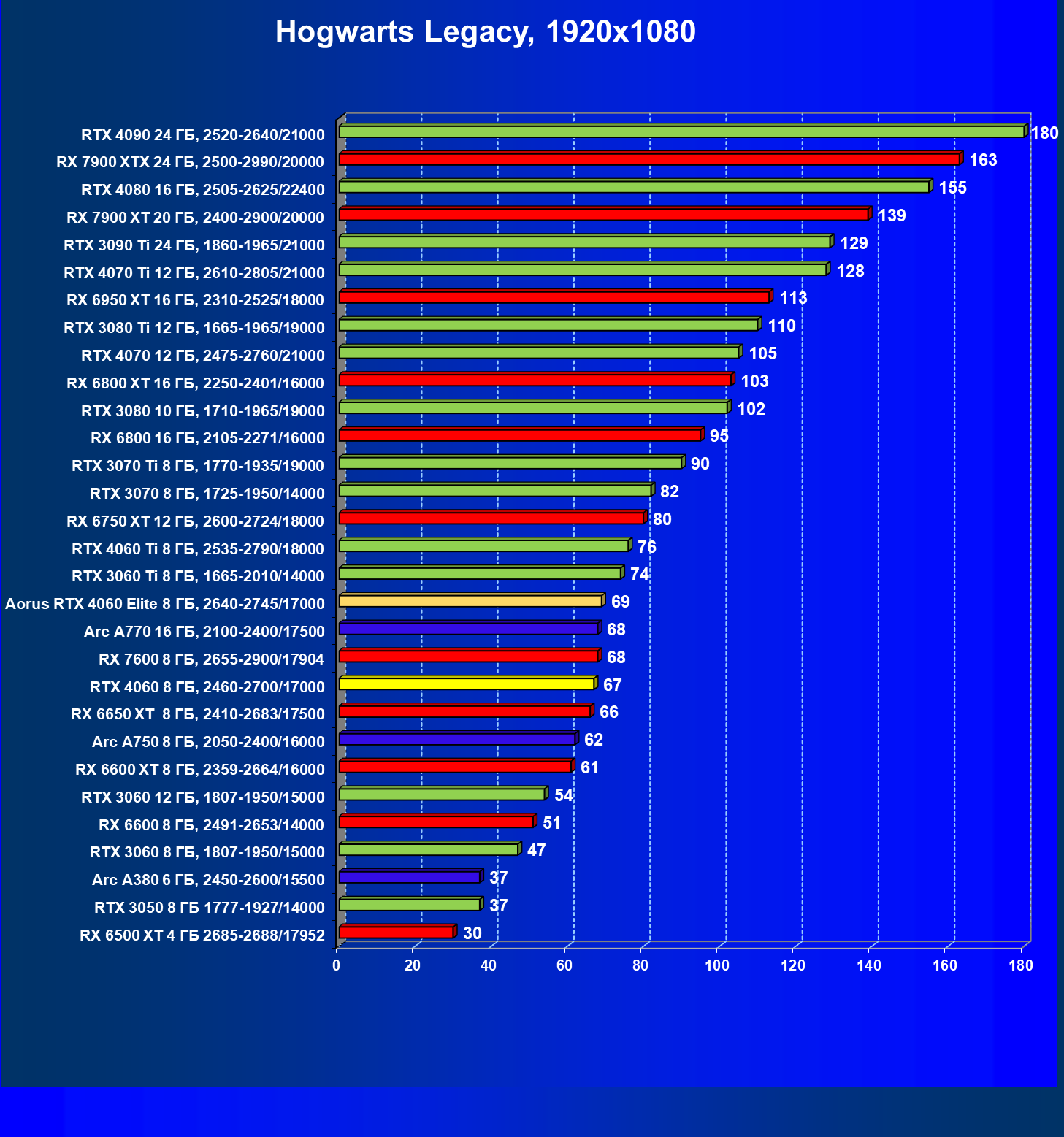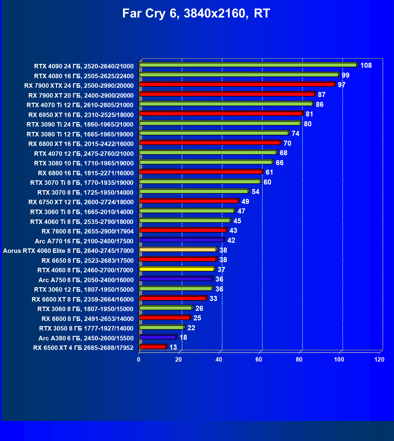 | 21 | Arc A750 8 ГБ, 2050—2400/16000 | 396 | 113 | 35 000 |