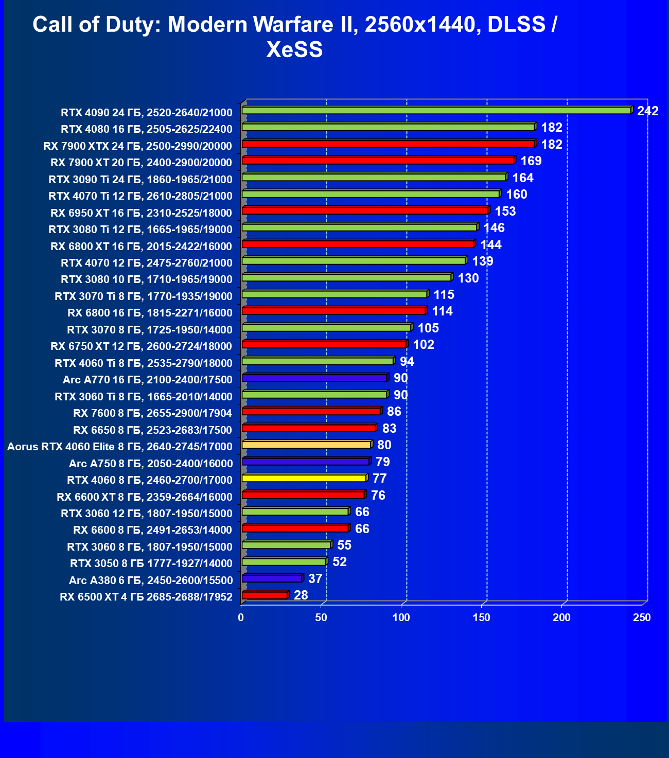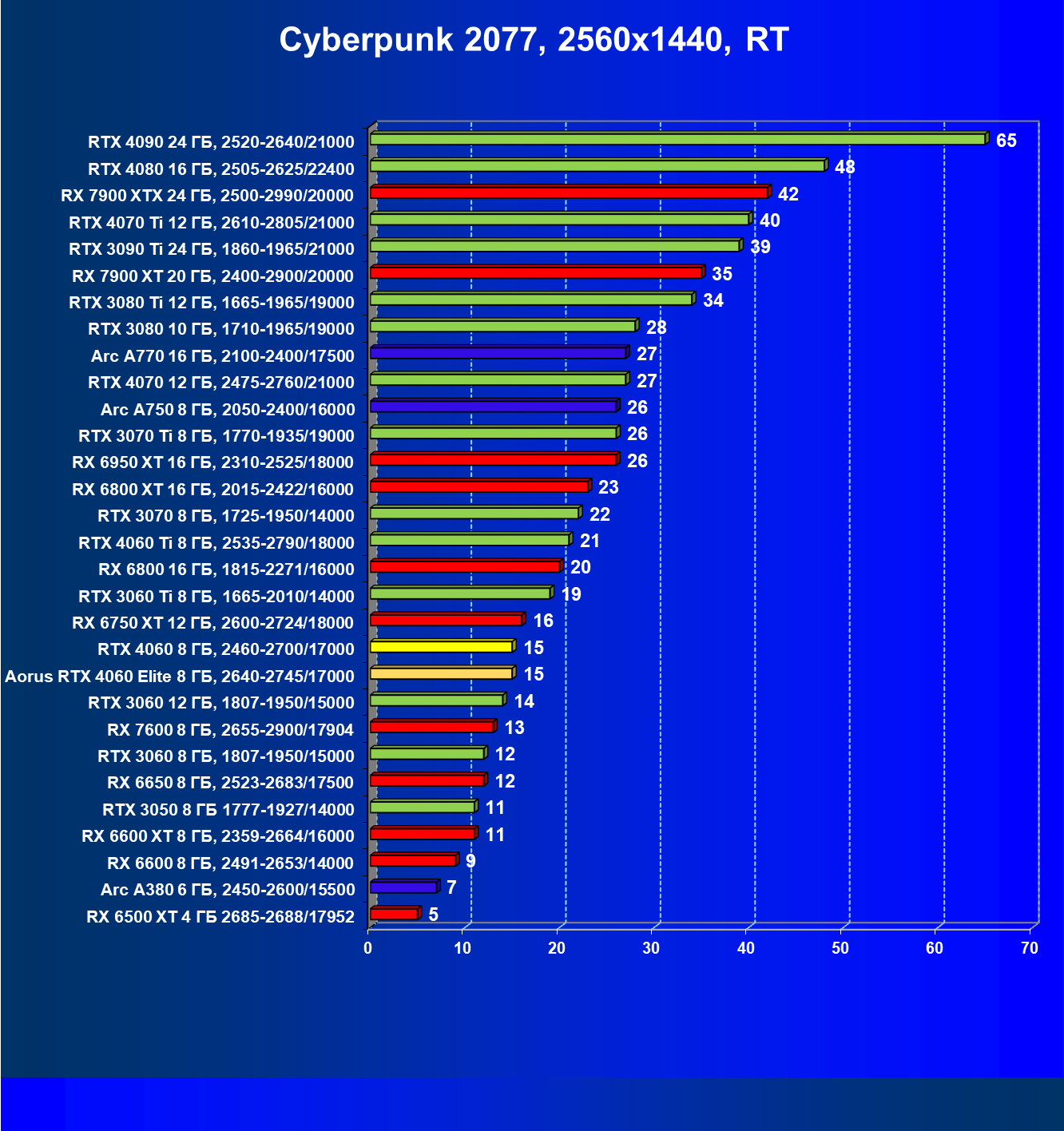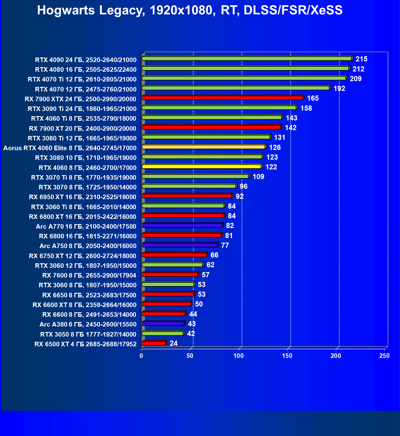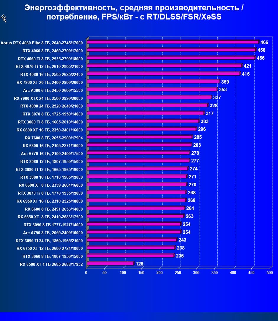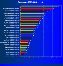 | 21 | Arc A750 8 ГБ, 2050—2400/16000 | 278 | 79 | 35 000 |