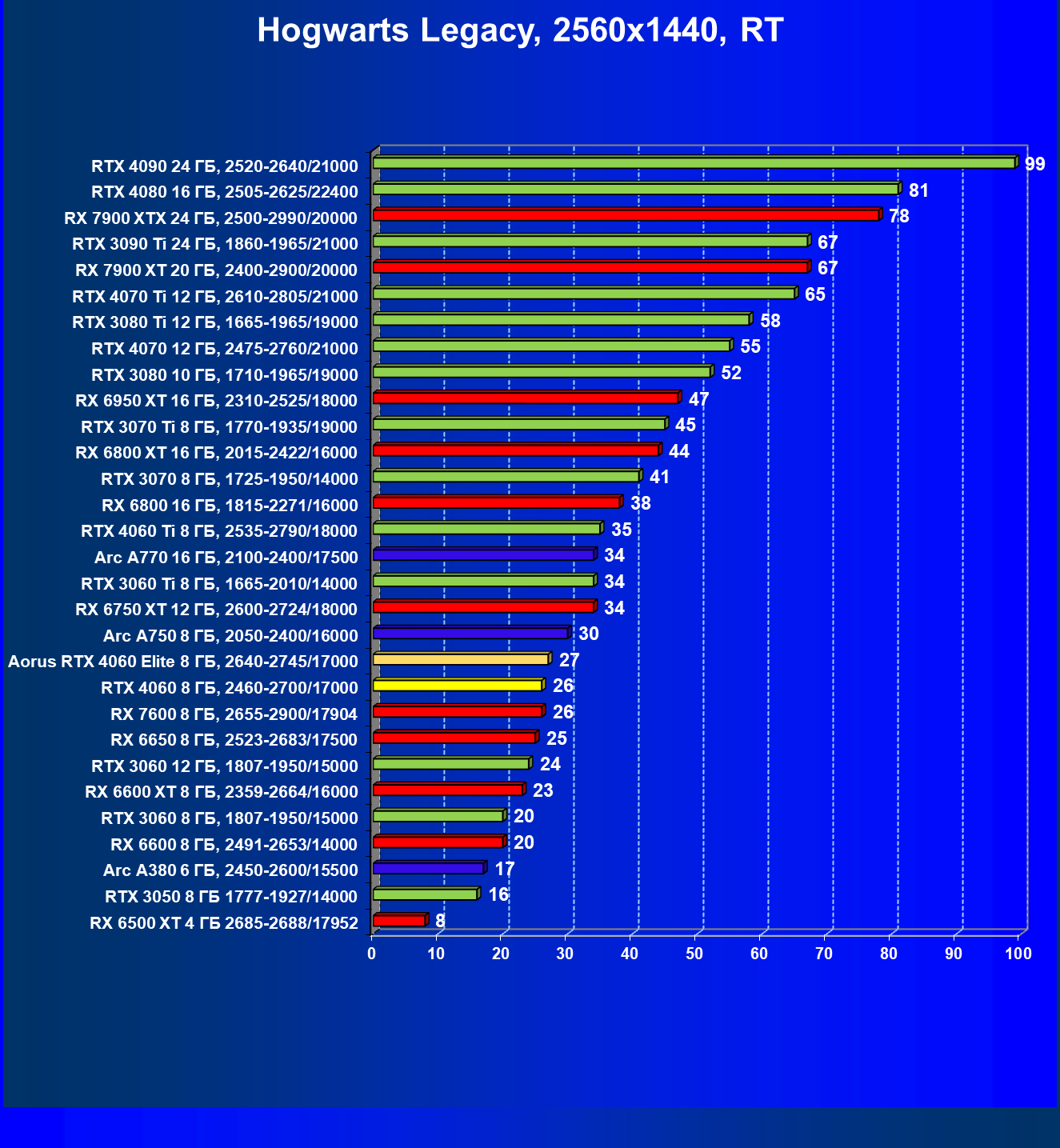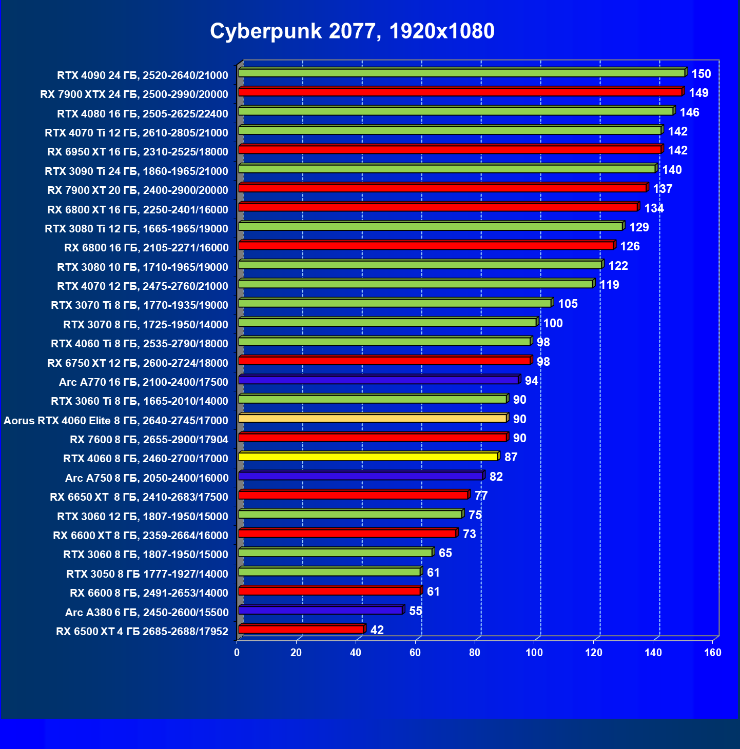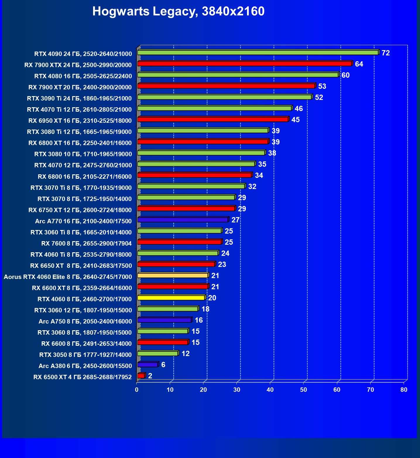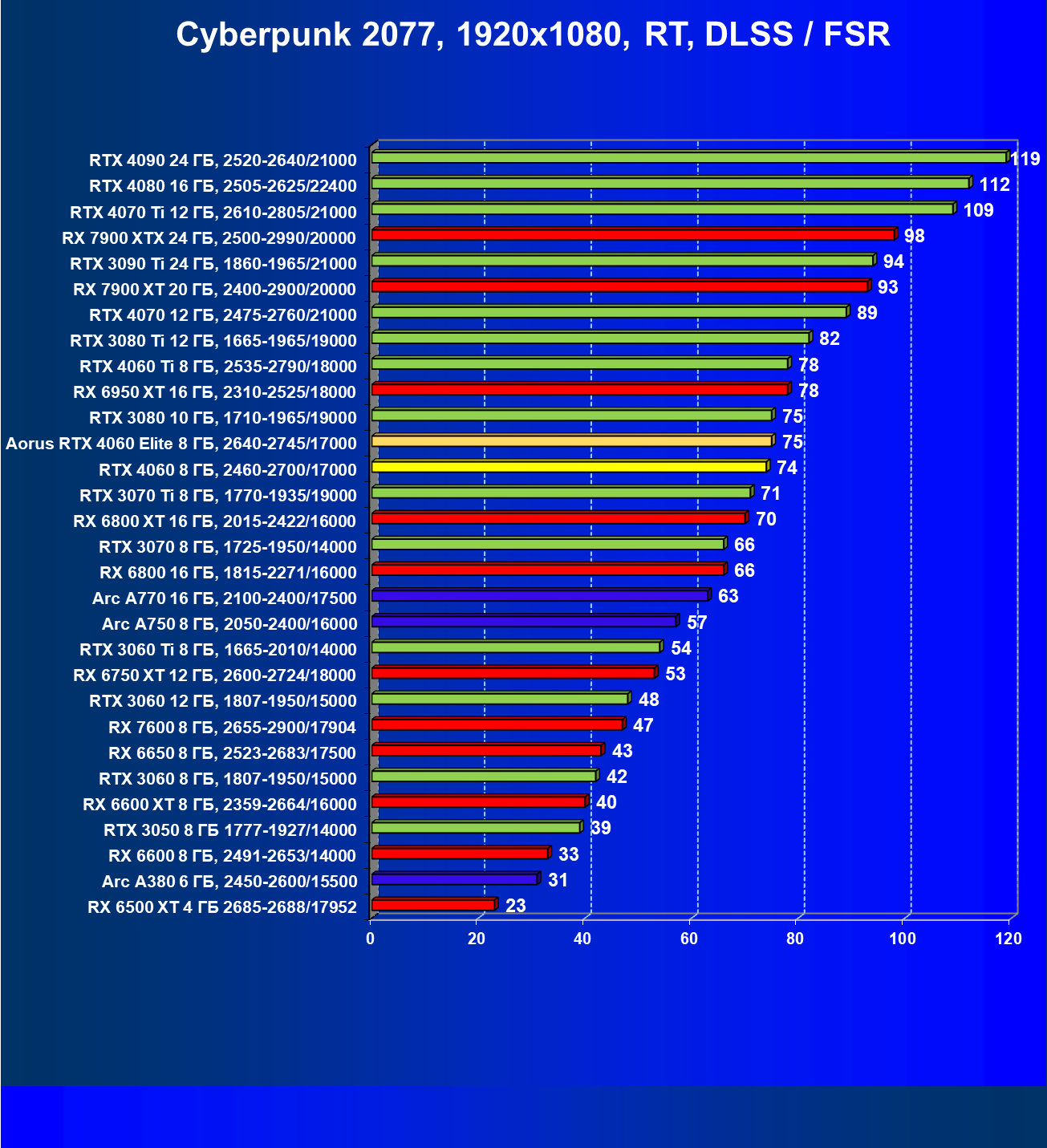| 21 | Arc A750 8 ГБ, 2050—2400/16000 | 278 | 79 | 35 000 |