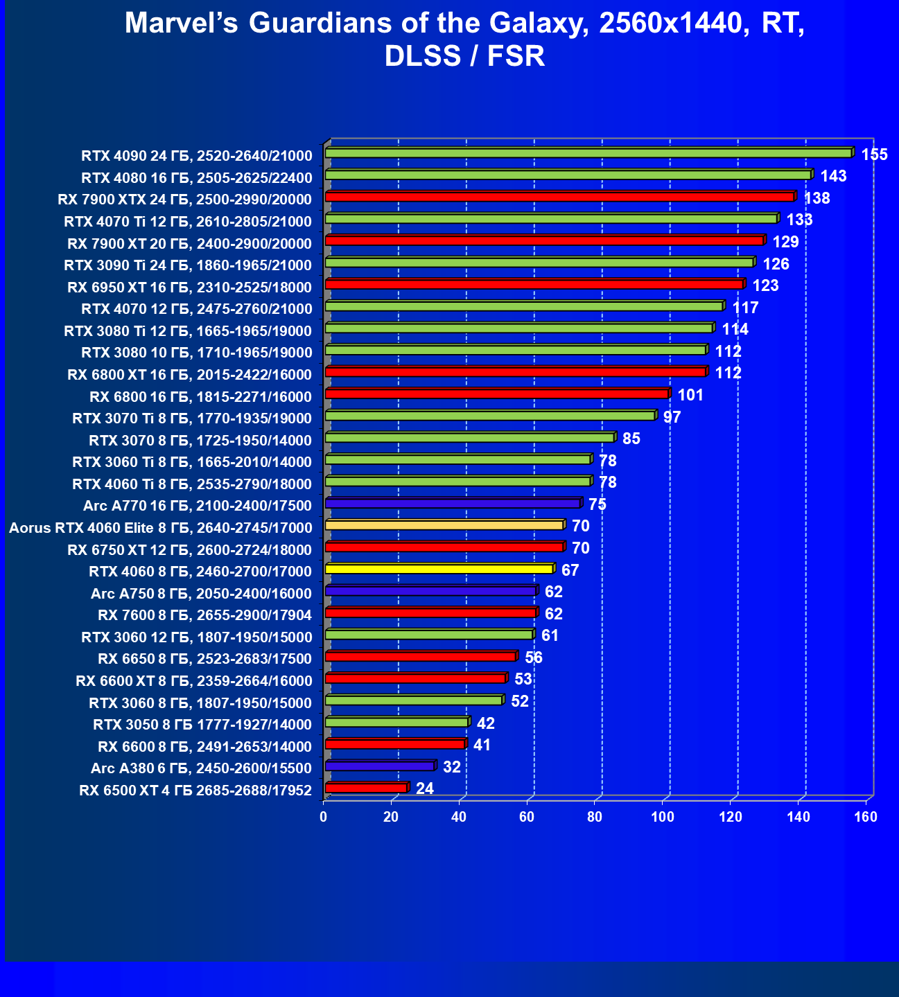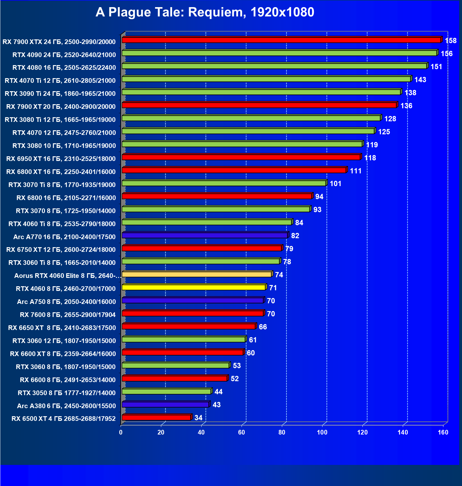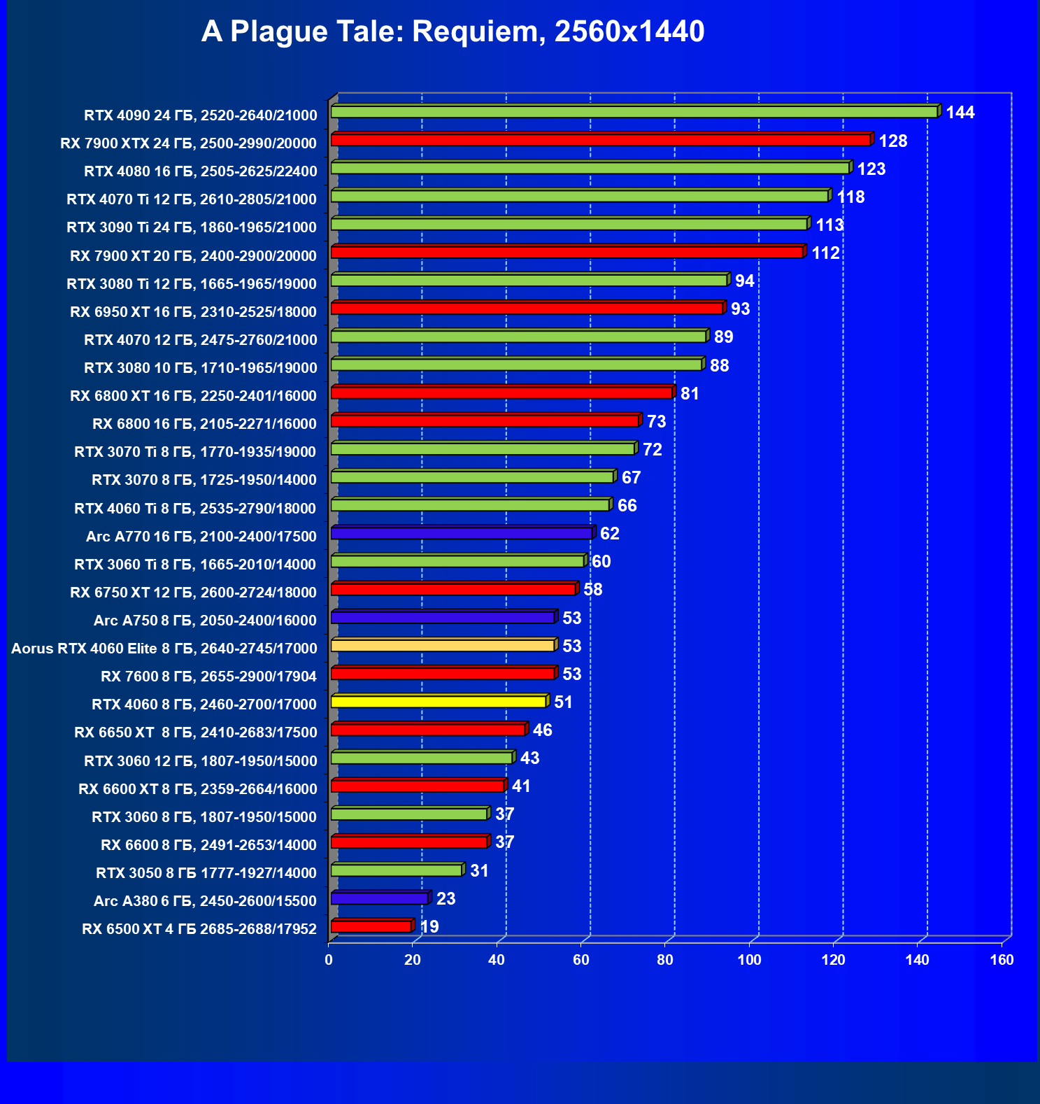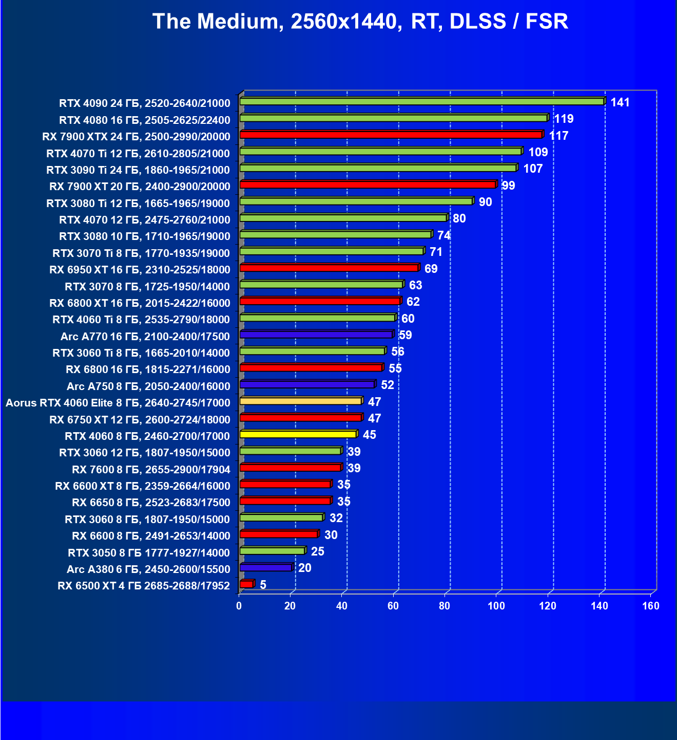 | 21 | Arc A750 8 ГБ, 2050—2400/16000 | 278 | 79 | 35 000 |