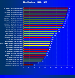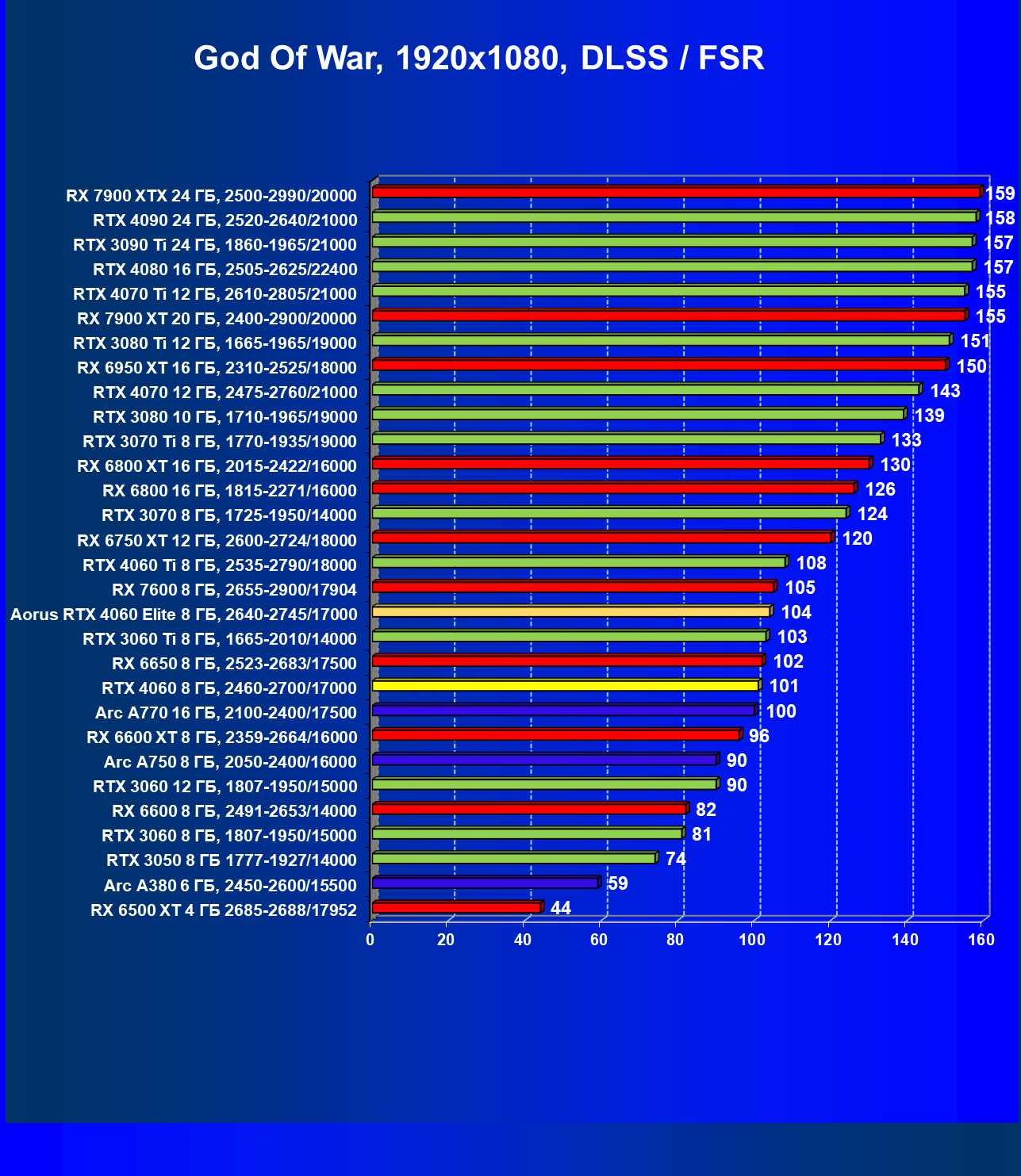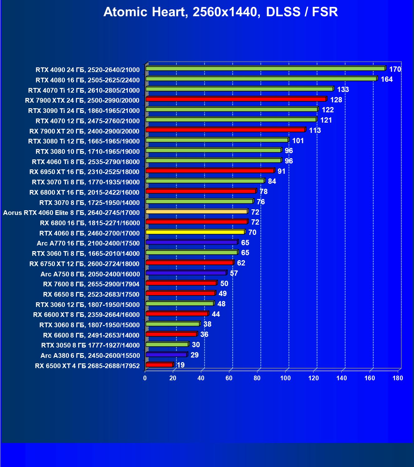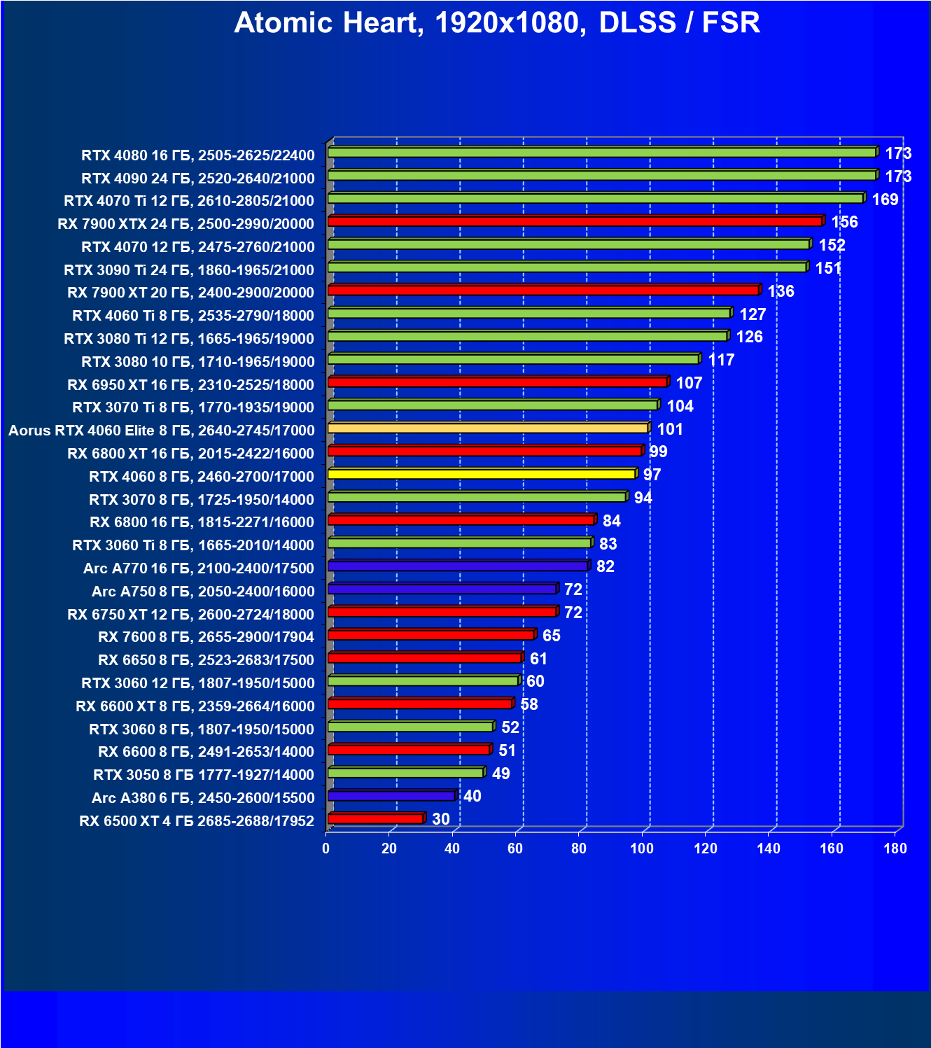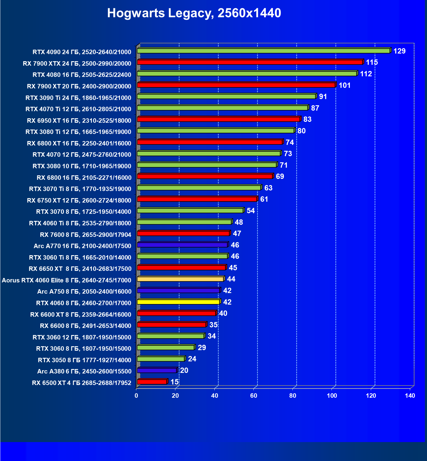 | 21 | Arc A750 8 ГБ, 2050—2400/16000 | 278 | 79 | 35 000 |