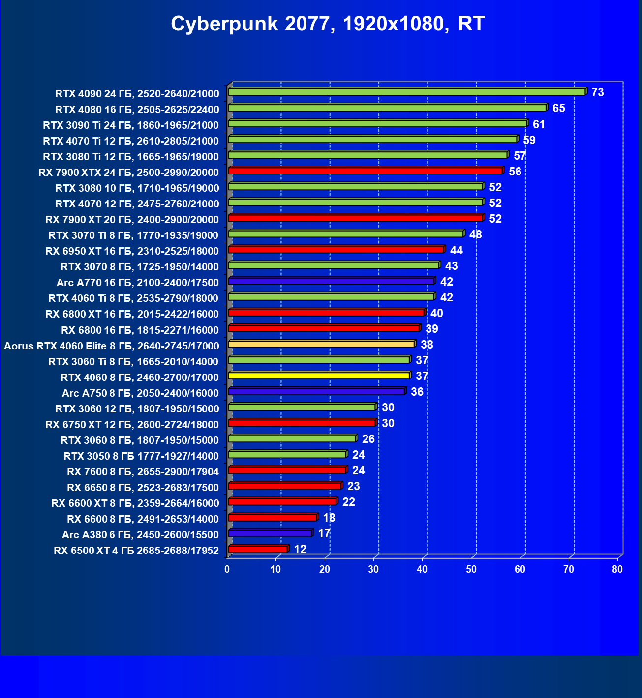 | 14 | Arc A750 8 ГБ, 2050—2400/16000 | 79 | 278 | 35 000 |