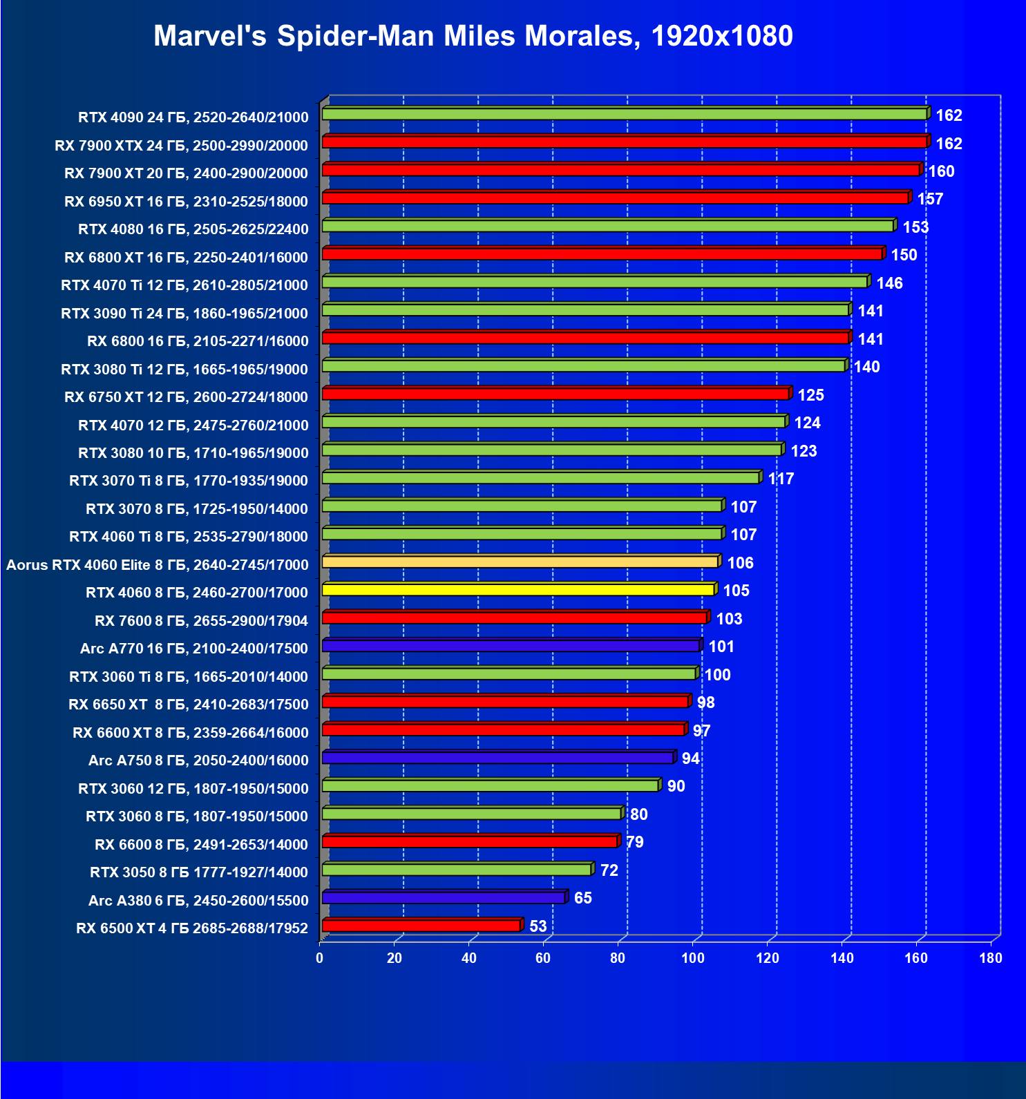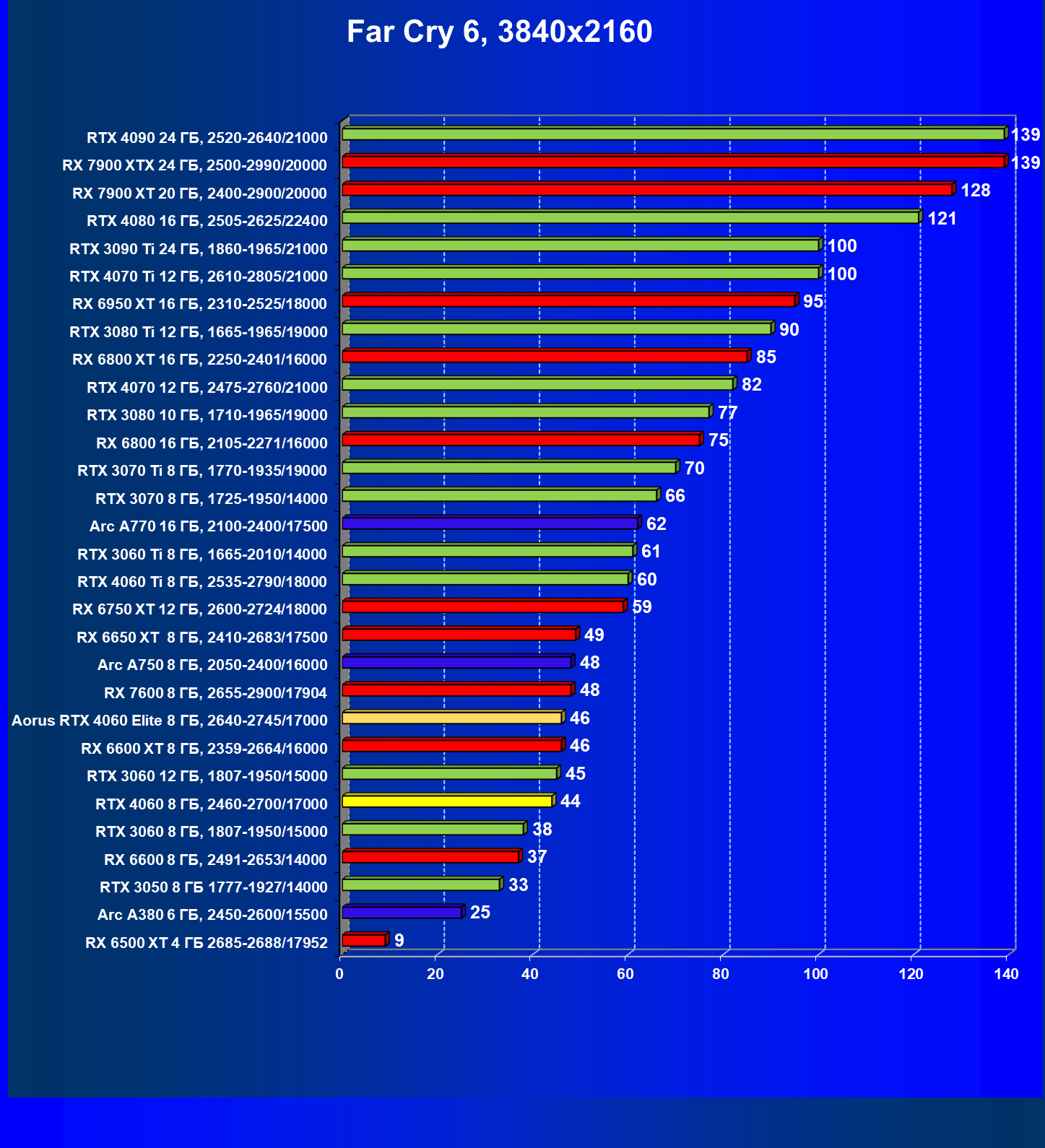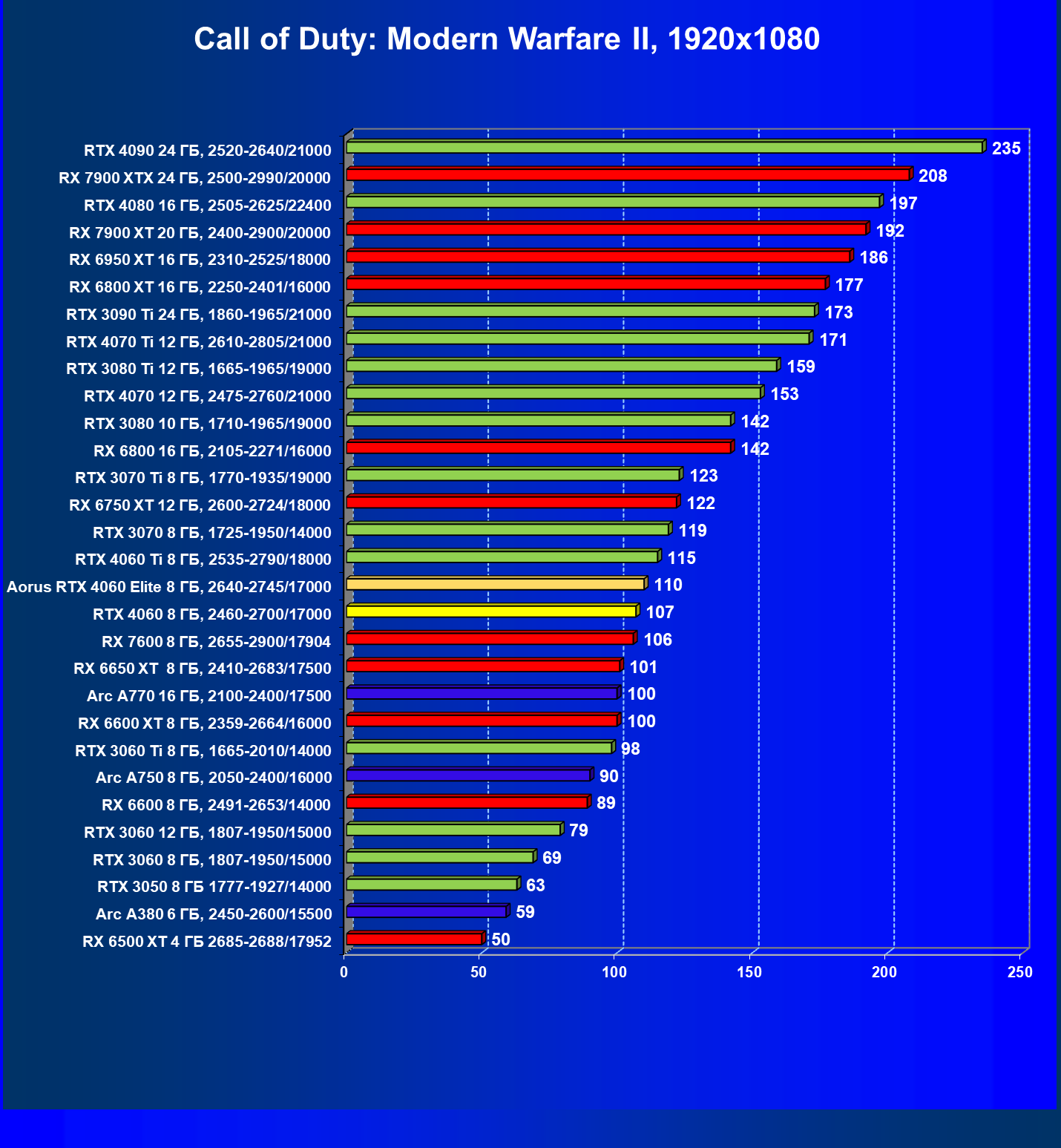 | 10 | Arc A750 8 ГБ, 2050—2400/16000 | 113 | 396 | 35 000 |