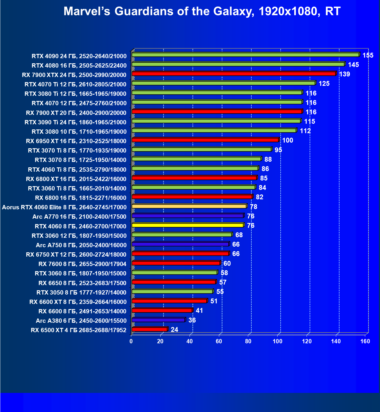 | 18 | Aorus RTX 4060 Elite 8 ГБ, 2640—2745/17000 | 105 | 450 | 43 000 |