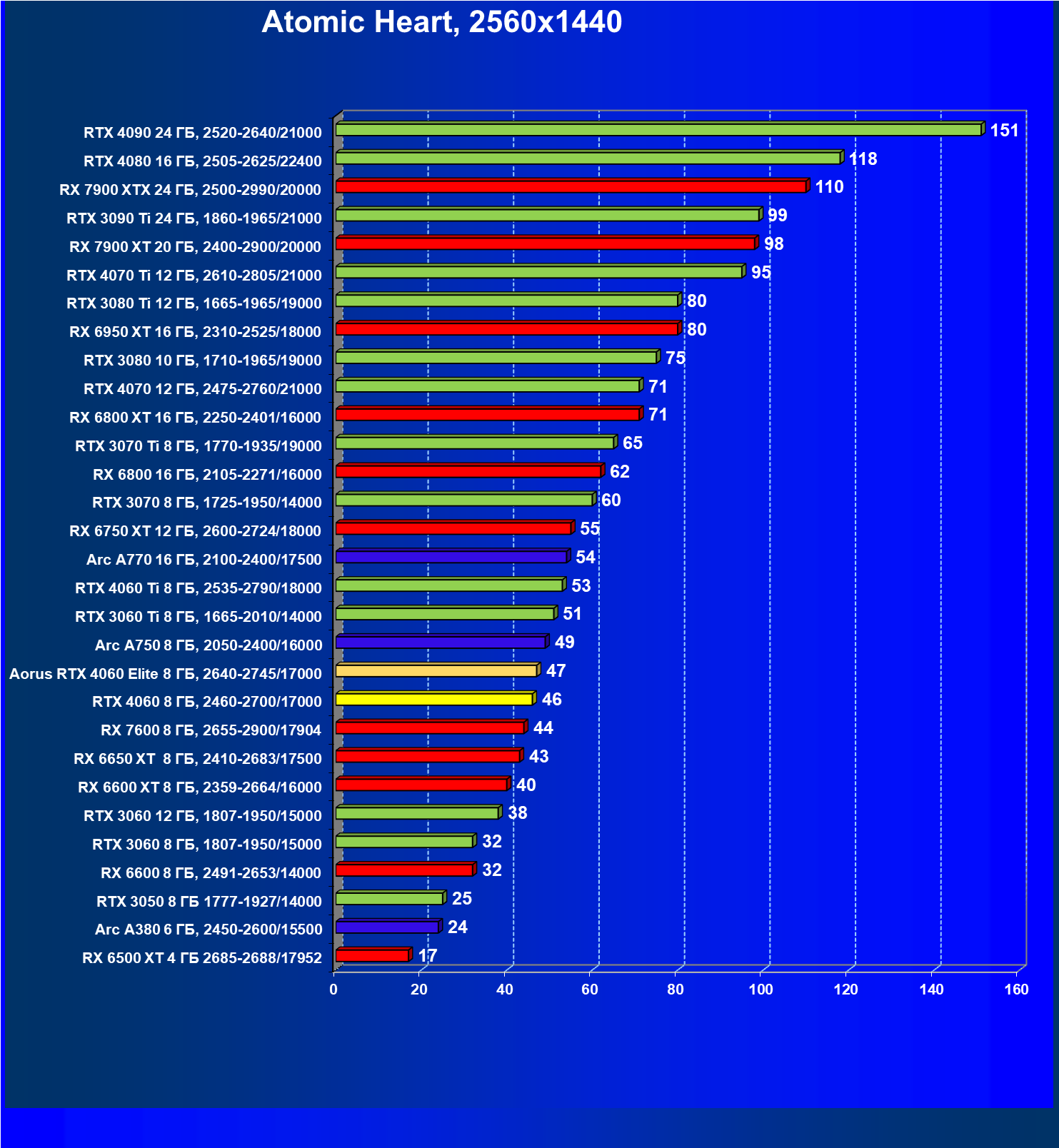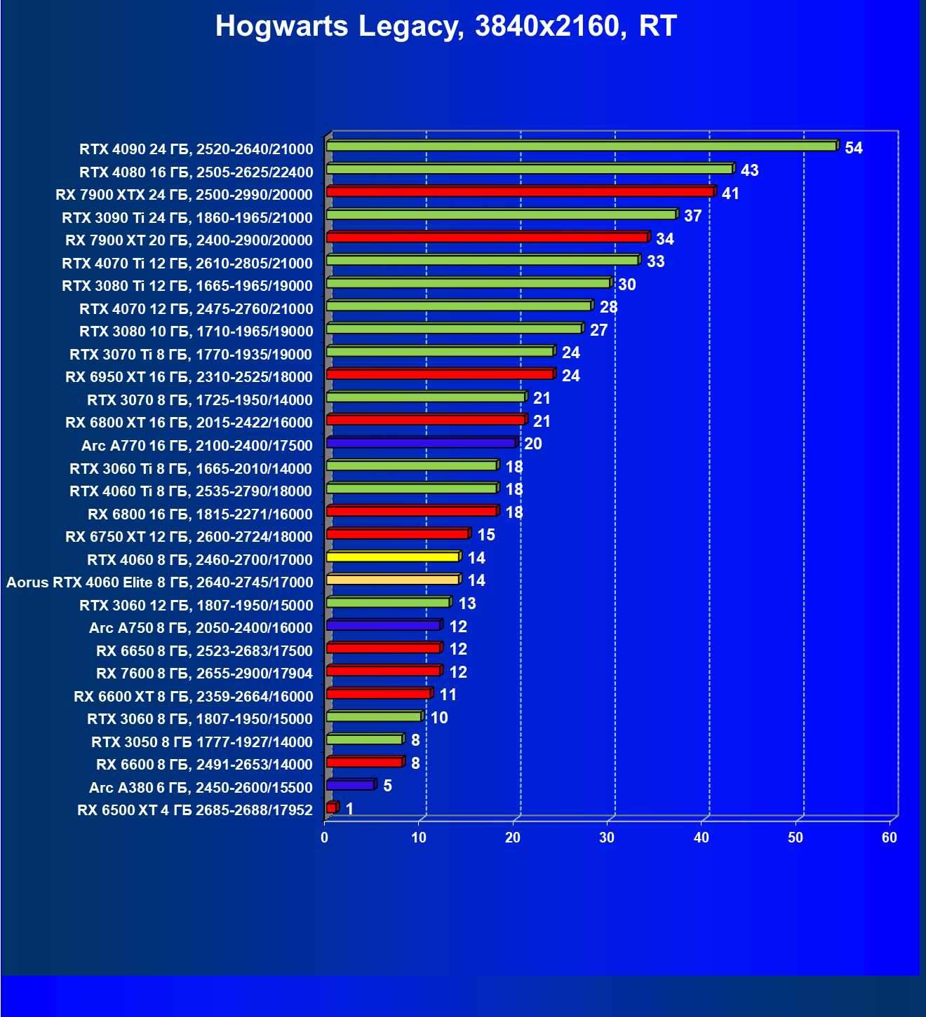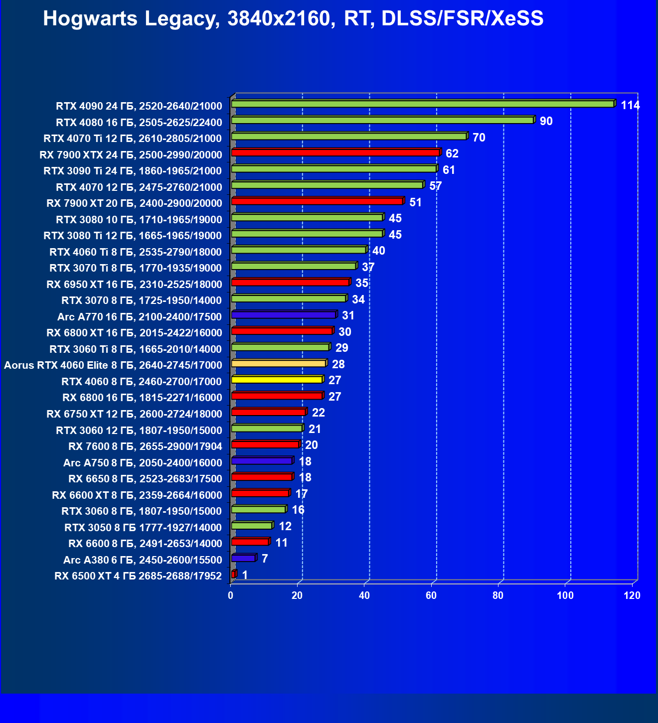 | 08 | Arc A770 16 ГБ, 2100—2400/17500 | 116 | 464 | 40 000 |