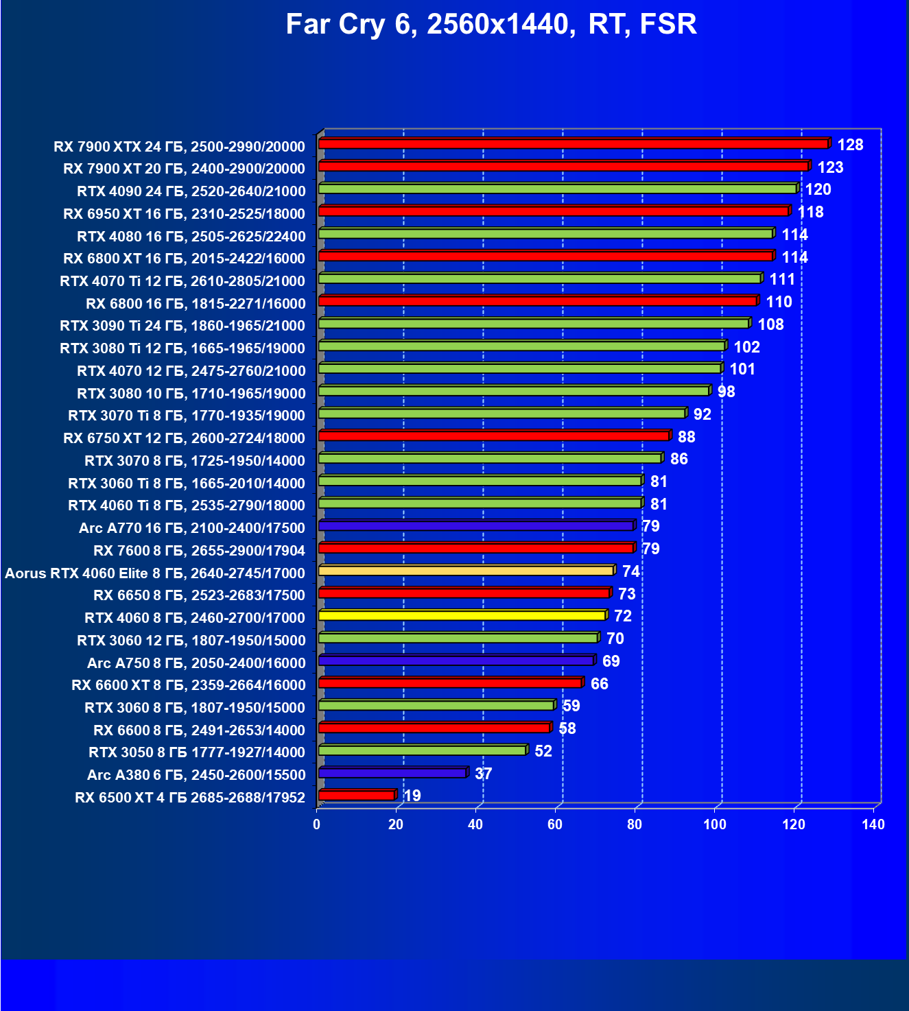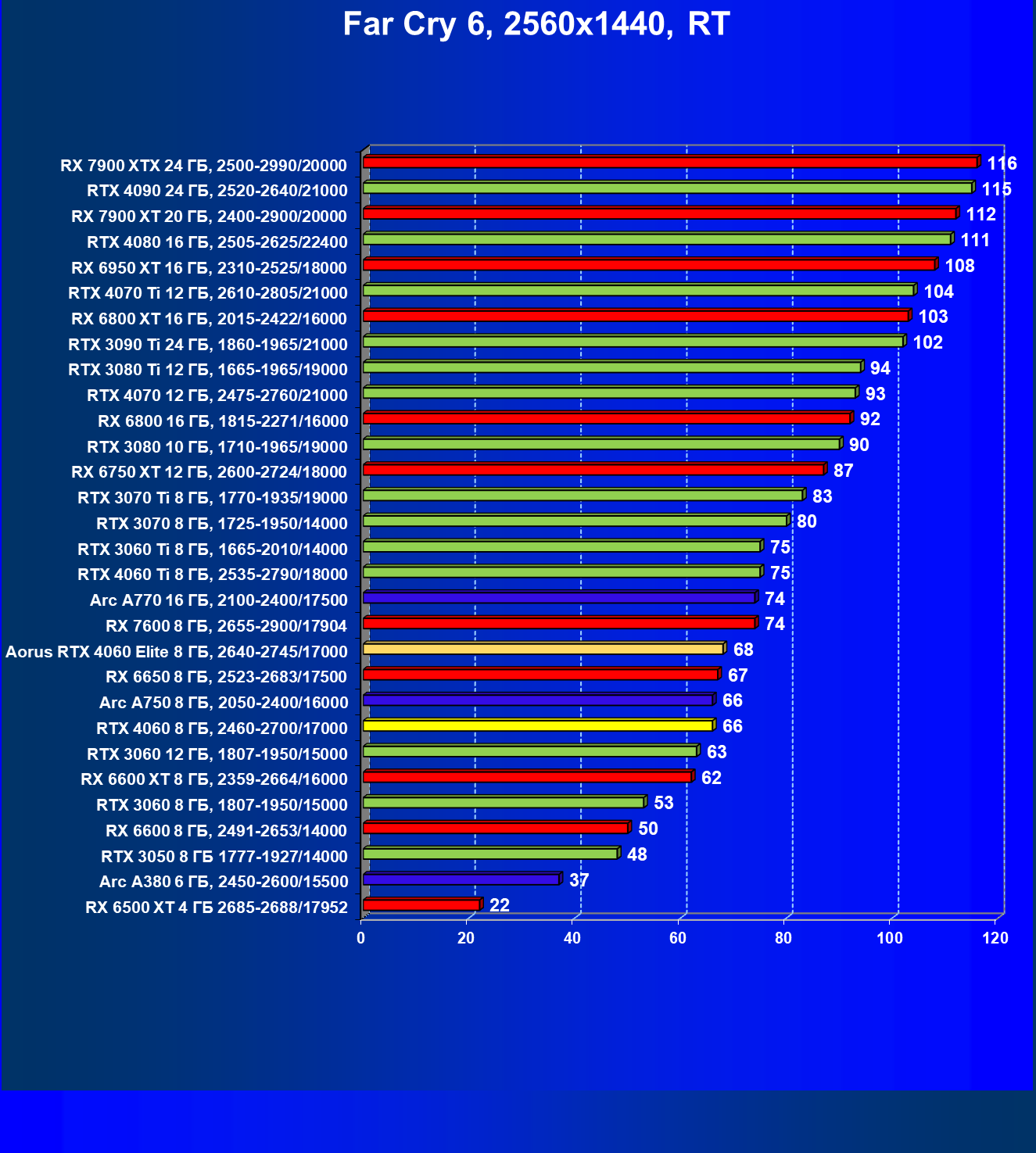 | 25 | RX 6600 XT 8 ГБ, 2359—2664/16000 | 321 | 111 | 29 000 |