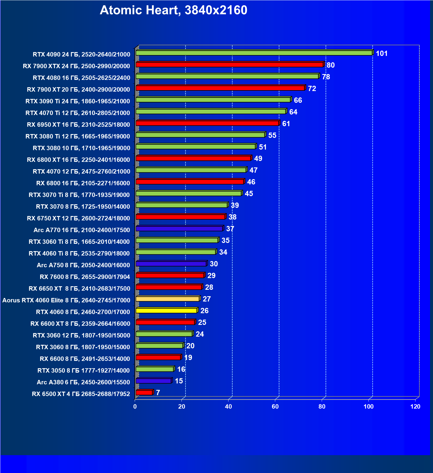 | 18 | Aorus RTX 4060 Elite 8 ГБ, 2640—2745/17000 | 450 | 105 | 43 000 |