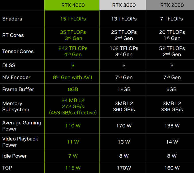 По словам Nvidia, поскольку самые популярные видеокарты в Steam — это GTX 1650, GTX 1060, RTX 3060, RTX 2060 и GTX 1050 Ti, а также учитывая, что 77% игроков используют разрешение Full HD или ниже, GeForce RTX 4060 может стать для них неплохим вариантом для обновления видеокарты за сумму порядка $300. Новая модель подойдет даже для довольно требовательных игр, а из ее главных преимуществ можно отметить поддержку DLSS 3, что позволяет улучшить плавность при игре.