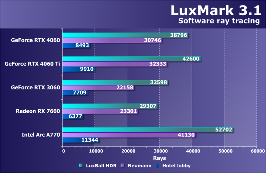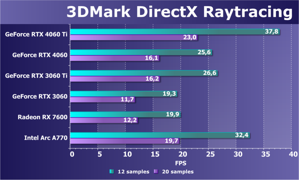 В классических играх без трассировки лучей GeForce RTX 4060 в среднем опередил GeForce RTX 3060 с 12 ГБ на 15%, а GeForce RTX 3060 с 8 ГБ — на 32% (еще раз отметим значительную разницу в производительности у двух вариантов GeForce RTX 3060, мы уже писали об этом в обзоре карты Palit). Прямой конкурент Radeon RX 7600 оказался чуть быстрее, а Arc A770 и вовсе на 17% превзошел GeForce RTX 4060. Вровень с последним идет Arc A750, который пока чуть дешевле.